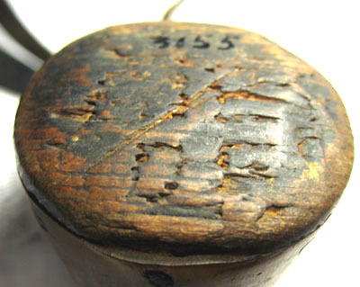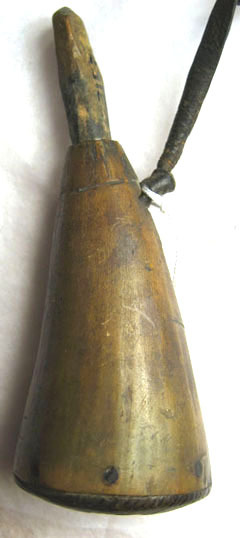 Kruthorn av ett koniskt stycke gulbrunt horn, enast lätt svängt med cirkulärt tvärsnitt. Upptill något tillskuren vid mynnigen och strax under denna åt ena sidan två tätt ställda hål med vägg mellan sig. Genom hålen en svart lädersnodd till kruttyget. Kork tillskuren i trä, l 43 mm. Nertill en svagt utåt välvd bottenplatta av brunfärgat trä, fäst genom hornets sidor med åtta svarta stift. På bottenplattan oläslig skrift av punkter, ägarinitialer?