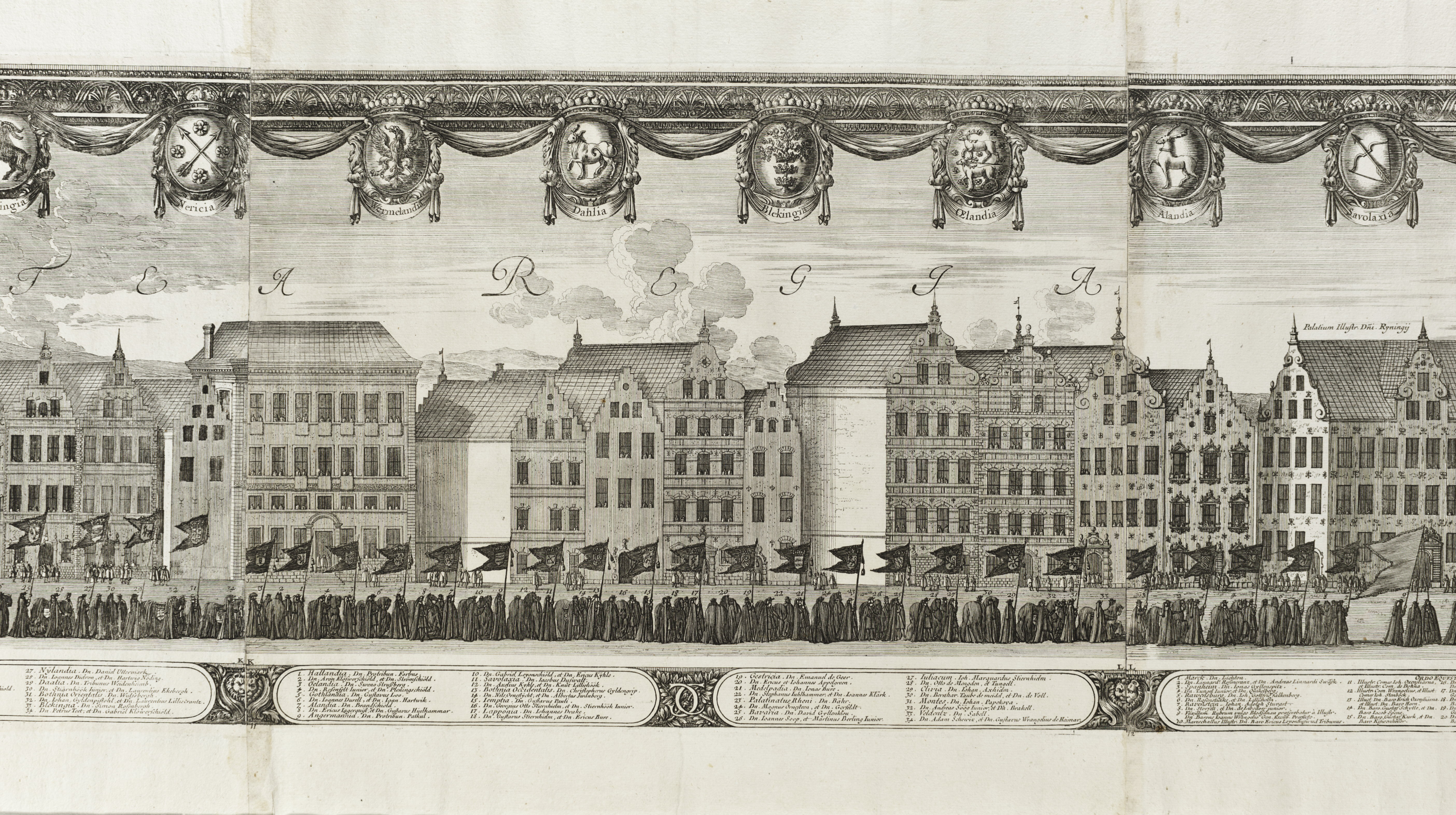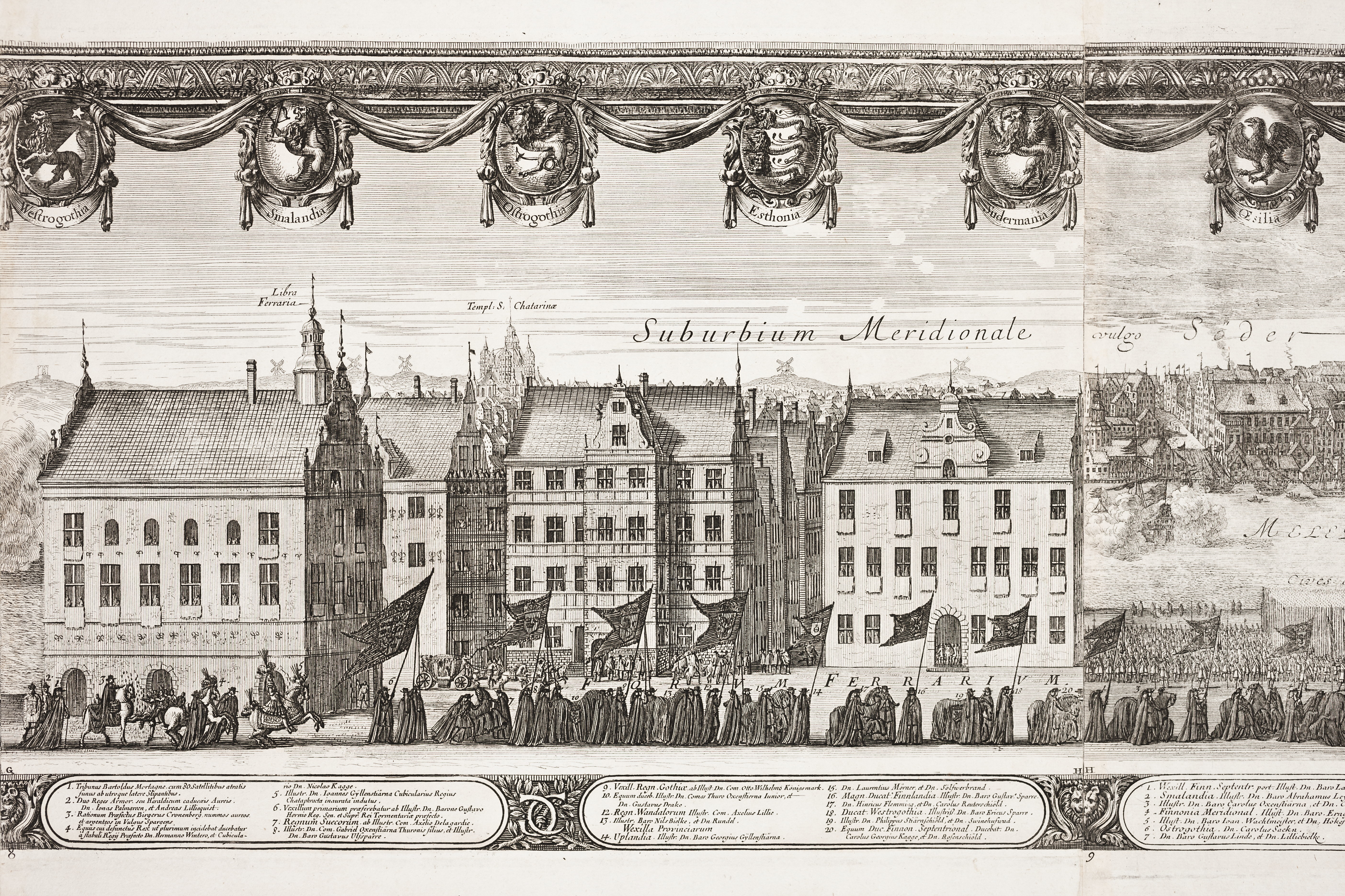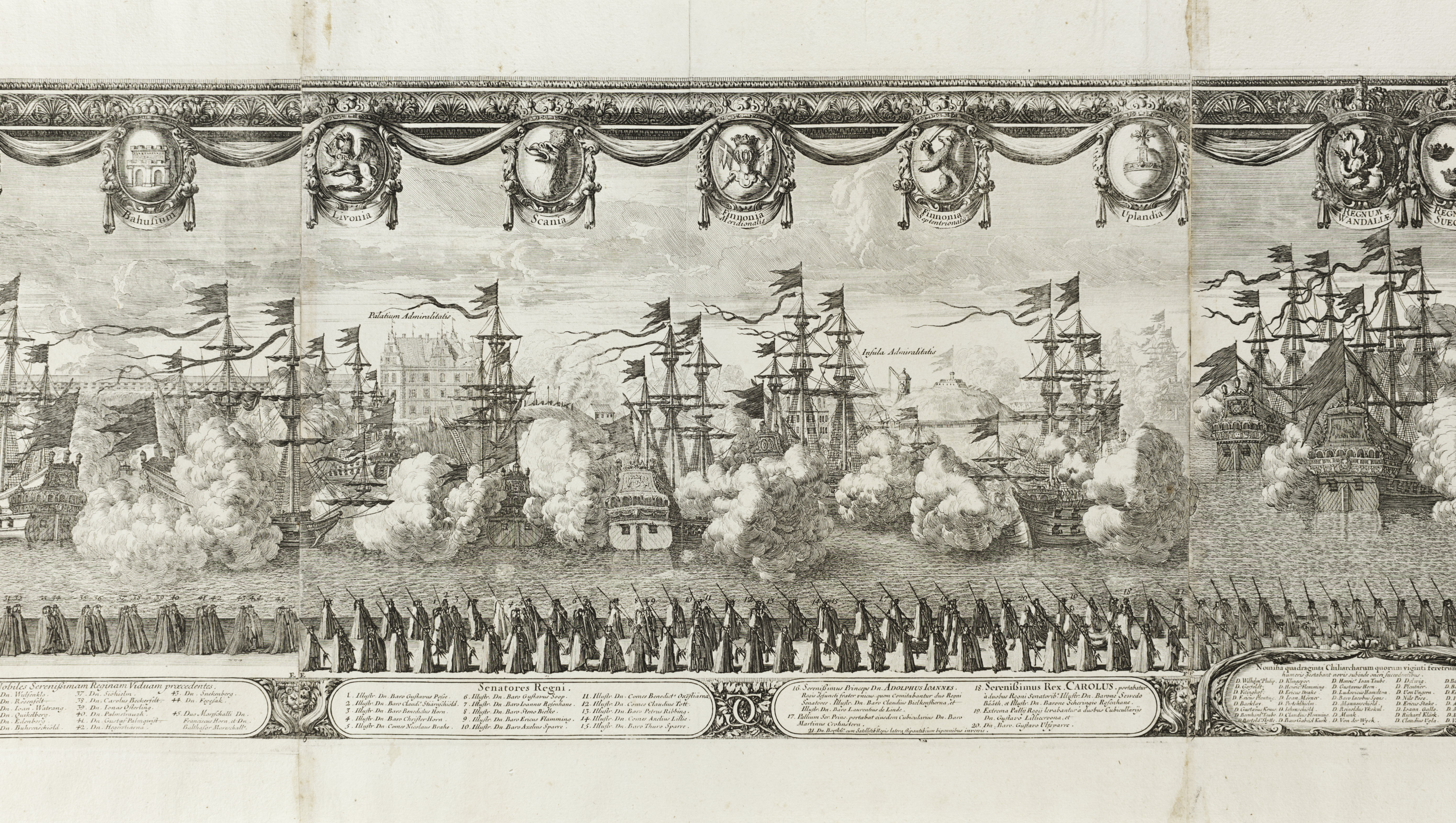 Kopparstick med motiv från Karl X Gustavs begravningståg den 4 november 1660, graverat av Jean Le Pautre efter teckning av Erik Dahlberg, Tryckt med flera olika plåtar på 13 ark papper som klistrats ihop till en sammanhängande bildrulle. Varje ark är numrerat nedtill i vänster hörn. På den ram som finns längs kopparstickets sidor och ovankant finns 58 svenska landskaps- och provinsvapen. På mitten i ovansidan finns det svenska riksvapnet, nedtill i mitten finns en kartusch med rubriken: