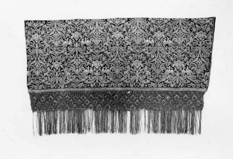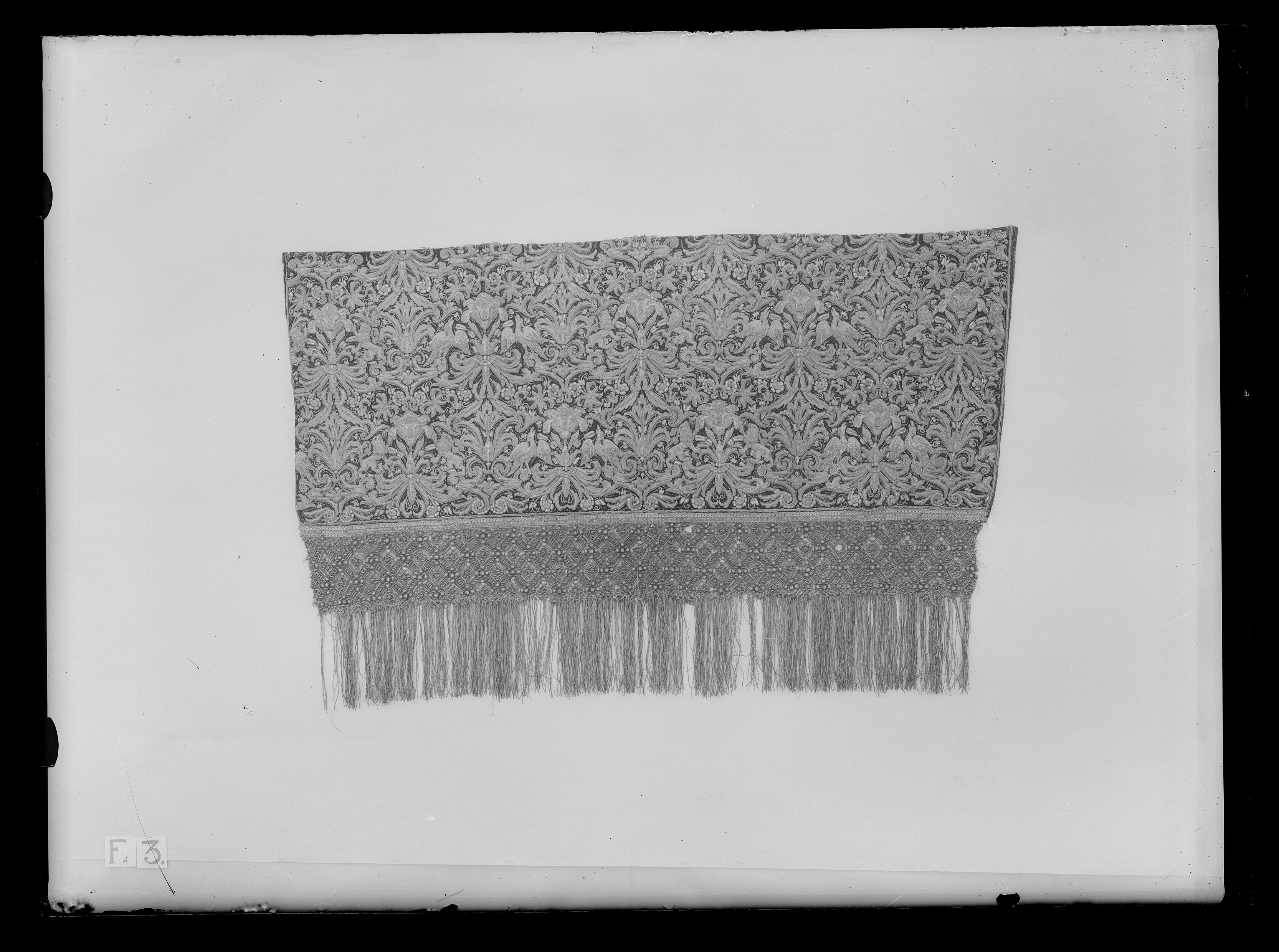 Bottentyg av röd sammet i kypert. Yttäckande broderi i läggsöm och applikation i relief av guld, silver och silke i gult och beige. Mönster av två omväxlande akantusmotiv, varannan akantus varannan gång symmetriskt omgiven av två örnar och varannan av två lejon med utsträckta tungor i rött silke liksom djurens ögon. Akantusmotivens höjd 200 mm ca, djurens höjd 80 mm ca. Längs sidorna och nederkanten en 3 mm bred snodd omgiven av två 1 mm breda snoddar. Nedanför broderiet ett knutet snörmakeriarbete, makramé, av guld och silver 150 mm brett varav 20 mm stad med två 2,5 mm breda silverlan och på mitten en 2 mm bred silverlan. Rombiskt mönster med breda kantiljer, lan och svarvade kulor av trä virade med silverlan. Nedanför smörmakeriarbetet en 170 mm bred frans av guld och silver. Foder av röd yllekypert. Fyra lädertampar med mässingsringar längs överkanten.