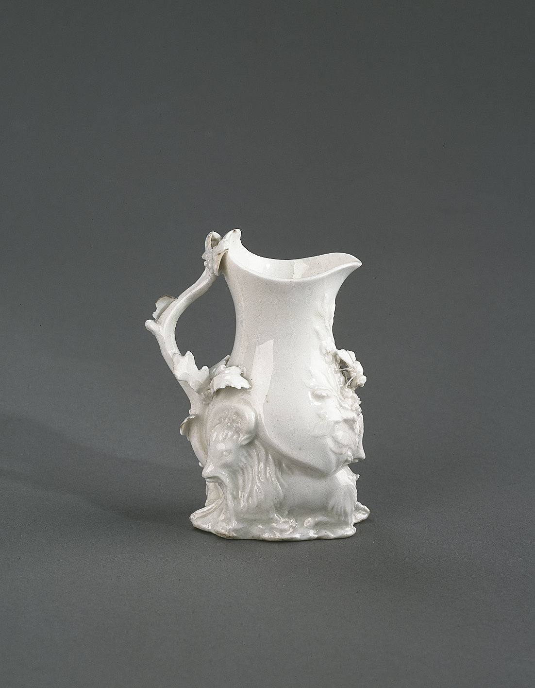 GRÄDDKANNA av mjukt porslin med utsvängd mynning samt snås; nedre delen i form av två liggande getter vända åt varsitt håll. Henkel i form av en böjd trädgren med löv. Under snåsen i relief en buskliknande växt med blommor; vid en av dessa ett pålagt bi. Omålad. Från mitten av 1740-talet. Föremålet är ett av de tidigast utförda vid denna fabrik. Fabriken troligen grundlagd kort före 1745. 1769 såldes den och ett år senare kom den i William Duesburys ägo som drev den vid sidan av Derby till 1784 då verkstäder och formar förstördes och återstoden flyttades till Derby.