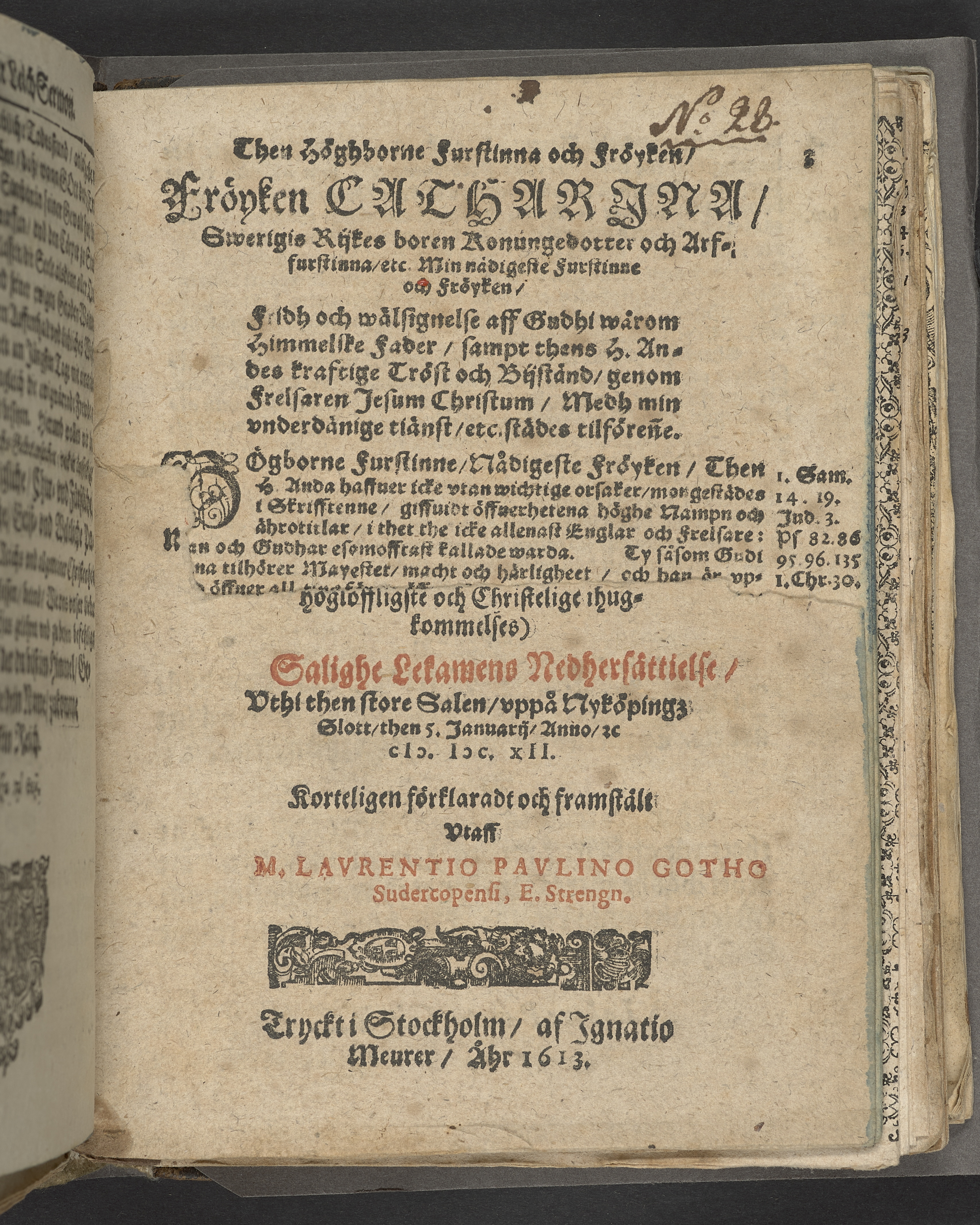 [Iosiæ then femptonde Iuda konungz historia, vthi... Carls thens IX.des]... salighe lekamens Nedhersättielse... vppå Nyköpingz slott, then 5 Januarij, anno ec. MDCXII... Framstält vtaff M. Lavrentio Pavlino Gotho... Tryckt i Stockholm, af Ignatio Meurer, åhr 1613.