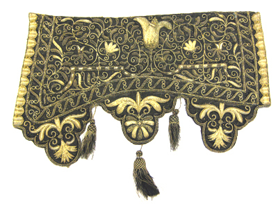 Ett stort stycke som brukas öfwer hästländen, alt öfwer brodderat med Dito Frantsar omkring, samt 16 sty Qwastar där uppå behåldne.
