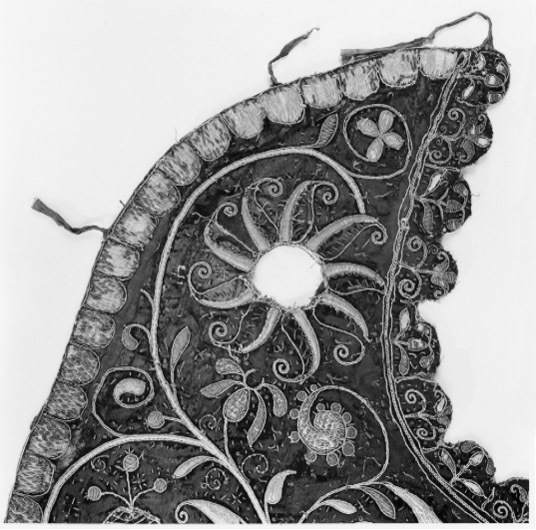 Små snedställda "löv" (mandelformiga med tegelrött silke (otvinnat) varver breda silverlan lagts glest och silverkantilj och lan bildar inre kontur och en yttre vågig kontur bildas av silverkantilj av ten.