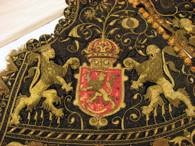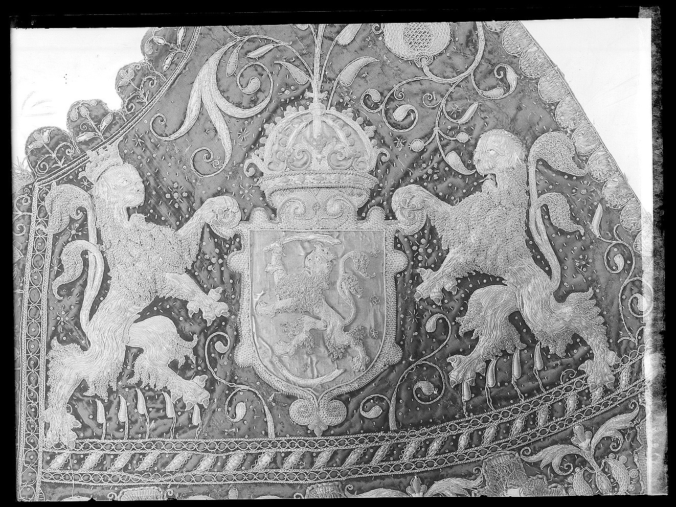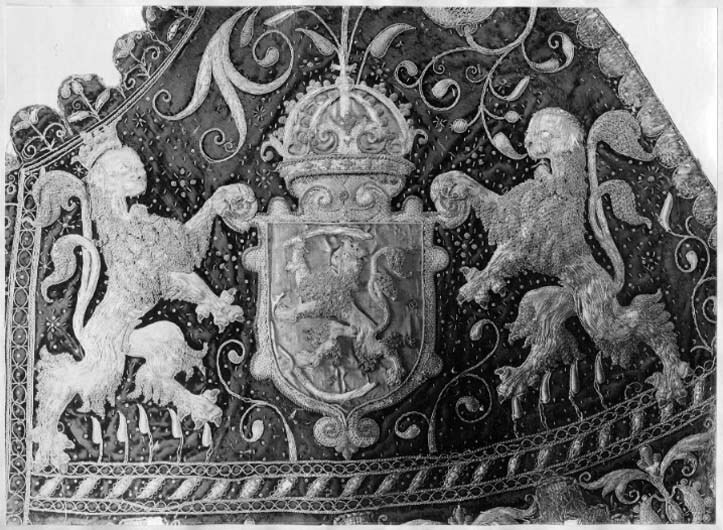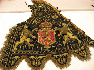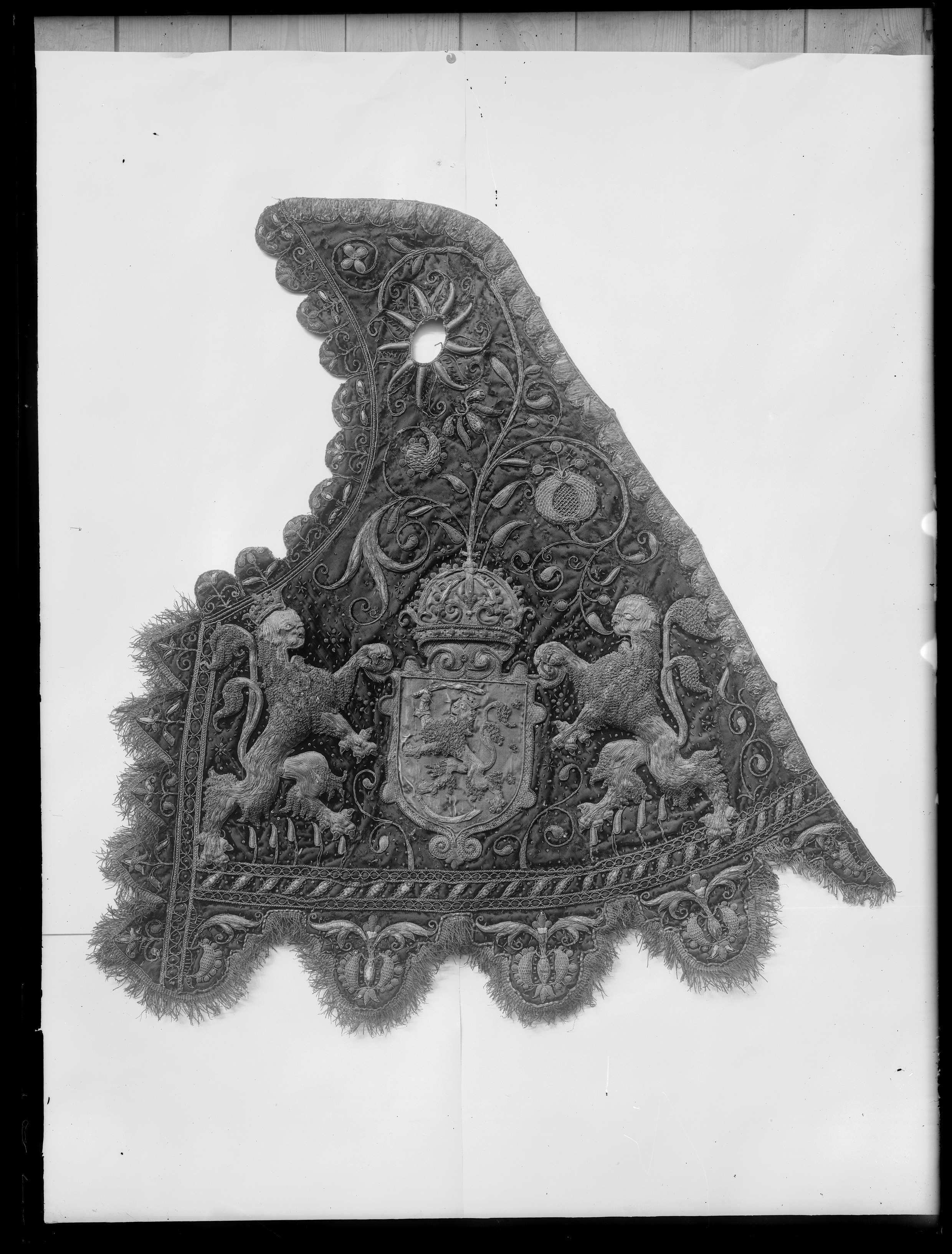 Ett Stort Stycke äfwer Hästländerne på ena sidan broderadt Ett Sweriges Wapen af Tre Kronor ochpå andra Sidan Ett Dito Rikes Wapen af Lejon på blått Atlast och med Guldfrantsar runt omking samma Täcke; Härå finnes allenast Elfva stycken Qvastar af Guld och svart Silke behållne, de Trenne stycken Qvastar som felar, finnes efter förra Inventarii innehåll vara förkomne.