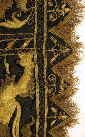 Broderiet uppvisar div. varierande snodder, kantiljer och metalltrådsbroderier. Sålunda bildas bandlika våder som inramar figurmotiven av snodder och V-tvin guldlan - kedjor o guldtråd över gult silke och med glesa öglor lagda över röd silkeskärna, överdragen med silverlan åt v varöver tunn silverten tvinnats åt höger.