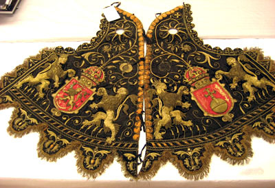 En Halskappa med smala Gull Frantsar omkring och åtta st behåldne Qwastar uppå af Gull och Swart Silcke, på berörde Hallskappa äro på den ena Sidan brodderat ett Upplands Wapn på rödt Atlask, men på den andra sidan ett Leijon Wapen på rödt Atlask, Kronorna(?) på de 2ne af största Leijonen finnes afstötte och förkommne som förre Inwentario Folio 22 förmäler.