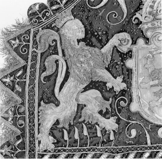 Det stora v lejonet har sin öppna krona på nacken, h: 295 mm, b 200 mm, dubbelsvansat. Hög relief över gul sidenrips är guldbroderiet utfört. Den långsträckta kroppen har medfört att silket som hållit de stända guldtrådarna rämnat, ca 20 trådar (H tvin guldlan / cm i bredd. Man o tofasr är krusigt lagd guldtråd (H tvin med guldlan) överdragen med H tvin silverten. Konturen lagd med 1 mm bred V-tvin guldsnodd. Klor av svart silke som försetts med V-tvin silverten.