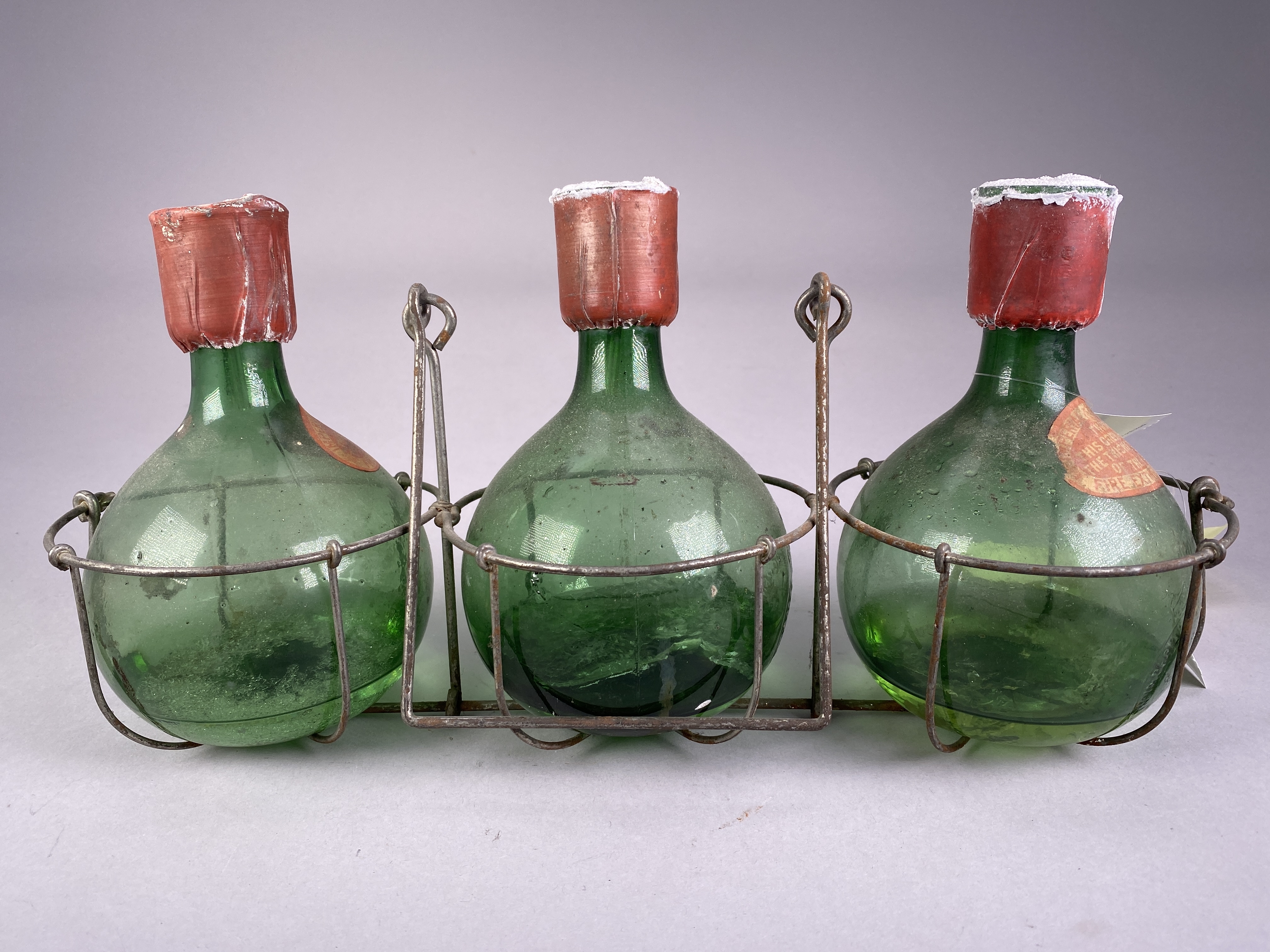 Tre runda glasbehållare med okänd vätska i. Enligt gamla samlingslista står det syrabehållare?. Anvisningar på glasbehållare säger: "Kasta denna granat mot den tjockaste delen av elden". Brandutrustning?