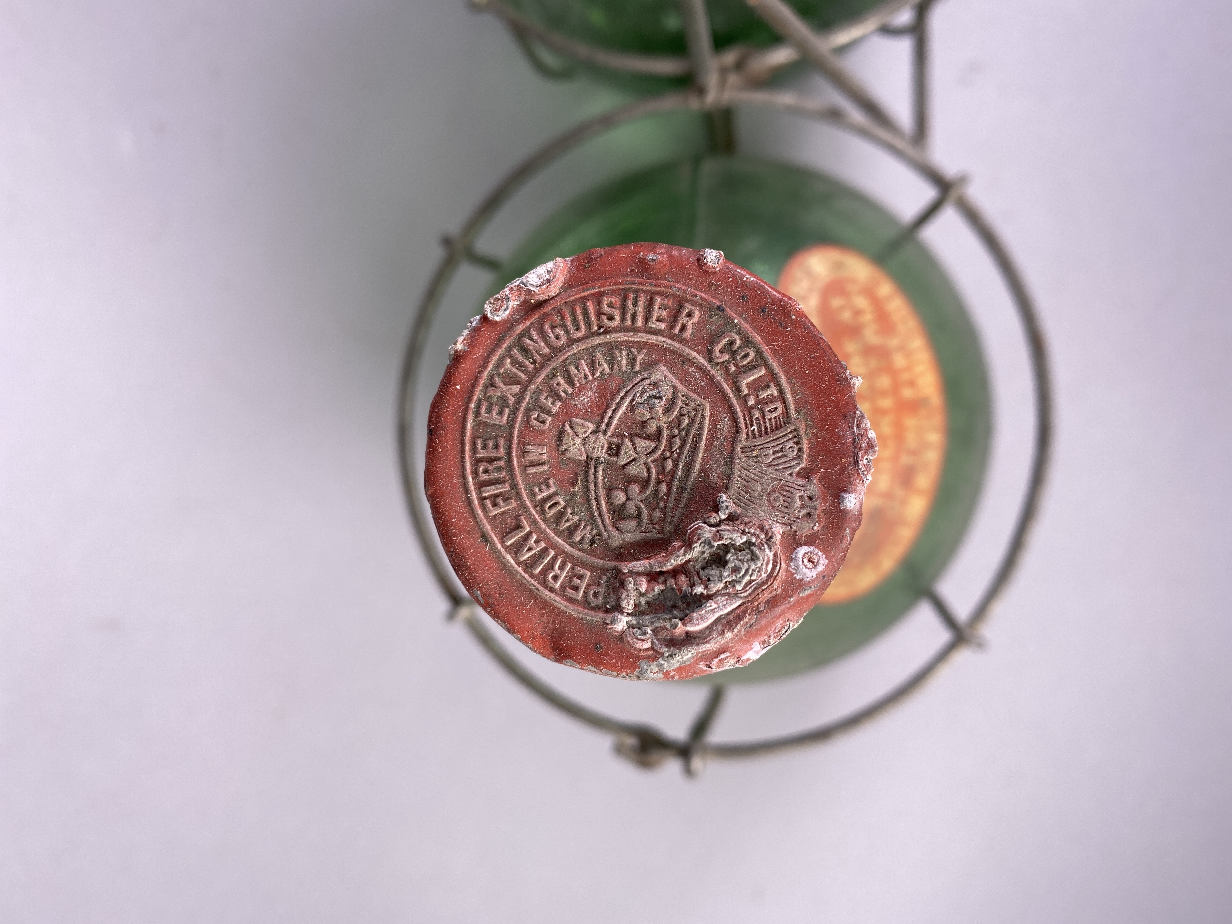 Brandsläckare av märket The Imperial Grenade. Tre runda behållare tillverkade i grönt glas, innehållandes delvis kristalliserad klar vätska. Behållarna överst förslutna med korkar omslutna av rött vax. Korkarnas ovansida med sigillstämpel föreställande krona omgiven av texten: "IMPERIAL FIRE EXTINGUISHER C&L TD MADE IN GERMANY". Behållarna placerade i ställning av metall, uppbyggd av tre korgar med ett handtag i mitten. The Imperial Grenade producerades under sekelskiftet 1800-1900. De förvarades i hemmet och skulle vid brand slängas som en granat in i elden så glasbehållaren krossades. De tidiga varianterna var fyllda med saltvatten, då saltvatten har en lägre fryspunkt än sötvatten. Senare kom behållarna att fyllas med vätskan koltetraklorid, som vid upphettning bildar en gas med högre densitet än luft och därmed kan användas för kvävning av eld. Koltetraklorid kom dock med tiden visa sig både giftig och miljöfarlig, vilket har lett till minskad användning.