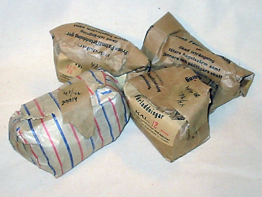 Fyra bruna papperspåsar innehållandes förladdingar, varav tre är identiska med nnr: 29915, den fjärde i samma storlek är brun med blåa och röda vertikala ränder. Alla påsar är öppnade och halvfulla, sedan förslutna med en klisterremsa.