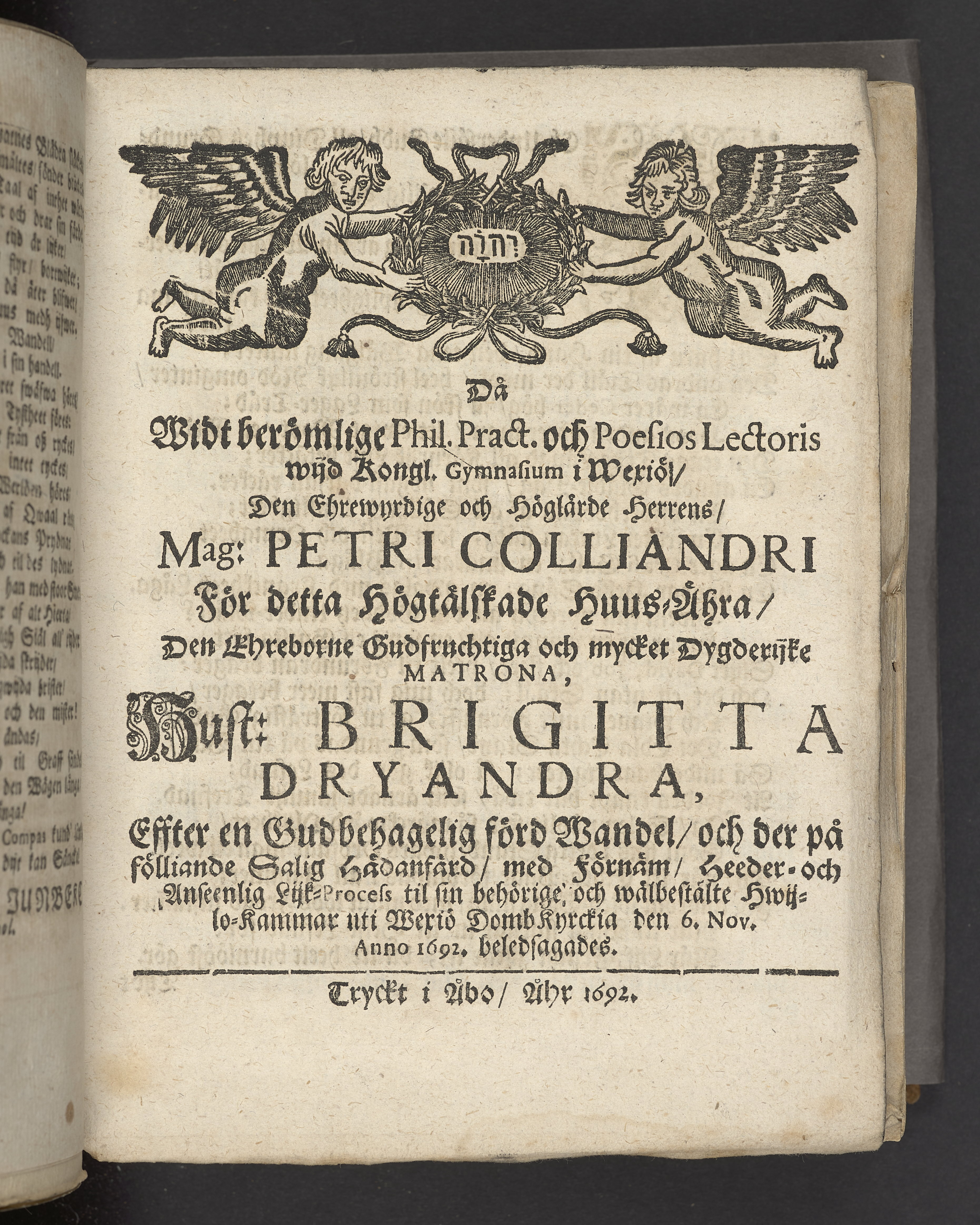 Då ... mag: Petri Colliandri ... huusähra ... hust: Brigitta Dryandra ... til sin ... hwijlo-kammar uti Wexiö domb kyrckia den 6 nov. anno 1692. beledsagades. Tryckt i Åbo, åhr 1692.