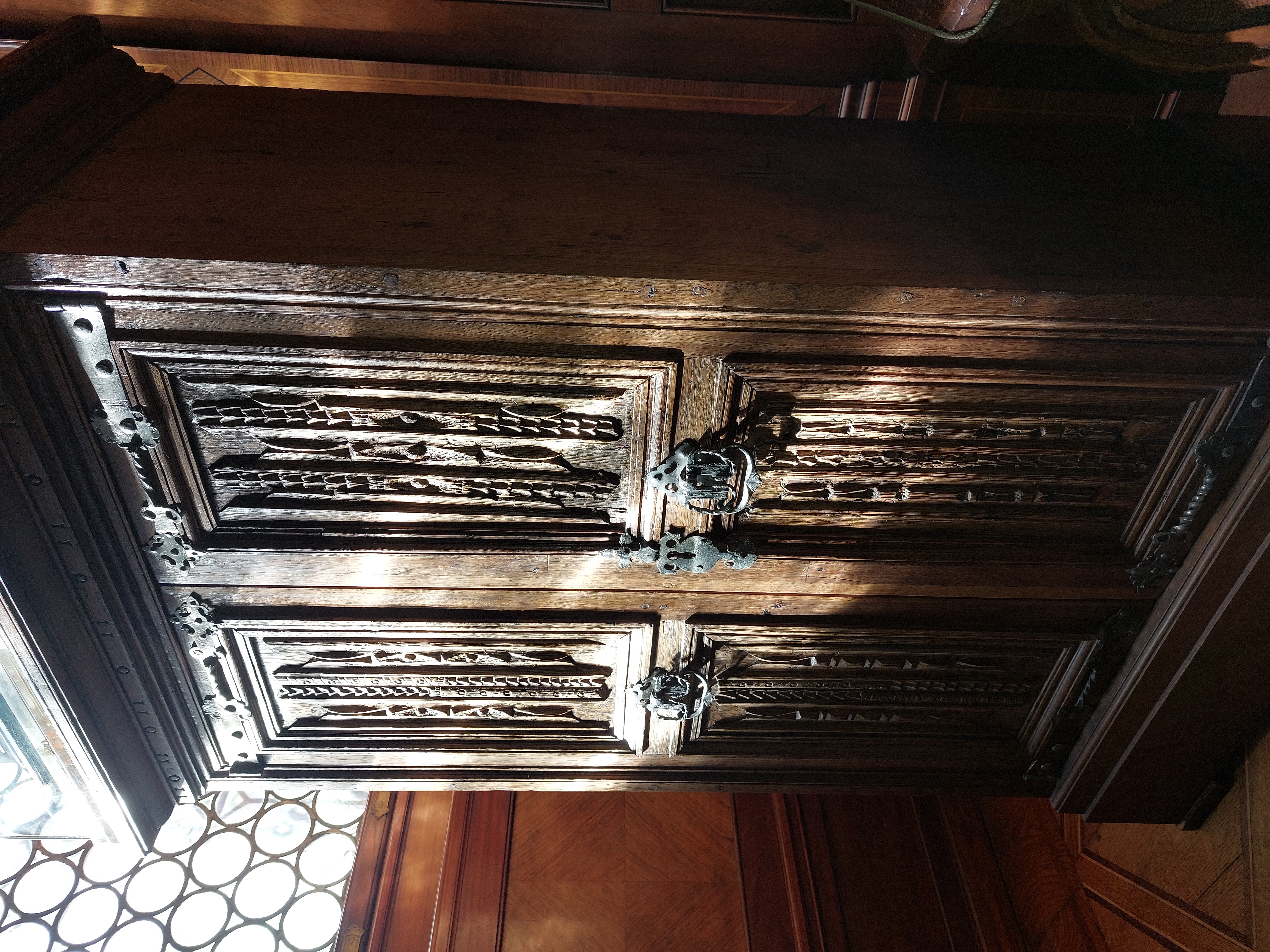 - Af ek, med beslag af förtent järn. Stående afiångt, med raka former samt två dörrar; på låg sockel. Delvis snidadt i relief samt bonadt. Hvardera dörren med ram och två stående rektangulära fyllningar samt på utanpå-liggande långa bladgångjärn. Å fyllningarna längdgående sengotiska ornerade stafvar och rullar (s. k. pergaments-ornament). Å vänstra dörrens fyllningar i midten två i bredd liggande längdgående stafvar i två afdelningar. Vänstra stafven: nedre delen med ett i spiralform gående band, bil-dadt af små prickar mellan två smala ränder, mellan hvarfven en insänkt rund knopp; öfre deien med ett tvåradigt fjällmönster, i ena raden fjällen uppåt, i den andra nedåt. Högra stafven med dylik dekor men i omvänd ordning. På ömse sidor om staf-varna en rulle, i hvars midt å öfre fyllningen två rombiska fördjupningar, i dessas midt mot prickerad botten en rund knopp; å den nedre tre tvärgående kvaderlik-nande ryggar. Å högra dörrens fyllningar: Den öfre i midten med en rulle som de å vänstra dörrens öfre fyllning men med endast en fördjupning, på ömse sidor en staf i fjäll-mönster, i hvars midt en fördjupning som å midtrullen samt med fjällen vända från midten; vid yttersidorna en ornerad halfrulle. Nedre fyllningen med två rullar som å vänstra dörren, mellan dessa en staf som de förra. Kring hvardera fyllningen en profilerad list. Ramar släta. Beslag: Gångjärnsbladen vid inre ändan med en slät, något kilformig del, vid hvars ytterända en rund bladliknande utvidgning med konturerad kant och genombruten vid innerkanten af två runda hål, i midten ett spiralvridet mellanstycke, vid dettas yttre ända en kort slät del med ett rundadt utsprång vid hvardera kanten, genombrutet af ett rundt hål, ytterst en rutformig utvidgning, genombruten af fyra njurformiga hål samt i hörnen med en liten rund buckla. Hvartdera bladet fast med fyra spikar med kullriga hufvuden, tre större i inre delen och en i ytterändans midt. Å hvardera dörrens mellersta ramstycke ett genombrutet handtag, bestående af två parallella aflånga skifvor med stansade linjeorneringar samt upptill förenade genom en kort rund hals, nedtill genom en bred båge, utgående från ytterkanterna; i bågens midt en långsträckt utvidgning med ett bladliknande ornament; upptill från hvardera skif-vans ytterkant utgående en nedåt omböjd spiralvriden båge med ytterändan afslutad i en profilerad knopp. Handtaget Kortsidor släta. Sockel (ej original): Med släta sidor; upptill en indragen platta, å hvars öfverkant en ingripen staf. Under sockeln i hvarje hörn en fyrsidig fotplatta. Upptill å skåpet ett utstående listverk (ej original); å näst nedersta profilen två och två tvärgående fördjupningar, mellan dessa en insänkt knopp. Rygg af ek med stående trä. Dörrarnas insidor med släta ramar och fyllningar, å den högra ett lås med utanpå-liggande mekanism, å den vänstra en märla. Skåpet inuti med fyra hyllor af ek, å den andra nedifrån en kasthake, afpassad för märlan i dörren. Höjd: 1.245 m.; bredd: 0.765 m.; djup: 0.445 m. Nyckel: Af förtent järn, med nästan rund ögla; upptill å pipan en grof muff, öfver denna en i öglan inskjutande spetsig flik. Längd: 8 cm.; bredd: 3.5 cm. Tyskt arbete från 1500-talets förra hälft. Inköpt af Wilhelmina von Hallwyl, f. Kempe, från antikvitetshandlaren Ed. Kahlert, n. d. kaiserl. Post, Eisenach, Tyskland. Ankom omkring 1 April 1892, se Hushållsbok (här uppfördt på Mars 1892). Betaldt 7 April 1892. Pris: Mk 50, se Hushållsbok. Repareradt hos snickaren C. H. Benckert J:r, Regeringsgatan 63, Stockholm, se räkning 7 Juli 1892. Betaldt 21 Juli 1892, se Rescontra (Walther von Hallwyl). Pris: Kr. 130, se räkning. Ånyo repareradt hos snickaren C. H. Benckert J:r, Regeringsgatan 63, Stockholm, se räkning 30 Maj 1894. Betaldt 21 Juni 1894, se Rescontra (Walther von Hallwyl). Pris: Kr. 36, se räkning.