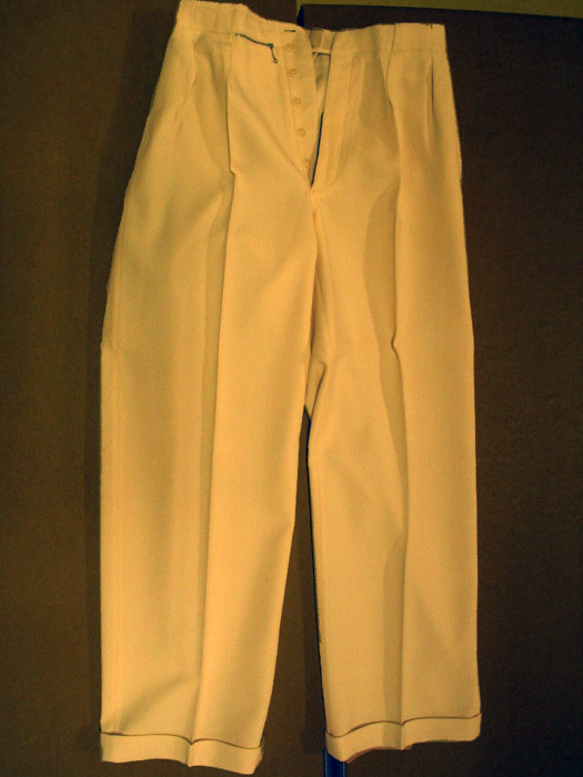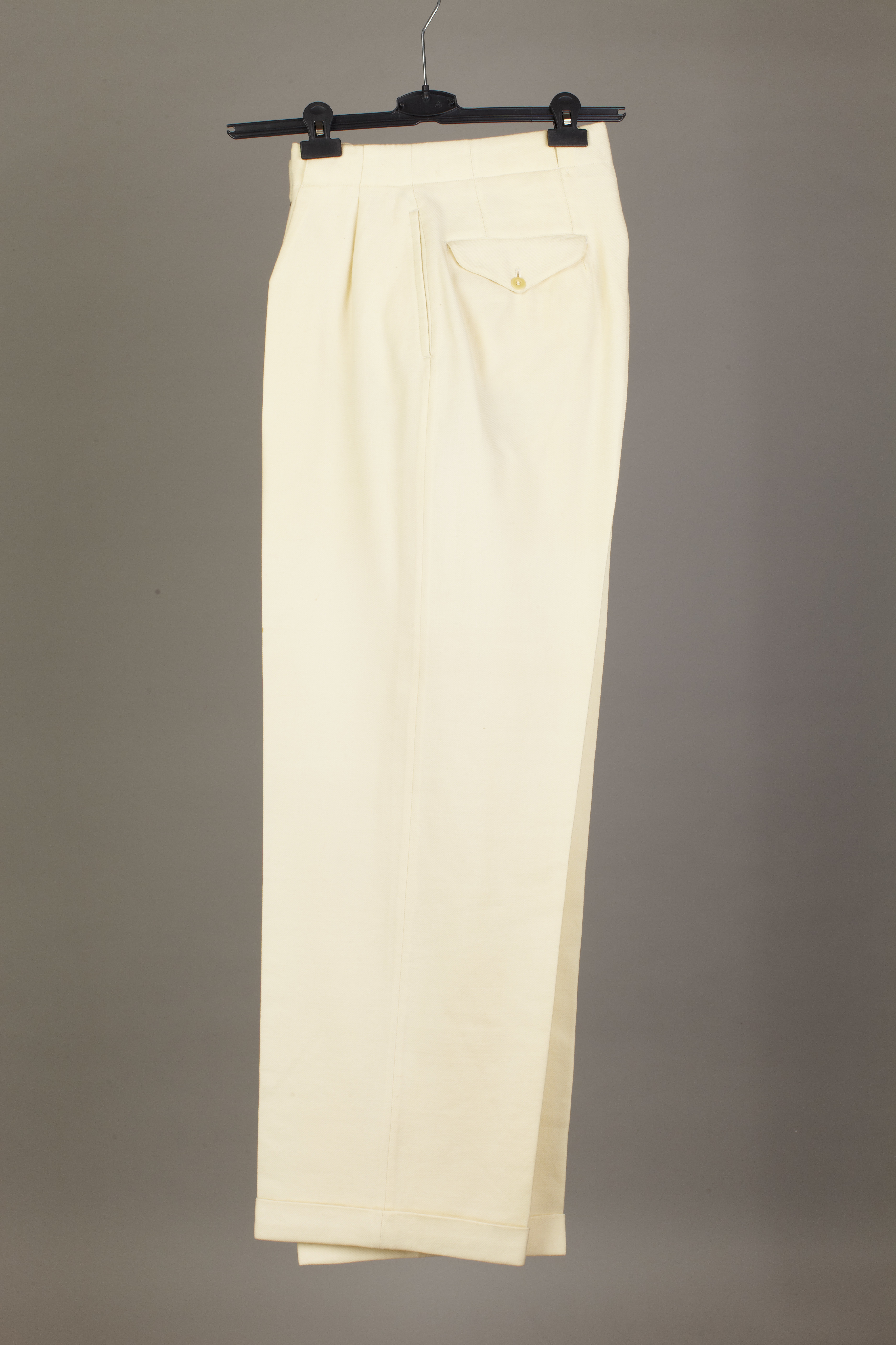 Långbyxor av ljusgul yllediagonal. Knäppning i gylfen med fen ljusgula knappar, diam: 15 mm. Linningen knäppes med en gul knapp, diam: 18 mm. Två knappar i vardera sidan av linningen samt två bak för fästande av hängslen, ljusgula, diam: 17 mm. Sidsömsfickor samt bakfickor med lock vilka knäppes med ljusgul knapp, diam: 14 mm. Dessutom en liten stolpficka i höger sida, vid linningen, vilken slutes med blixtlås. Raka ben med slag. Byxorna fodrade endast i linningen med vitt ylletyg. Fickorna sydda i samma material. I linningen en etikett med tillverkarens namn: " HJ. SÖDERBERG // UPPSALA, den .... 1936 // Herr prins Gustaf Adolf ".