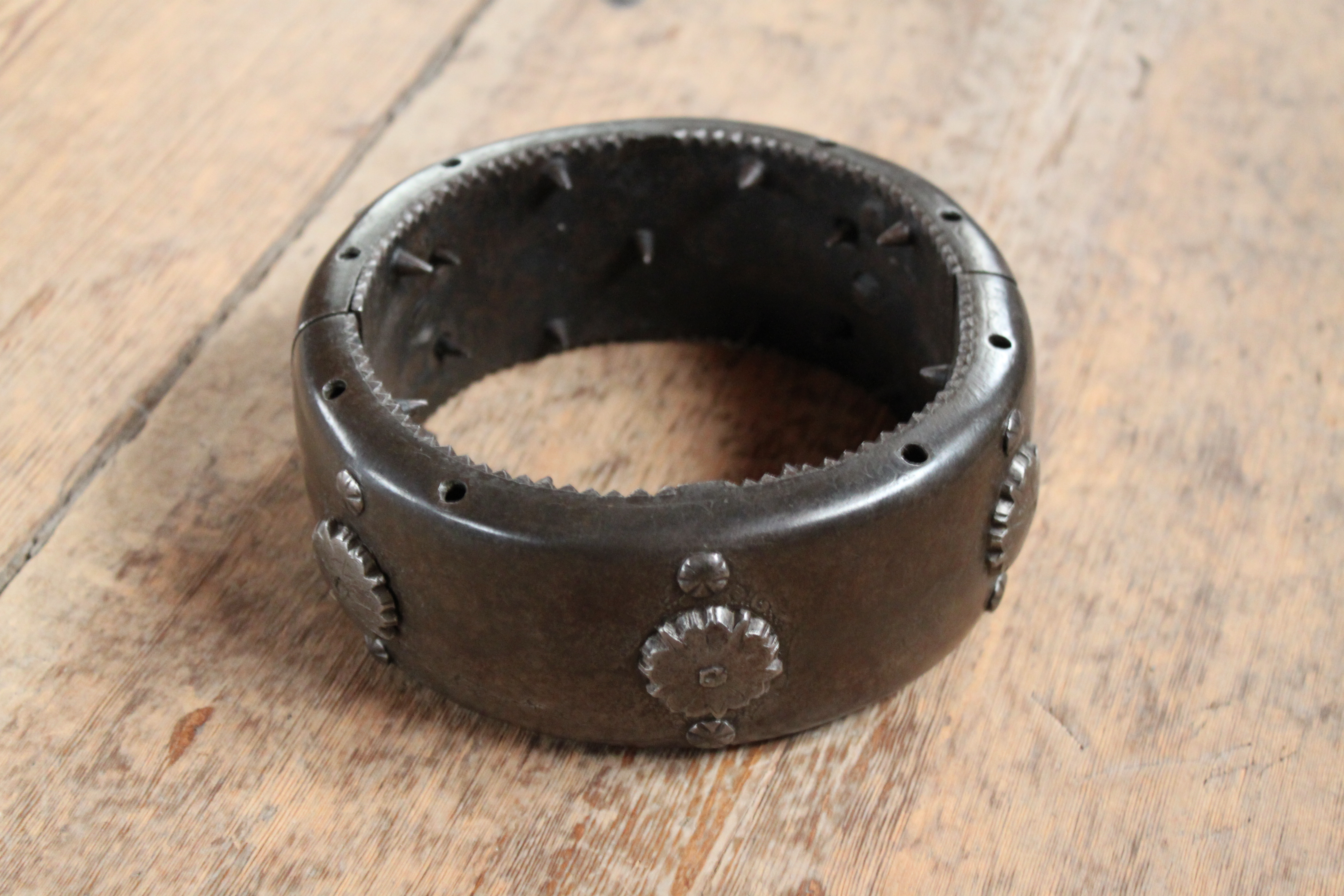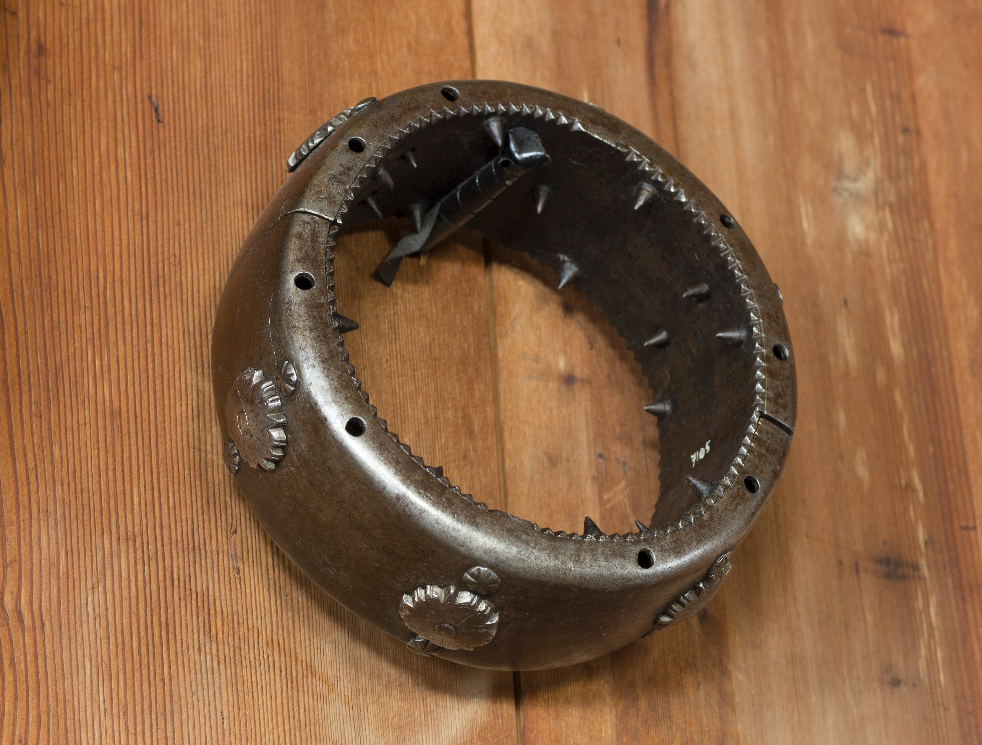 Halsring av stål, svartmålad. Bestående av två halvor, förenade genom gångjärn. Vertikalt genom kragen är åtta hål borrade. Någon slags nyckel eller järnten har ursprungligen tillhört kragen - låsanordningen öppnas då man trycker med någon syl i hålet närmast. Invändigt är kragen försedd med 18 fastlödda taggar + 4 på vardera kraghalvan, grupperade två och två intill kragens skarvar, vilka kan tryckas in och hållas i detta läge genom att en ten stickes ner i närmaste hål. På kragens utsida sex nitar med stora uddiga huvuden, varje sådan nit omgiven av två mindre. Insidan med en tandad kant upptill och nertill. Enligt 1710 års inventarium p. 72, rum III: "1 Tursk Halsband af Jern med taggar inuthi, som de bruka på Christna fångar".