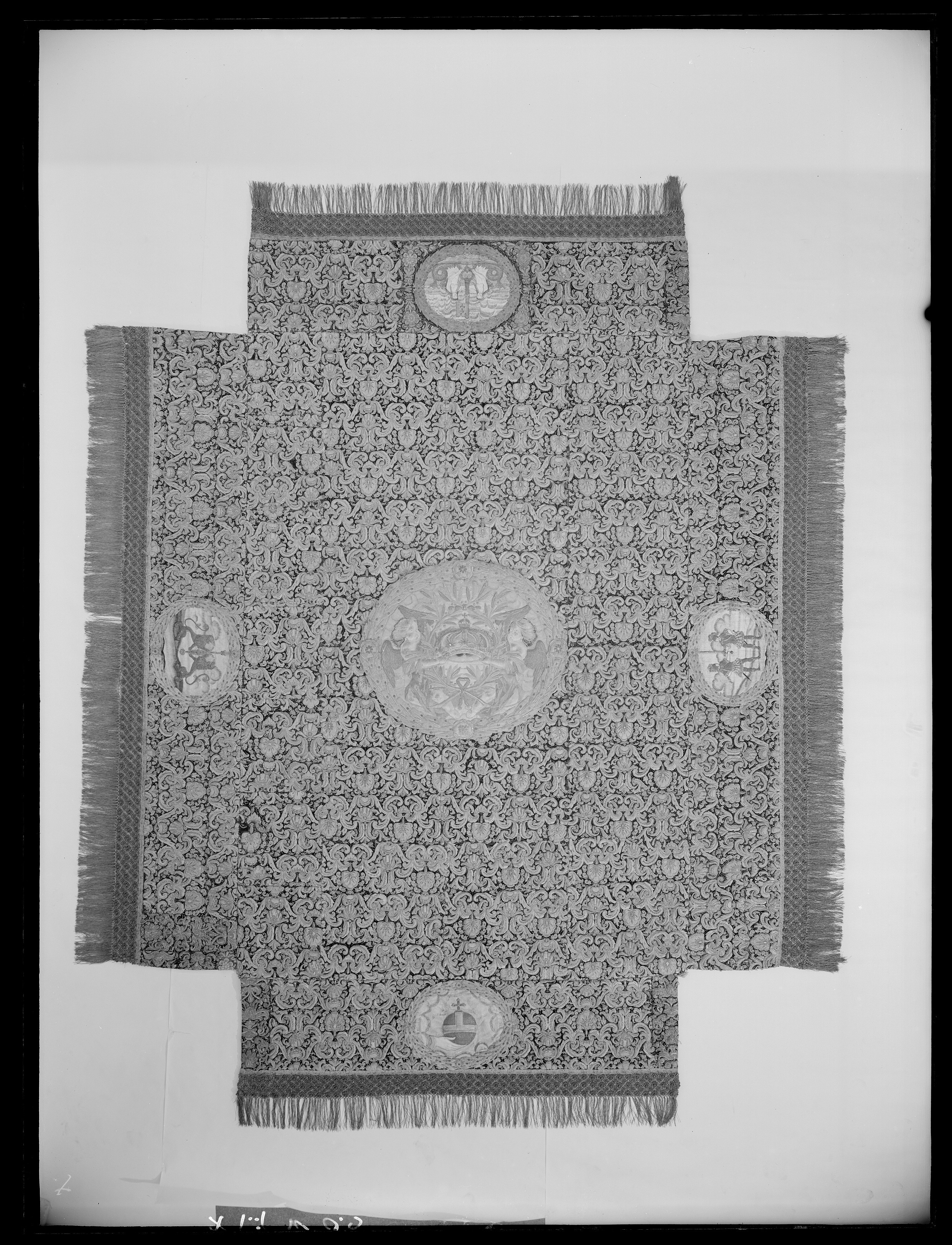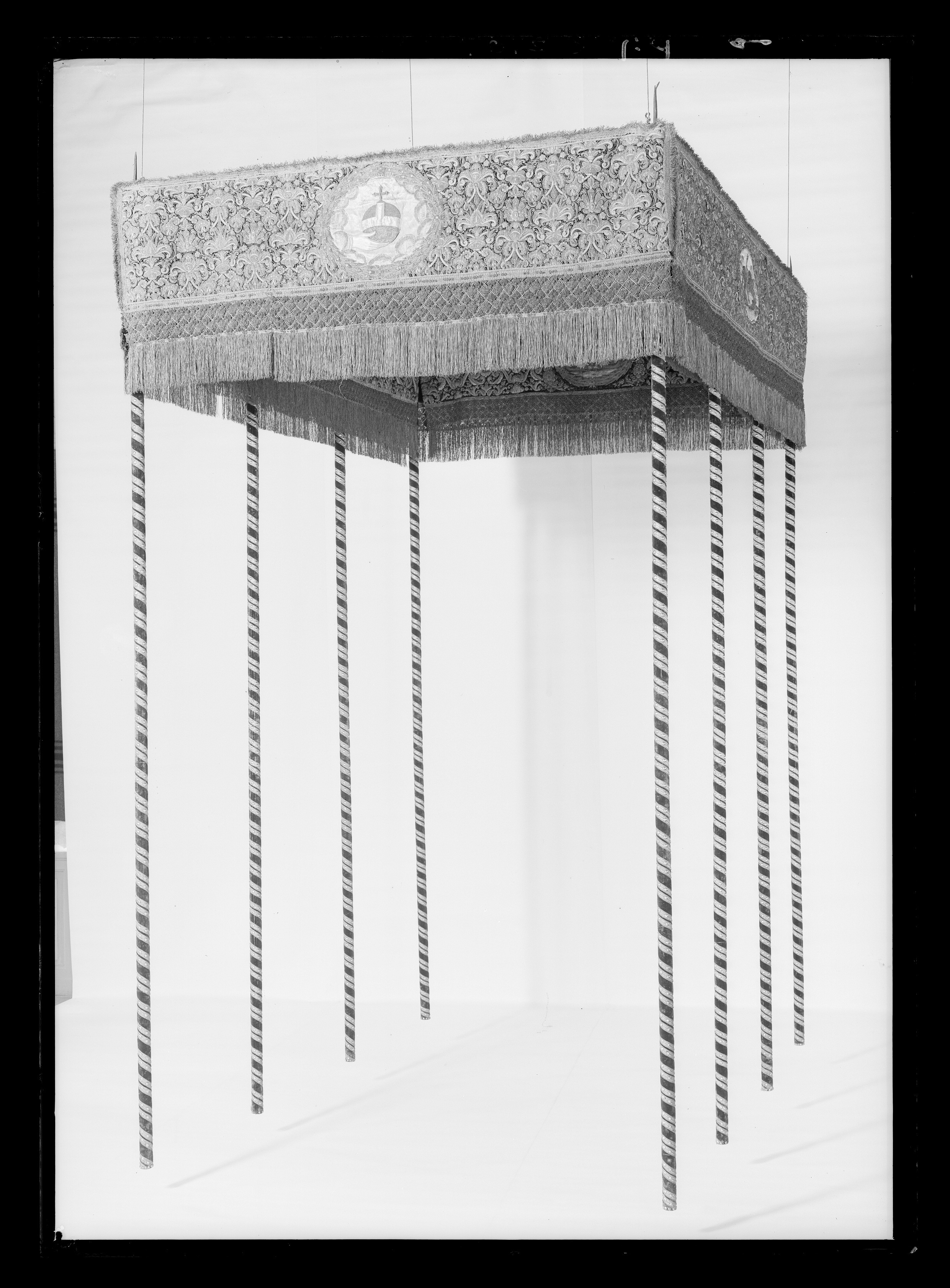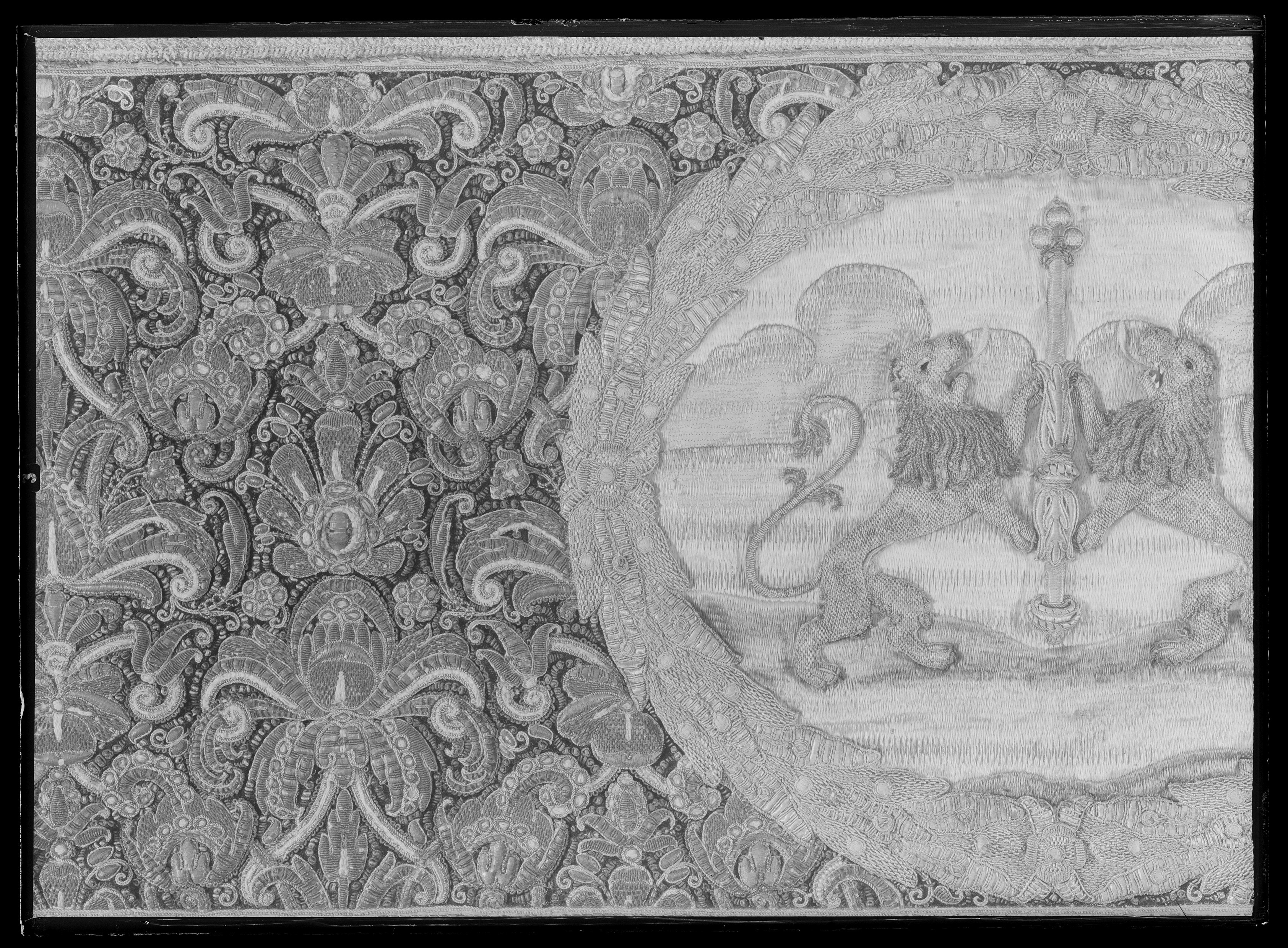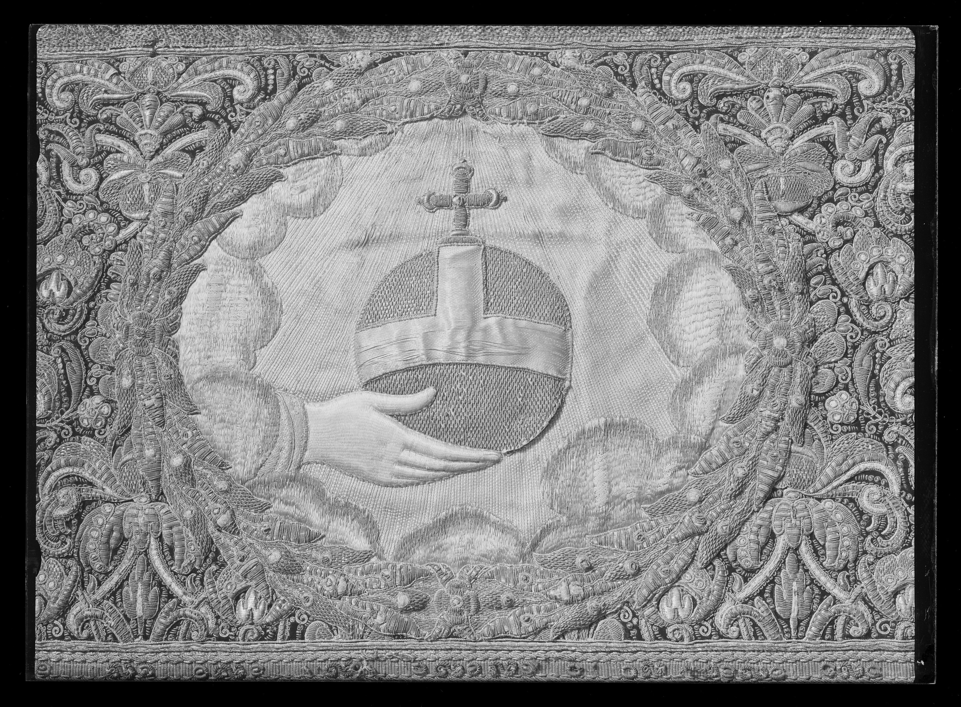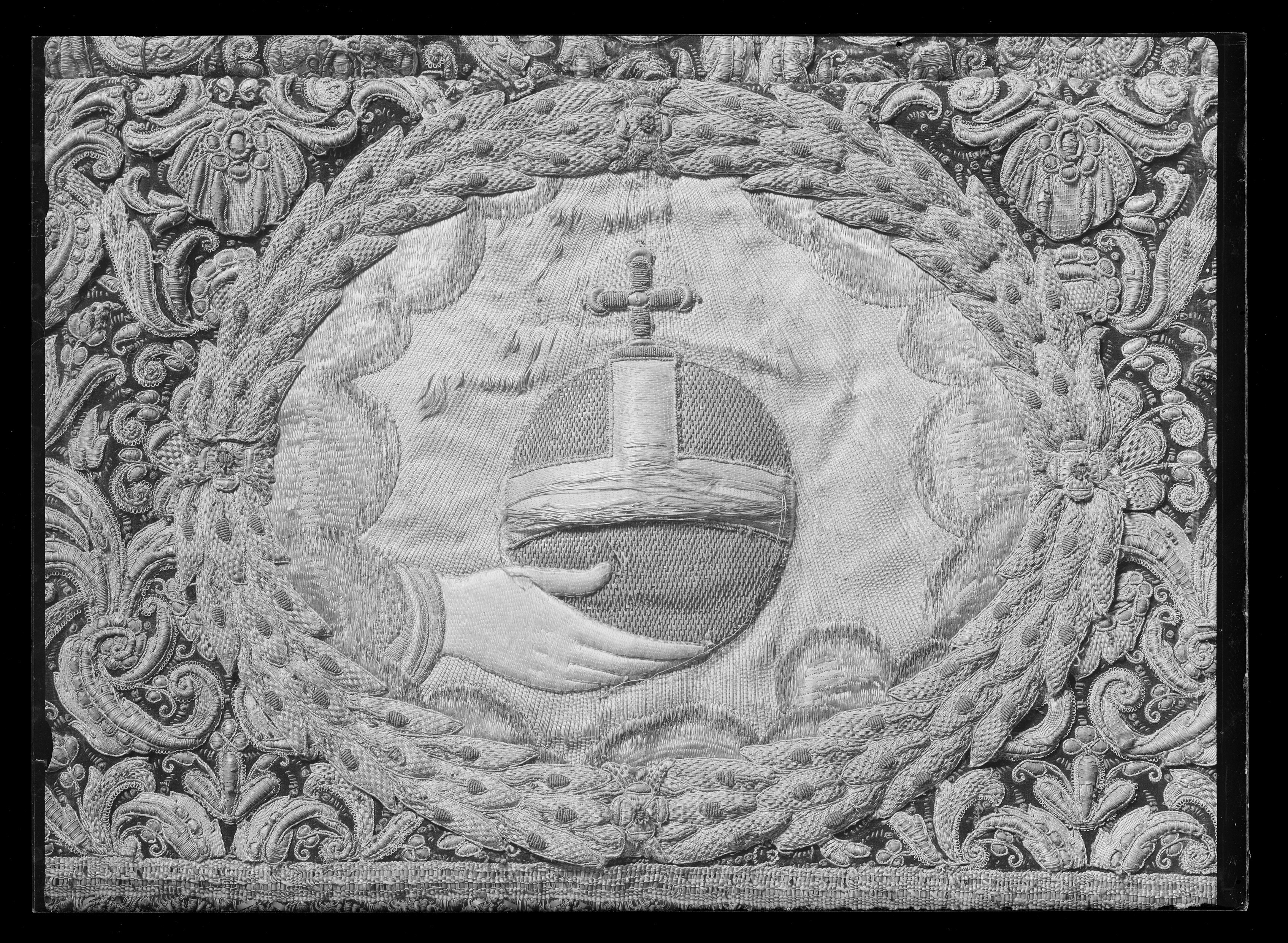 Ett rektangulärt tak med fyra nedhängande fasta innerkappor och fyra lösa ytterkappor. Ytterkapporna utgörs av två långa kappor, l.2510 mm b.660 mm, samt två kortare kappor, l.1800 mm b.660 mm. Taket samt kapporna är av violett purpursammet med reliefbroderi i guld och silver på silkeskärna i varierande teknik. Broderiet utgörs av ett vegetativt antikiserande motiv av palmetter, akantusblad och voluter. Broderiet är symmetriskt utformat i räta rader. Mitt på kapporna sitter ovala medaljonger, diam ca 330-390 mm, framställande riksregalierna i två serier. Medaljongerna är broderade separat och fastsydda på kapporna. Medaljongerna omges av bladkransar med lagerblad av guldtråd och silkestråd. Kransarna är sammanbundna av fyra små blommor av silkestråd. På kappornas nedre del sitter en bred bård av krepiner i silver och guld föreställande blommor. Krepinerna skiljer sig något på inner och ytterkapporna. Nedanför dessa sitter ett 20 mm brett vävt guldband med invävda lan i guld och silver lagda i kors. Kapporna kantas slutligen nertill av en 130 mm lång, tät frans av tvinnad guld och silvertråd. Fransen är något glesare på innerkapporna på kortsidorna. Ytterkapporna kantas runtom av en kortare frans av gul silkestråd, 20 mm. Taket är på baksidan klätt med naturfärgat linnelärft. Linnelärften från taket överlappar sidokapporna med en lös kant, 130 mm bred. Kapporna är på baksidan klädda med röd sammet. För fäste av de lösa ytterkapporna samt för fästandet av bärstängerna sitter på baksidan av innerkapporna långa knytband av naturvitt linne, fastsydda i par. De sitter på ett grönt vävt linneband. På baksidan av ytterkapporna sitter på ett röd och gulrandigt vävt linneband, hällor av naturfärgat linne, 19-28 hällor på varje sidokappa. Medaljongerna bär samma motiv på både inner och ytterkappor. De visar riksregalierna. Samtliga motiv återges av broderier i hög relief av silver och guldtråd samt med silkestråd i schattérsöm. Svärdet, hållet av två riddare i antikiserande rustning av guld, silver och silkestråd. Bakgrunden utgörs av gräsbevuxna kullar av grön silkestråd i olika nyanser samt himmel och moln av silkestråd i blått, vitt och brunt. Spiran, hållen av två lejon stående på bakbenen. Lejonens ögon är av svarta pärlor. Lejonen står på gräsbeväxta kullar med en himmel av vit silkestråd och moln med kanter av silvertråd och silverlan. Riksnyckeln, hållen av två sjöjungfrur mot en bakgrund av himmel och hav av silkestråd i blå och vita nyanser samt med detaljer av gul silkestråd. Sjöjungfrurnas långa hår är broderat med brun silkestråd på innerkappan och med gul silkestråd på ytterkappan. Nyckeln är av guldtråd samt guldlan och små vita pärlor. Riksäpplet skildras liggandes i en framsträckt hand, föreställande Guds hand. Riksäpplet är huvudsakligen av guld- och silvertråd samt silverlan och framställs mot en bakgrund av emanerande strålar. Motivet omges av en inre ram av moln med konturer av guld- och silvertråd. Anmärkning: Till himlen hör en lös medaljong föreställande en kunglig krona uppburen av två bevingade putti, med löst äpple nnr 6040. Medaljongen satt på undersidan av kröningshimlens tak. Till Karl X Gustavs biläger avlägsnades kronan från taket och placerades på ryggstycket till bilägerssängen till vilken delar av himlen användes. Då kröningshimlen återställdes till Karl XI:s kröning 1675 återplacerade inte kronan utan förvarades bland lösa broderier i Husgerådskammaren, varifrån den återlämnades 1875. De åtta bärstänger, nnr 31980-31987, som hör till kröningshimlen nytillverkades till Karl XI:s kröning 1675. De är runt 3000 mm höga och klädda med röd sammet, dekorerade med vävda guldband och förgyllda nitar. De ursprungliga bärstängerna ska dessutom ha varit dekorerade med pärlbroderier. Då kröningshimlen skurits upp och senare åter sytts ihop, har skarvar och infällda bitar tillkommit men det är svårt att se konturerna för sömnaden då broderierna täcker sömmarna. Man kan dock på taket se att broderiet har förskjutits. På innerkappan runtom medaljongen med riksnyckeln sitter en större infälld bit av ett rött sammetstyg, 465x335 mm. Detta beror på att denna medaljong skurits ut till Karl XI:s dopsäng och senare ersatts av en ny medaljong. Halva taket är mörkare i färgen, broderierna dvs. guld och silvertråden har oxiderat. Sidokapporna var beströdda med pärlor av vilka nu endast återstår spår i form av blottade silkeskärnor. På medaljongen med riksnyckeln på innerkappan sitter fortfarande ett fåtal små vita pärlor kvar. Även broderierna på kapporna har oxiderat. Fullt av små nålstick på medaljongerna på de ställen där det saknas silkestråd och antagligen även pärlor. Vid sidan av samtliga medaljonger sitter små röda lackklumpar. På riksäpplet i medaljongen på ytterkappan har sömmarna släppt i kanten. På en av ytterkapporna, den ytterkappan som frasmtäller spiran, sitter en mindre bit av infälld sammet, något rödare i färgen. I den övre kanten vid sidan av medaljongen saknas en bit av broderiet. Man har varit sparsam med sammetsyget som inte är täckande under medaljongerna. Historik och proveniens: Kröningshimlen beställdes i slutet på 1640-talet tillsammans med diverse praktfulla textilier från Paris inför drottning Kristinas kröningsceremoni. Den omnämns för första gången i en korrespondens från år 1648 gällande beställningen. Man vet inte med säkerhet vem brodören var men man tror att det kan ha varit en fransk pärlstickare vid namn Pierre Boucher. Efter kröningen år 1650 inlämnades himlen till Husgerådskammaren och finns från år 1654 omnämnd i Husgerådskammarens inventarieförteckning. Till Karl X Gustavs och Hedvig Eleonoras bröllop sprättades himlen sönder och delar användes till en bilägersäng och återstoden a