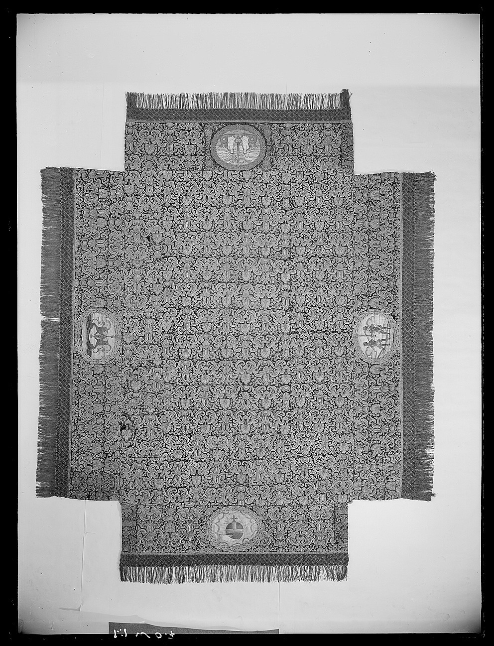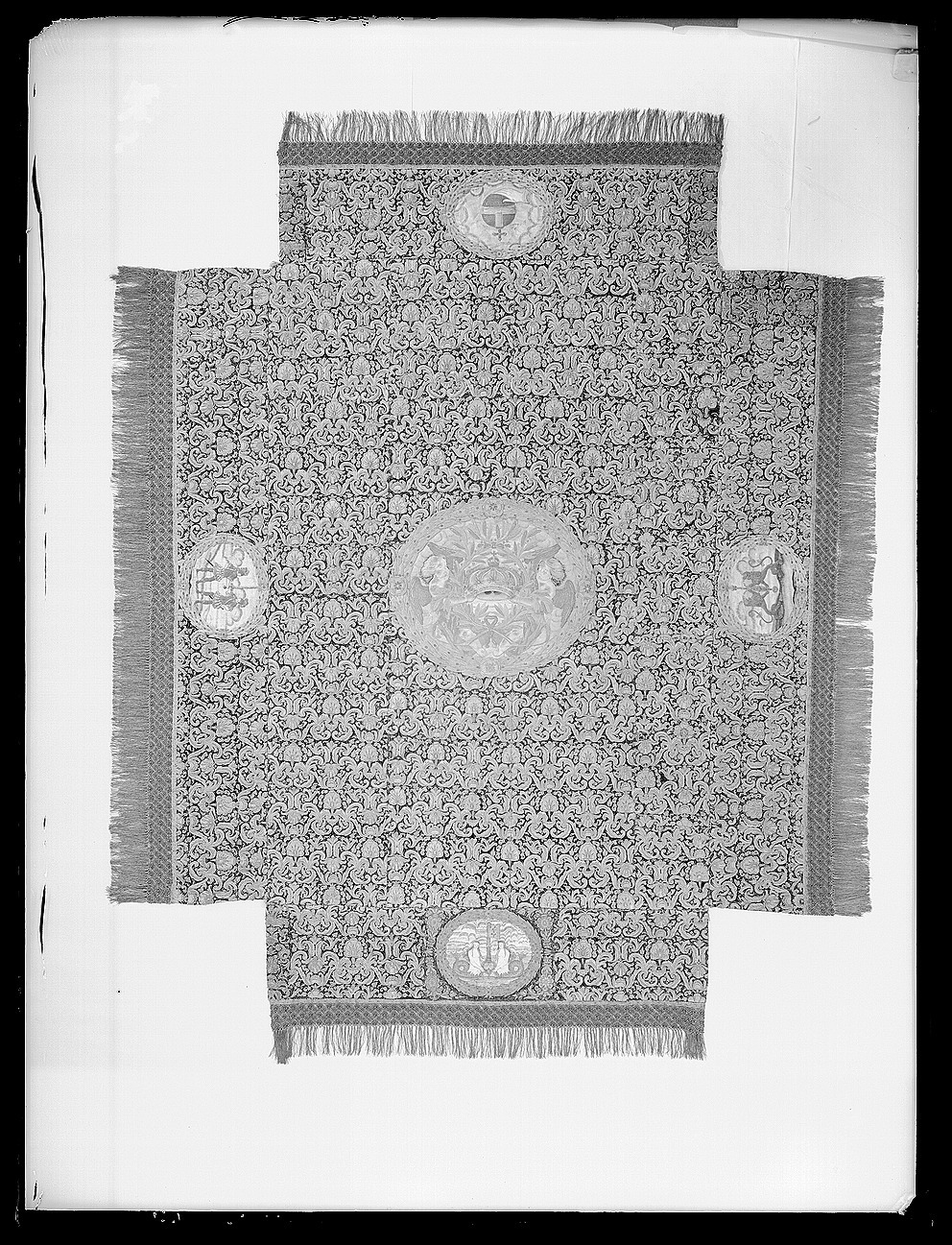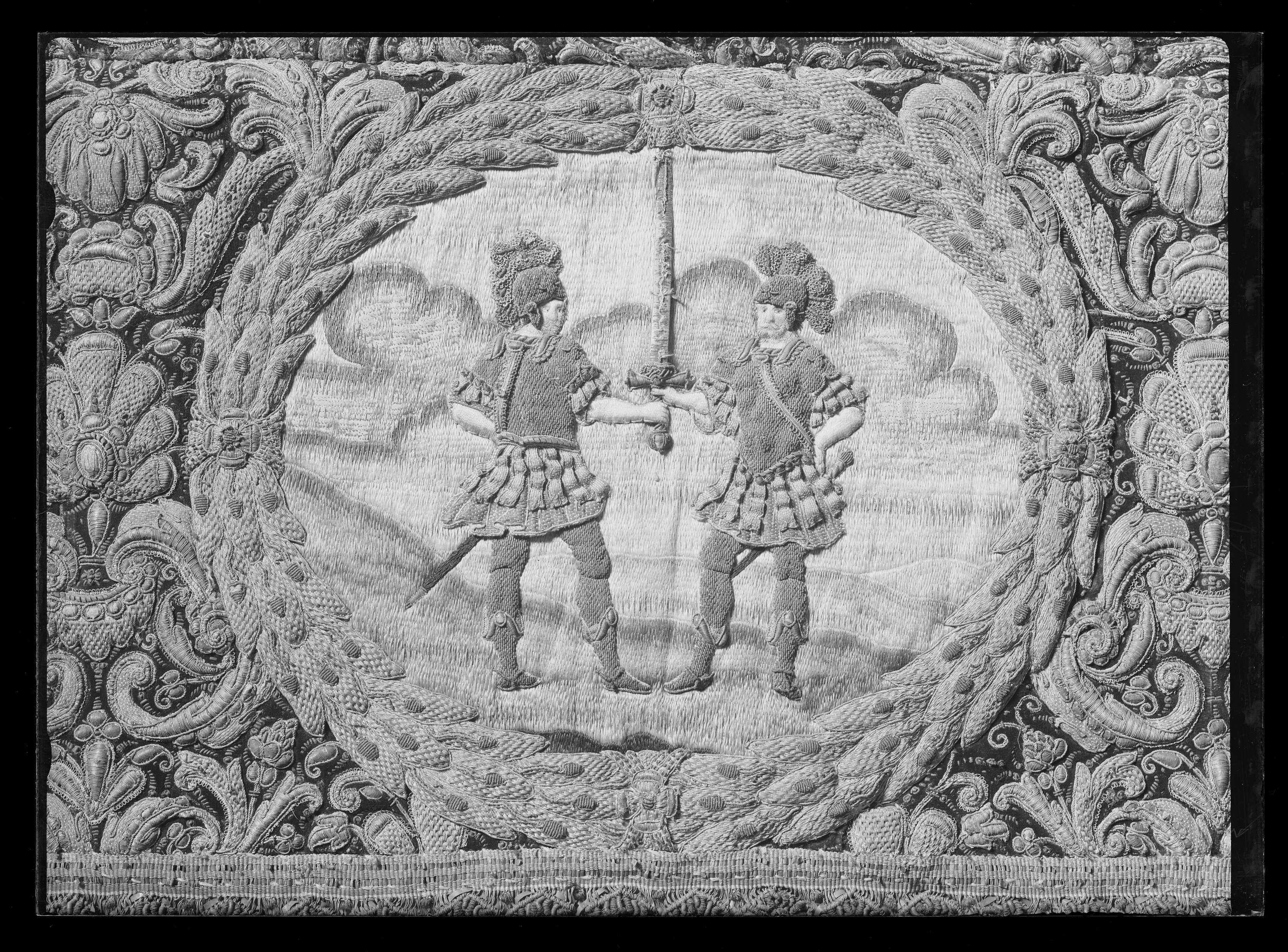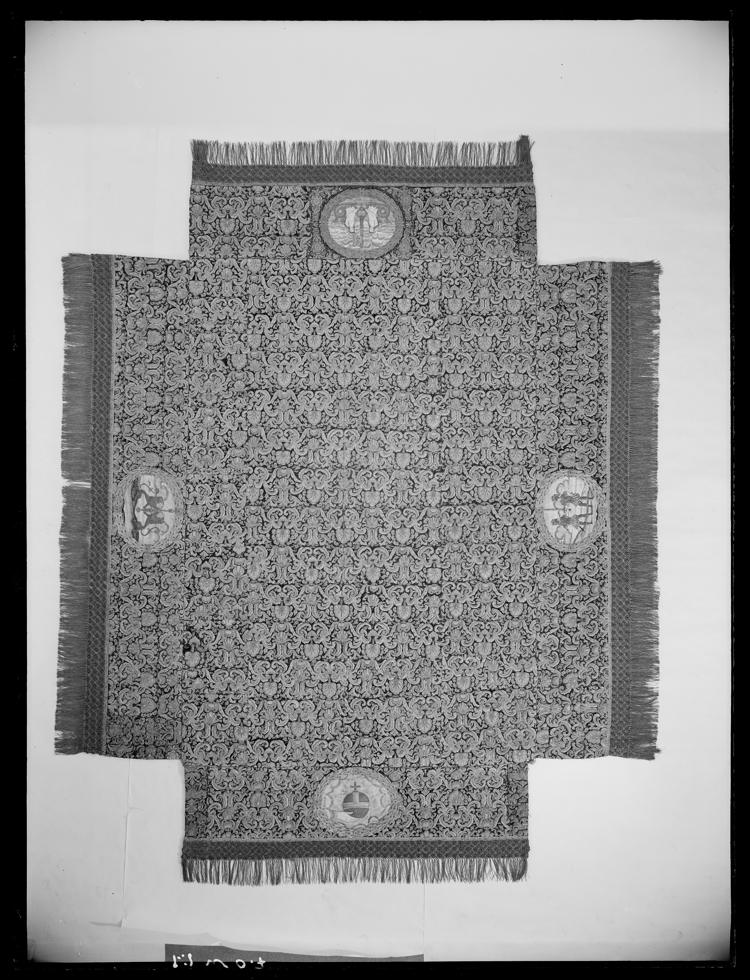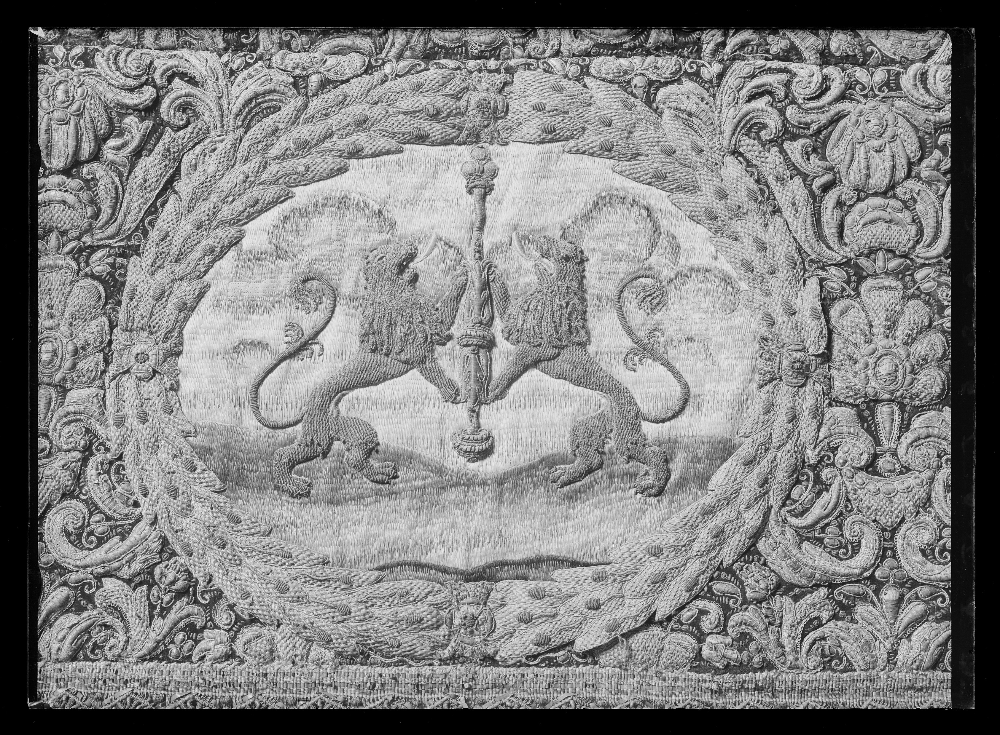 Ett rektangulärt tak med fyra nedhängande fasta innerkappor och fyra lösa ytterkappor. Ytterkapporna utgörs av två långa kappor, l.2510 mm b.660 mm, samt två kortare kappor, l.1800 mm b.660 mm. Taket samt kapporna är av violett purpursammet med reliefbroderi i guld och silver på silkeskärna i varierande teknik. Broderiet utgörs av ett vegetativt antikiserande motiv av palmetter, akantusblad och voluter. Broderiet är symmetriskt utformat i räta rader. Mitt på kapporna sitter ovala medaljonger, diam ca 330-390 mm, framställande riksregalierna i två serier. Medaljongerna är broderade separat och fastsydda på kapporna. Medaljongerna omges av bladkransar med lagerblad av guldtråd och silkestråd. Kransarna är sammanbundna av fyra små blommor av silkestråd. På kappornas nedre del sitter en bred bård av krepiner i silver och guld föreställande blommor. Krepinerna skiljer sig något på inner och ytterkapporna. Nedanför dessa sitter ett 20 mm brett vävt guldband med invävda lan i guld och silver lagda i kors. Kapporna kantas slutligen nertill av en 130 mm lång, tät frans av tvinnad guld och silvertråd. Fransen är något glesare på innerkapporna på kortsidorna. Ytterkapporna kantas runtom av en kortare frans av gul silkestråd, 20 mm. Taket är på baksidan klätt med naturfärgat linnelärft. Linnelärften från taket överlappar sidokapporna med en lös kant, 130 mm bred. Kapporna är på baksidan klädda med röd sammet. För fäste av de lösa ytterkapporna samt för fästandet av bärstängerna sitter på baksidan av innerkapporna långa knytband av naturvitt linne, fastsydda i par. De sitter på ett grönt vävt linneband. På baksidan av ytterkapporna sitter på ett röd och gulrandigt vävt linneband, hällor av naturfärgat linne, 19-28 hällor på varje sidokappa. Medaljongerna bär samma motiv på både inner och ytterkappor. De visar riksregalierna. Samtliga motiv återges av broderier i hög relief av silver och guldtråd samt med silkestråd i schattérsöm. Svärdet, hållet av två riddare i antikiserande rustning av guld, silver och silkestråd. Bakgrunden utgörs av gräsbevuxna kullar av grön silkestråd i olika nyanser samt himmel och moln av silkestråd i blått, vitt och brunt. Spiran, hållen av två lejon stående på bakbenen. Lejonens ögon är av svarta pärlor. Lejonen står på gräsbeväxta kullar med en himmel av vit silkestråd och moln med kanter av silvertråd och silverlan. Riksnyckeln, hållen av två sjöjungfrur mot en bakgrund av himmel och hav av silkestråd i blå och vita nyanser samt med detaljer av gul silkestråd. Sjöjungfrurnas långa hår är broderat med brun silkestråd på innerkappan och med gul silkestråd på ytterkappan. Nyckeln är av guldtråd samt guldlan och små vita pärlor. Riksäpplet skildras liggandes i en framsträckt hand, föreställande Guds hand. Riksäpplet är huvudsakligen av guld- och silvertråd samt silverlan och framställs mot en bakgrund av emanerande strålar. Motivet omges av en inre ram av moln med konturer av guld- och silvertråd. Anmärkning: Till himlen hör en lös medaljong föreställande en kunglig krona uppburen av två bevingade putti, med löst äpple nnr 6040. Medaljongen satt på undersidan av kröningshimlens tak. Till Karl X Gustavs biläger avlägsnades kronan från taket och placerades på ryggstycket till bilägerssängen till vilken delar av himlen användes. Då kröningshimlen återställdes till Karl XI:s kröning 1675 återplacerade inte kronan utan förvarades bland lösa broderier i Husgerådskammaren, varifrån den återlämnades 1875. De åtta bärstänger, nnr 31980-31987, som hör till kröningshimlen nytillverkades till Karl XI:s kröning 1675. De är runt 3000 mm höga och klädda med röd sammet, dekorerade med vävda guldband och förgyllda nitar. De ursprungliga bärstängerna ska dessutom ha varit dekorerade med pärlbroderier. Då kröningshimlen skurits upp och senare åter sytts ihop, har skarvar och infällda bitar tillkommit men det är svårt att se konturerna för sömnaden då broderierna täcker sömmarna. Man kan dock på taket se att broderiet har förskjutits. På innerkappan runtom medaljongen med riksnyckeln sitter en större infälld bit av ett rött sammetstyg, 465x335 mm. Detta beror på att denna medaljong skurits ut till Karl XI:s dopsäng och senare ersatts av en ny medaljong. Halva taket är mörkare i färgen, broderierna dvs. guld och silvertråden har oxiderat. Sidokapporna var beströdda med pärlor av vilka nu endast återstår spår i form av blottade silkeskärnor. På medaljongen med riksnyckeln på innerkappan sitter fortfarande ett fåtal små vita pärlor kvar. Även broderierna på kapporna har oxiderat. Fullt av små nålstick på medaljongerna på de ställen där det saknas silkestråd och antagligen även pärlor. Vid sidan av samtliga medaljonger sitter små röda lackklumpar. På riksäpplet i medaljongen på ytterkappan har sömmarna släppt i kanten. På en av ytterkapporna, den ytterkappan som frasmtäller spiran, sitter en mindre bit av infälld sammet, något rödare i färgen. I den övre kanten vid sidan av medaljongen saknas en bit av broderiet. Man har varit sparsam med sammetsyget som inte är täckande under medaljongerna. Historik och proveniens: Kröningshimlen beställdes i slutet på 1640-talet tillsammans med diverse praktfulla textilier från Paris inför drottning Kristinas kröningsceremoni. Den omnämns för första gången i en korrespondens från år 1648 gällande beställningen. Man vet inte med säkerhet vem brodören var men man tror att det kan ha varit en fransk pärlstickare vid namn Pierre Boucher. Efter kröningen år 1650 inlämnades himlen till Husgerådskammaren och finns från år 1654 omnämnd i Husgerådskammarens inventarieförteckning. Till Karl X Gustavs och Hedvig Eleonoras bröllop sprättades himlen sönder och delar användes till en bilägersäng och återstoden a