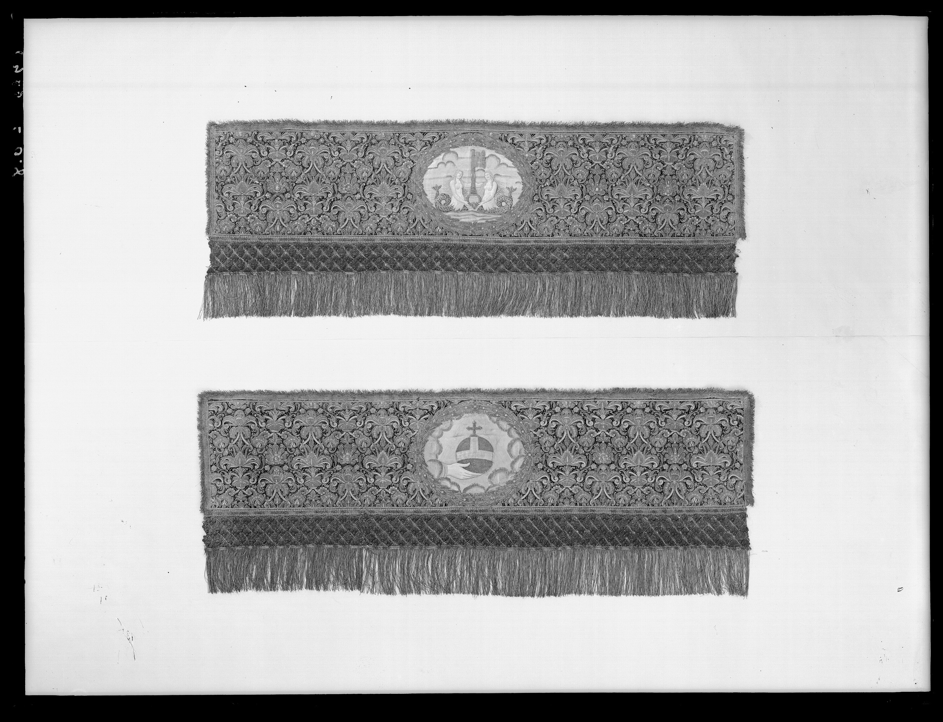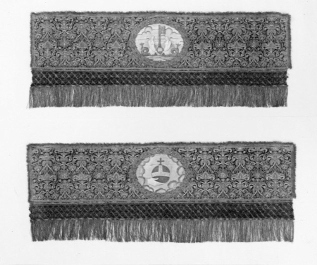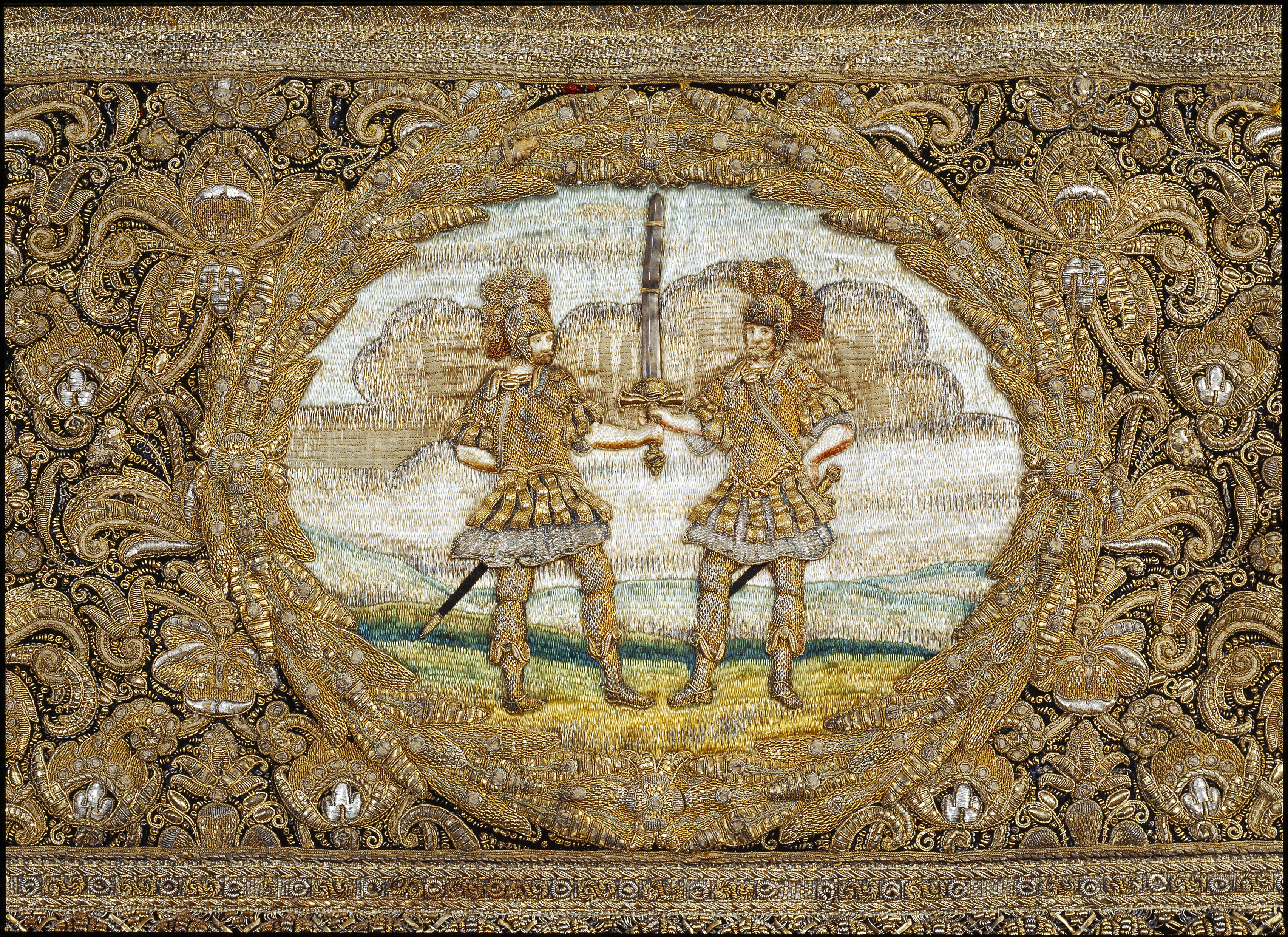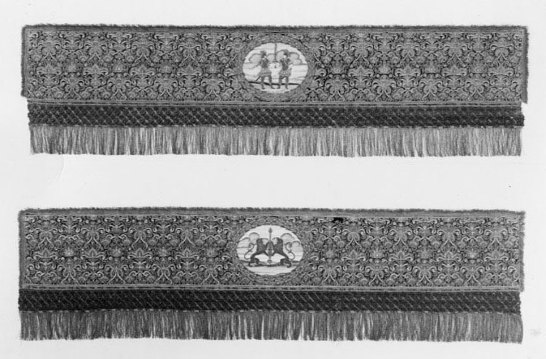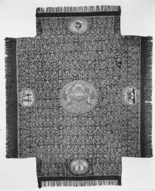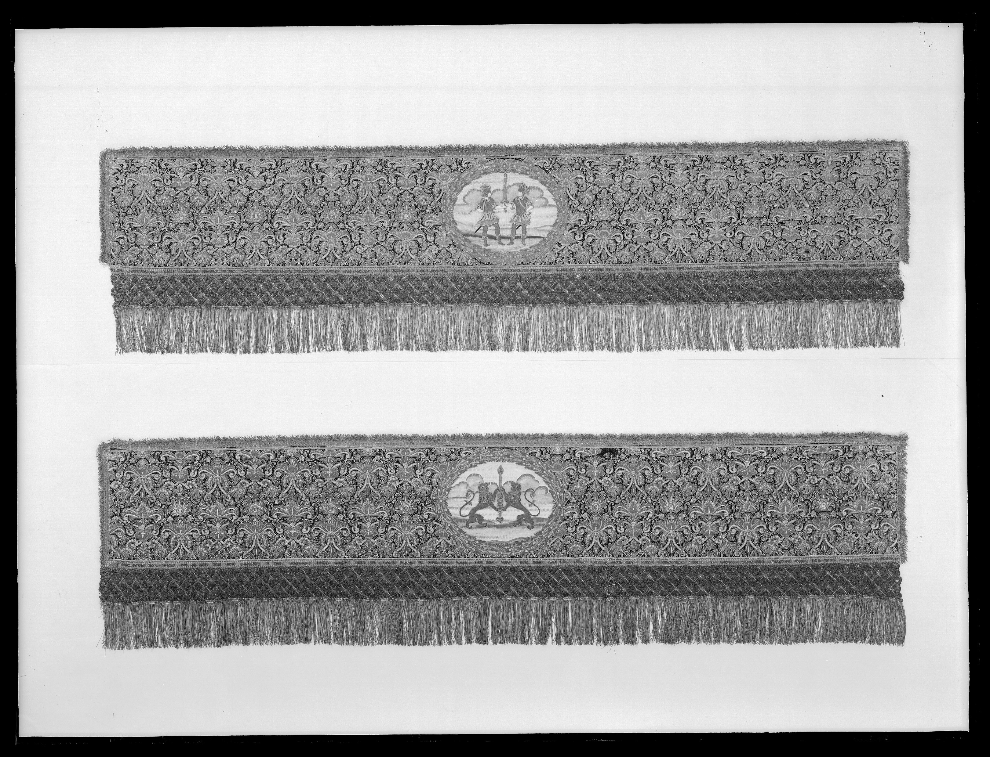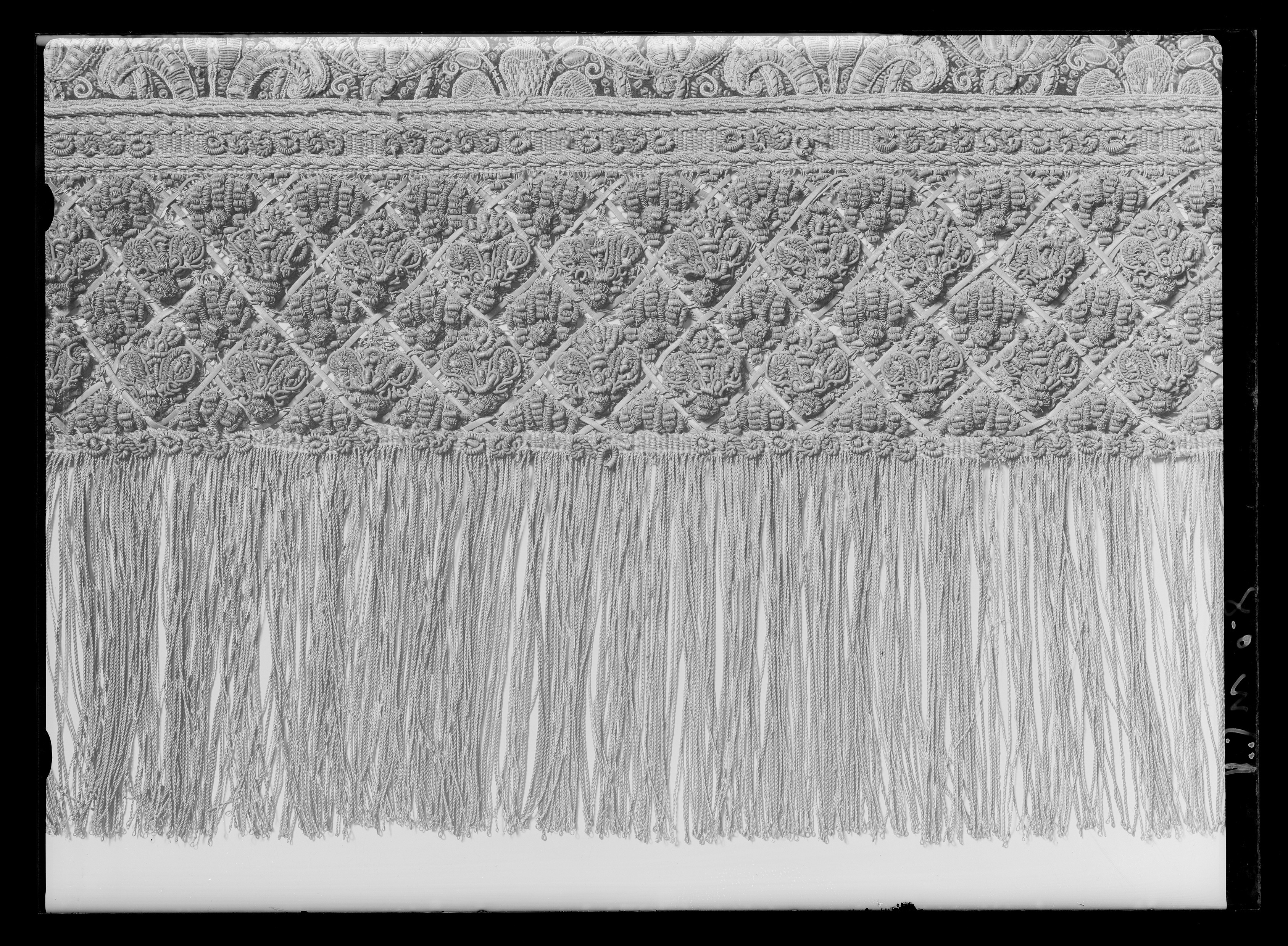Ett rektangulärt tak med fyra nedhängande fasta innerkappor och fyra lösa ytterkappor. Ytterkapporna utgörs av två långa kappor, l.2510 mm b.660 mm, samt två kortare kappor, l.1800 mm b.660 mm. Taket samt kapporna är av violett purpursammet med reliefbroderi i guld och silver på silkeskärna i varierande teknik. Broderiet utgörs av ett vegetativt antikiserande motiv av palmetter, akantusblad och voluter. Broderiet är symmetriskt utformat i räta rader. Mitt på kapporna sitter ovala medaljonger, diam ca 330-390 mm, framställande riksregalierna i två serier. Medaljongerna är broderade separat och fastsydda på kapporna. Medaljongerna omges av bladkransar med lagerblad av guldtråd och silkestråd. Kransarna är sammanbundna av fyra små blommor av silkestråd. På kappornas nedre del sitter en bred bård av krepiner i silver och guld föreställande blommor. Krepinerna skiljer sig något på inner och ytterkapporna. Nedanför dessa sitter ett 20 mm brett vävt guldband med invävda lan i guld och silver lagda i kors. Kapporna kantas slutligen nertill av en 130 mm lång, tät frans av tvinnad guld och silvertråd. Fransen är något glesare på innerkapporna på kortsidorna. Ytterkapporna kantas runtom av en kortare frans av gul silkestråd, 20 mm. Taket är på baksidan klätt med naturfärgat linnelärft. Linnelärften från taket överlappar sidokapporna med en lös kant, 130 mm bred. Kapporna är på baksidan klädda med röd sammet. För fäste av de lösa ytterkapporna samt för fästandet av bärstängerna sitter på baksidan av innerkapporna långa knytband av naturvitt linne, fastsydda i par. De sitter på ett grönt vävt linneband. På baksidan av ytterkapporna sitter på ett röd och gulrandigt vävt linneband, hällor av naturfärgat linne, 19-28 hällor på varje sidokappa. Medaljongerna bär samma motiv på både inner och ytterkappor. De visar riksregalierna. Samtliga motiv återges av broderier i hög relief av silver och guldtråd samt med silkestråd i schattérsöm. Svärdet, hållet av två riddare i antikiserande rustning av guld, silver och silkestråd. Bakgrunden utgörs av gräsbevuxna kullar av grön silkestråd i olika nyanser samt himmel och moln av silkestråd i blått, vitt och brunt. Spiran, hållen av två lejon stående på bakbenen. Lejonens ögon är av svarta pärlor. Lejonen står på gräsbeväxta kullar med en himmel av vit silkestråd och moln med kanter av silvertråd och silverlan. Riksnyckeln, hållen av två sjöjungfrur mot en bakgrund av himmel och hav av silkestråd i blå och vita nyanser samt med detaljer av gul silkestråd. Sjöjungfrurnas långa hår är broderat med brun silkestråd på innerkappan och med gul silkestråd på ytterkappan. Nyckeln är av guldtråd samt guldlan och små vita pärlor. Riksäpplet skildras liggandes i en framsträckt hand, föreställande Guds hand. Riksäpplet är huvudsakligen av guld- och silvertråd samt silverlan och framställs mot en bakgrund av emanerande strålar. Motivet omges av en inre ram av moln med konturer av guld- och silvertråd. Anmärkning: Till himlen hör en lös medaljong föreställande en kunglig krona uppburen av två bevingade putti, med löst äpple nnr 6040. Medaljongen satt på undersidan av kröningshimlens tak. Till Karl X Gustavs biläger avlägsnades kronan från taket och placerades på ryggstycket till bilägerssängen till vilken delar av himlen användes. Då kröningshimlen återställdes till Karl XI:s kröning 1675 återplacerade inte kronan utan förvarades bland lösa broderier i Husgerådskammaren, varifrån den återlämnades 1875. De åtta bärstänger, nnr 31980-31987, som hör till kröningshimlen nytillverkades till Karl XI:s kröning 1675. De är runt 3000 mm höga och klädda med röd sammet, dekorerade med vävda guldband och förgyllda nitar. De ursprungliga bärstängerna ska dessutom ha varit dekorerade med pärlbroderier. Då kröningshimlen skurits upp och senare åter sytts ihop, har skarvar och infällda bitar tillkommit men det är svårt att se konturerna för sömnaden då broderierna täcker sömmarna. Man kan dock på taket se att broderiet har förskjutits. På innerkappan runtom medaljongen med riksnyckeln sitter en större infälld bit av ett rött sammetstyg, 465x335 mm. Detta beror på att denna medaljong skurits ut till Karl XI:s dopsäng och senare ersatts av en ny medaljong. Halva taket är mörkare i färgen, broderierna dvs. guld och silvertråden har oxiderat. Sidokapporna var beströdda med pärlor av vilka nu endast återstår spår i form av blottade silkeskärnor. På medaljongen med riksnyckeln på innerkappan sitter fortfarande ett fåtal små vita pärlor kvar. Även broderierna på kapporna har oxiderat. Fullt av små nålstick på medaljongerna på de ställen där det saknas silkestråd och antagligen även pärlor. Vid sidan av samtliga medaljonger sitter små röda lackklumpar. På riksäpplet i medaljongen på ytterkappan har sömmarna släppt i kanten. På en av ytterkapporna, den ytterkappan som frasmtäller spiran, sitter en mindre bit av infälld sammet, något rödare i färgen. I den övre kanten vid sidan av medaljongen saknas en bit av broderiet. Man har varit sparsam med sammetsyget som inte är täckande under medaljongerna. Historik och proveniens: Kröningshimlen beställdes i slutet på 1640-talet tillsammans med diverse praktfulla textilier från Paris inför drottning Kristinas kröningsceremoni. Den omnämns för första gången i en korrespondens från år 1648 gällande beställningen. Man vet inte med säkerhet vem brodören var men man tror att det kan ha varit en fransk pärlstickare vid namn Pierre Boucher. Efter kröningen år 1650 inlämnades himlen till Husgerådskammaren och finns från år 1654 omnämnd i Husgerådskammarens inventarieförteckning. Till Karl X Gustavs och Hedvig Eleonoras bröllop sprättades himlen sönder och delar användes till en bilägersäng och återstoden a