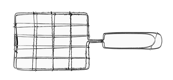 BRÖDROST Av ståltråd. Rektangulär. Bestående av två mot varandra fällbara hälfter, vardera utgörande ett galler med korsande längd- och tvärgående trådar med ändarna omböjda kring en ytterram, från denna utgående vid inre kortsidan ett ögleformigt skaft, bildat av ytterramens utböjda ändar, dessa närmast ramen sammanlagda och omvirade med en tunn bleckplåt, som bildar en lång skafthals, den ena skaftöglan något kortare, på det längre skaftet en tvärgående tråd, som sammanhåller skaften vid rostningen; hälfterna vid yttre änden sammanhållna av två S-formade hakar. Längd: 46,5 cm. Galler, längd: omkring 23 cm.; bredd: omkring 18 cm.
