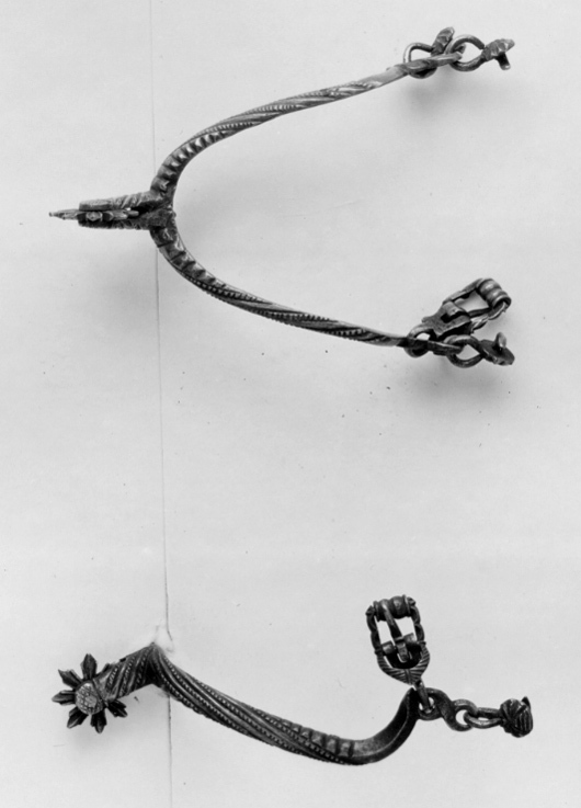 Sporre av stål med filade ränder med tvärgående räfflor. U-formade skänklar med nedåtböjda ytterändar med 2 st framåtriktade öglor i vilka finns, på ena sidan två knappar, på andra sidan en knapp och en rektangulär sölja. Rak sporrhals 23 mm lång med klinga av stål med 8 uddar som är trestråligt filade.