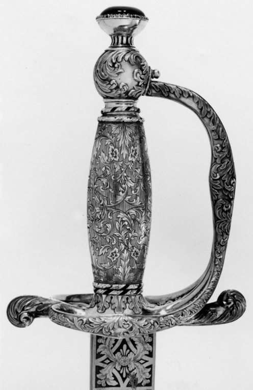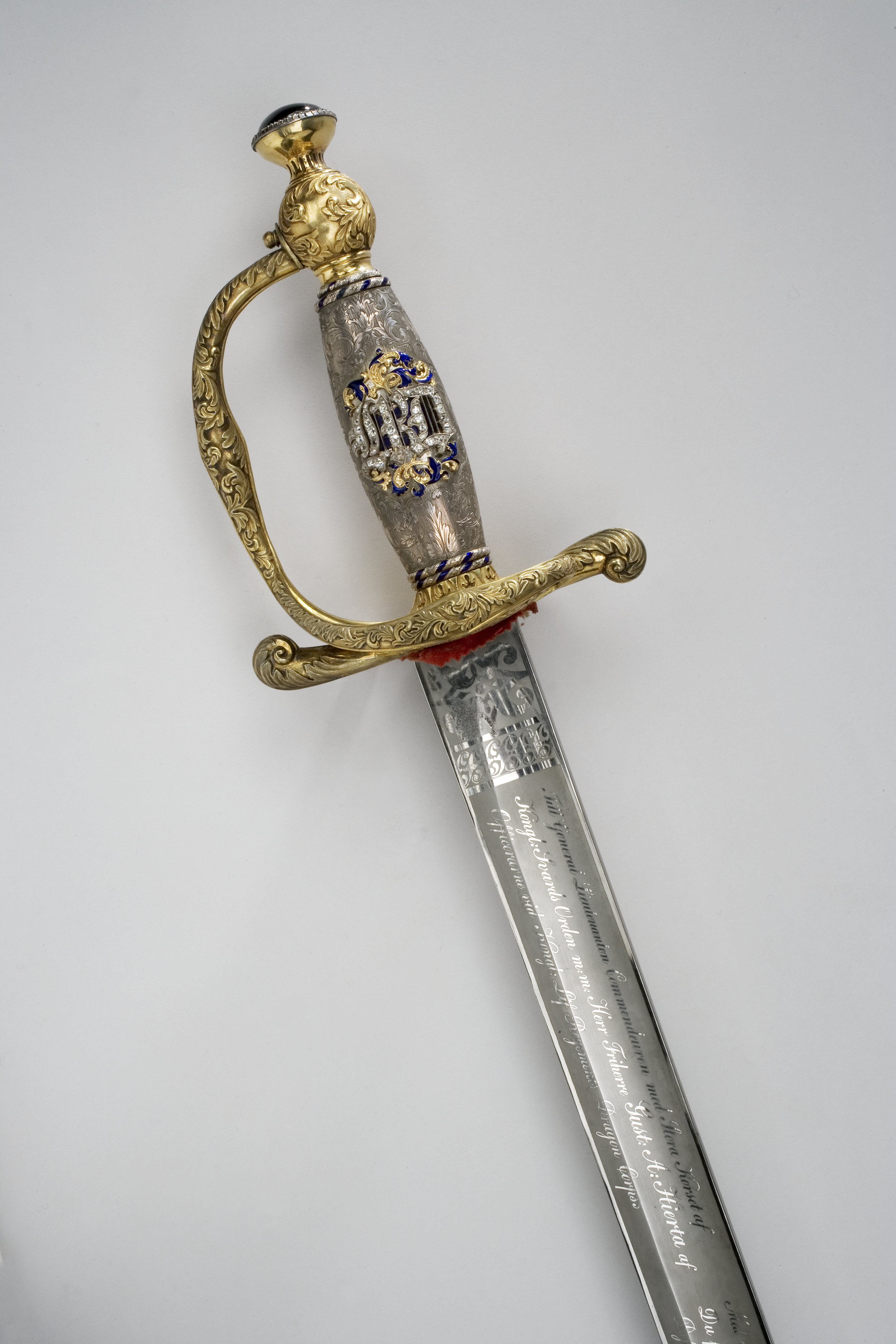 Fäste av typ återgående på den karolinska ryttarvärjans - av rikt ciselerat och oförgyllt silver. Knapp, handbygel och övrig pareranordning förgyllda, kaveln oförgylld. Knapp plommonformad med stor och upptill vid nitknapp, i vars skålformigt utvidgade överdeln monterats en i (oförgylld) silverskål fattad, cabochonslipad, rund granat, omgiven av en krans av små, avdeckt fattade rosenstenar. Granatens skålfattning med cylindrisk hals, vars insida är gängad och skruvad på tångens yttterände. Handbygel med rundovalt tvärsnitt, anslutande till knappens nederdel meddelst en skruv genom överdelens uppvikta fot. Handbygeln nertill övergående i de båda symmetriska parerplåtarnas kantlister. Främre parersången uppåtsvängd, den bakre nedåtsvängd. Knapp, handbygel, parerplåtarnas kantlister och parerstänger med reliefsnidade akantusrankor, parerplåtarna på ut- och insidan med genombruen och graverad ornering av akantusblad och rutmönster. Kavel spolformig, slät med graverad ytornering av akantusrankor mot vertikalt finräfflad botten. På utsidan ett monogram av bokstäver i fraktur-versaler: L R D (Liv Regementets Dragoner). Monogrammet, som är nitat fast vid kaveln är i sin helhet omgivet av en slät silverkant och lagd över blåemaljerad botten, ovanför och nedanför monogrammet svängda bladornament i blå emalj och guld. Upptill och nertill runt kaveln två smala silverringar med snedställda ränder i blå emalj. På insidan av yttre parerplåtens främre del intill mittåsen fyra kontrollstämplar: R4, S:t Erikshuvud, tre kronor, G M (1847, Stockholm, Gustaf Möllenborg). Stämplarna små och otydliga. Klinga rak, eneggad utom vid det tvåeggade spetspartiet. Från basen till spetspartiet en bred, grund hålkäl. På klingbasens rygg intill fästet graverat i skrivstil: "Flodman, 1846", Klingan med hela ytan täckande, etsad ornering, ornamenten utsparade (blanka) mot matt botten. Ut- och insidans basparti med ett rätvinkligt fält med blad- och rutornament. På utsidan härovanför ett ca 450 mm långt fält, vari inskriptioner i (utsparad) skrivstil: "Till General Lieutenanten, Commendeuren med Stora Korset af Kongl: Svärds Orden m:m: Herr Friherre Gust: A: Hierta af Officerarna vid Kongl: Lif Regementets Dragon Corps". Härefter i två strofer med tre rader i varje strof: "Med Riddarns fasta mod och Fadrens milda sinne Du fordom denna tropp för an på ärans stig Dess bild ledsagar Dig dit hvilan sänker sig Låt då dess hugkomst bo uti Ditt hjerta inne, Så oföränderlig, som bilden är af Dig Den tacksamheten skref i vapenbröders minne." Texten författad av Bernhard von Beskow (1806-1868). Efter inskriptionerna bladornament och en trofégrupp. Spetspartiet med yttäckande mönster av strödda, femuddiga stjärnor. På insidan ovanför basen rätvinkliga fält, två ovanför varandra ställda trofégrupper åtskilda av lagerkvist. Därefter ett ca 225 mm långt bildfält, avgränsat åt sidorna med en bladformig konturlinje. I bildfältet ett motiv återgivande Livdragonkårens befäl och manskap ridande på linje i galopp med gevär ut, skvadroncheferna framför sina förband och med sabeln förd till hälsning, truppen i paradmundering med hjälm; den är sedd snett framifrån från vänster och vänd mot klingans spets. Efter bildfältet en girlang med fackla, därovanför en trofégrupp med fasces, fanor och hjälm, uppåt åtföljt av ett svärd, lindat med en lagerranka. Spetspartiet ornerat som på utsidan.