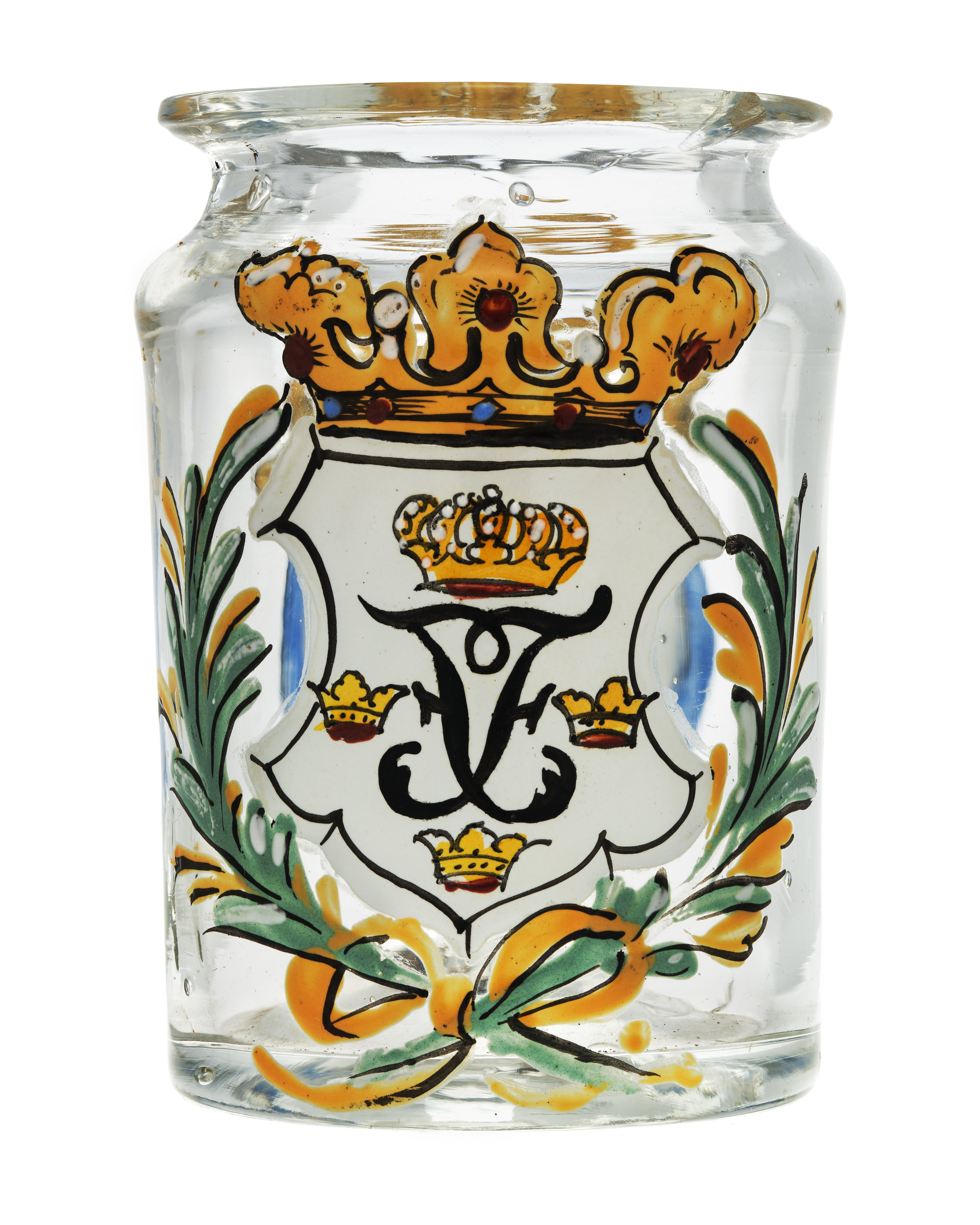 Tillhört Fredrik I, Sverige 1720-1751. Rund glasburk, svagt vidgad uppåt med något smalare hals med utsvängd kant för överbindning. Dekor i emaljmålning, på ena sidan en vit sköld, krönt av öppen krona i gult och rött, i skölden Fredrik I:s namnchiffer, spegelmonogram F (svart) krönt av en kunglig krona och omgivet av de tre svenska kronorna, allt i guld. Runt skölden en lagerkrans i grönt och guld. På motsatt sida en vit textoval med blå kant, upptill prydd med en gul rosett. I ovalen svart, latinsk text: "NIHIL: ALBUM" (intet vitt, zinkoxid, använt i ögonvatten, plåster och salvor).
