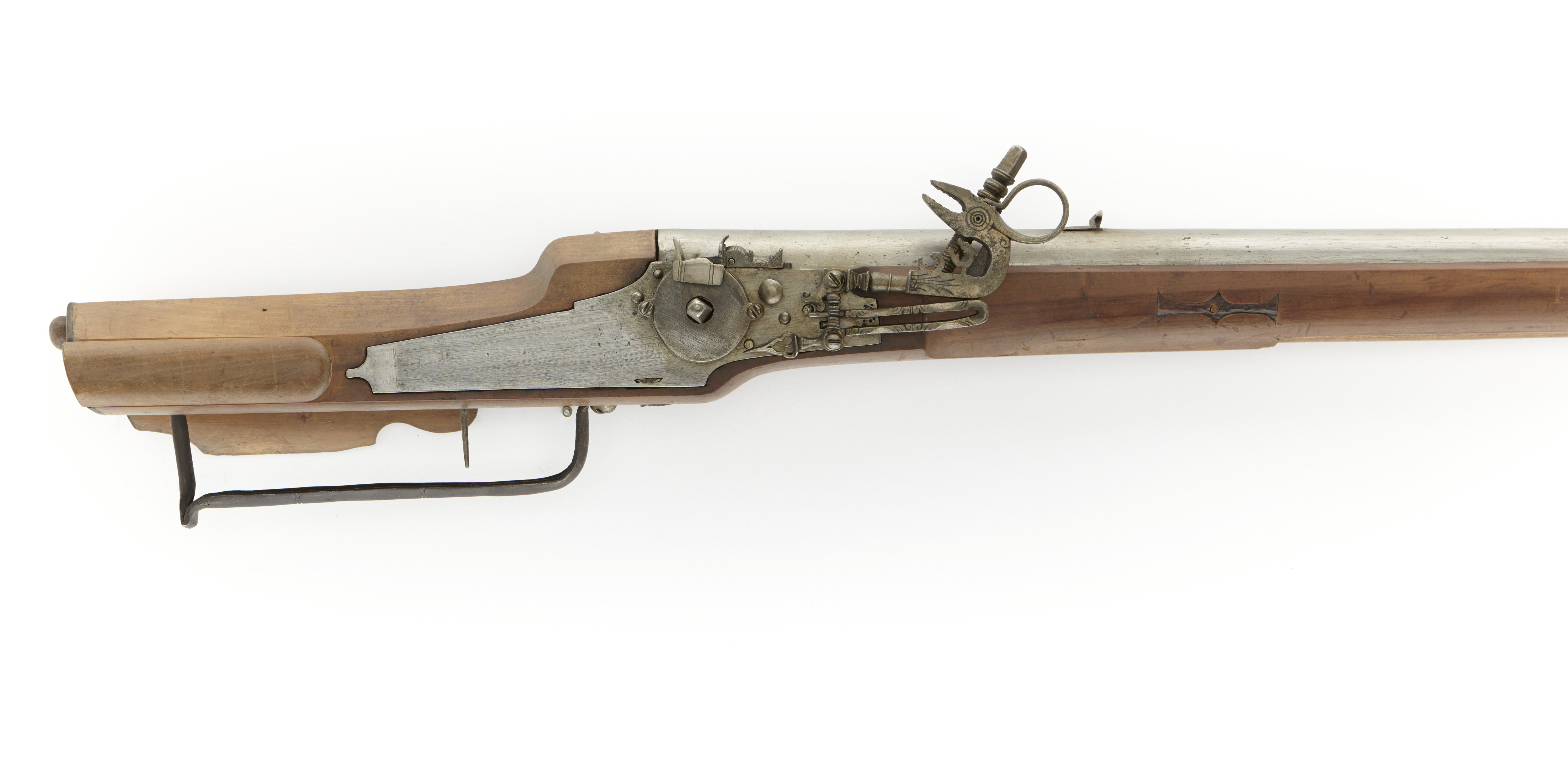 Rund, slätborrad pipa av stål, avrundad svinryggspipa. På undersidan oval stämpel, nernött och otydbar. På undersidan även inslaget ett kryss åtföljt av fyra vertikala streck. Ståndsikte av stål, inlaxat från sidan. Litet knoppkorn av stål. Från korsskruv til korn,siktränna. Hjullås. Ursprungligen blånerat låsbleck, tysk typ - bakåt avsmalnane genom två fall. HJulet fastskruvat med ring, plan hjulkapsel. Krutskärmen mycket låg och nästan vertikal. Hanen graverad, lös överkäke med fingergrepp omböjt till ring. På låsets insida hjulstudel med genombruten dekor, fängpannelockets stoppfjäder likaså genombruten (treklöver, droppformation). Hel stock av ljusbrunt trä. Tysk kolvtyp. Bakplåt och stödkula av horn. Mellan anslag och kolvhals snidad volut. Två låsskruvar med brickor av hjorthorn, hjorthorn även runt de tre pipstifts-hålen. Näsband och rörka av hjorthorn. Främre pipstiftet med påträdd rembygel av stål. Trågformig varbygel av blånerat stål,s.k. holsteinsk. Enkel avtryckare. Tillbehör: Laddstock av ljust trä med doppsko av ben med graverade snedränder och stålskodd ände i fyrklöverform, laddstockens bakände med stålrör. Märkt: 395 ovanför låsblecket, stanstyp 5376. 159 med blyerts på anslaget. Rött lacksigill med Rosenkrantz vapen och ER, framför varbygeln. 17
