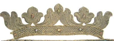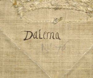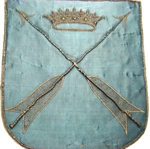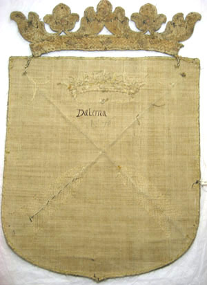 Sköld av blå sidenatlas med två korsade dalpilar. Pilskaften är av en tjock, avsmalnande snodd av silverlan. Pilspetsarna är av silvertråd, kantade med ett snöre av tvinnad silvertråd. Pilskaften är av krusade silverlan, kantade med ett smalt vävt band av vit silkestråd och silvertråd utdragen i små öglor samt med en tvinnad silvertråd. Mellan pilarna är broderat en öppen krona av förgylld silvertråd med kronringen kantad av en snodd av förgylld silvertråd. Kronringen är broderad i gaufrure, ett våffelliknande mönster. På kronringen är broderat fem ovaler föreställande stenar, av silverlan runtom vilka är virat blå och grön silkestråd. Mellan kronspetsarna föreställande stiliserade blad, är broderat fyra blad av silverlan kring vilka är virat röd silkestråd. Vapnet kröns av en grevlig krona broderad med förgylld silvertråd. Kronringen, 34 mm bred, är broderad i gaufrure och kantas av en tjockare och en smalare snodd av förgylld silvertråd och av ett smalt vävt band av vit silkestråd och förgylld silvertråd utdragen i små öglor. Mitt på kronringen är broderat fem ovaler föreställande stenar. Ovalerna är av förgyllda silverlan kring vilka har virats röd respektive blå silkestråd, kantade av ett smalt förgyllt snöre och av små prickar av kantiljer av förgylld silvertråd. Kronan har fem stiliserade spetsar föreställande blommor och blad. Mitt på vardera spets sitter en oval föreställande en sten liksom på kronringen fast med röd och grön silkestråd runtom lanen. Spetsarnas kanter är broderade i relief. Små droppformade hål mellan spetsarna är ifyllda med svart silkestråd. Vapnet är fodrat med gulbeige linnelärft. Mitt bak på vapnet står en påskrift med svart bläck: "Dalerna" och därunder står märkt med blyerts: "No 46".