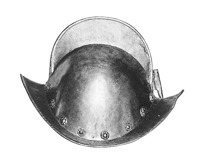 Slät, blank. Kalott av två plåtar, hopfalsade längs kammens överkant. Kam hög. Överkanten avslutad i en stav. Längs kalottens nedre kant sexton nitar med rosettformade nitbrickor av mässing.