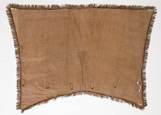 Bottentyg av röd sammet i kypert. Yttäckande applikationsborderi i relief. Mönster av trofégrupper omramade av palmetter och olivkvistar. Längs kantena en broderad snodd av plattare och rundare guldkantiljer. Broderi med tråd, lan och kantiljer av guld och silver. I trofémotiven även silke i gult, grönt, blått, rött, rosa, vitt, beige och svart, några trofémotiv på sidenbotten. Läggsöm och plattsöm. Lagerkvistarna ej i applikation. Kavelfrans längs tre kanter av guld och silver, 60 mm bred varav 10 mm stad. Längs framkanten av guld 22 mm bred varav 10 mm stad. Foder av blekt ursprungligen rött linne i tuskaft. I samband med Karl XIII:s kröning 1809 har hästtäcket uppklippts längs mitten vari tillskarvats trapetsformiga kilar, från bakkanten l. bit från karosstakets kappa 320 mm lång och 310 mm bred vid base. 2. bit från drottning Kristinas röda kaross med motiv av lejon och örnar 230 mm lång och 255 mm bred. 3. triangulär bit av guirlandbroderi från Karl XI:s kaross 250 mm lång och 180 mm bred, löst fäst. Vid framkanten har 160 mm vänster om mittsömmen infällts en kil 240 mm lång och 100 mm bred, 90 mm till vänster om denna en 190 mm lång intagning. 160 mm höger om mittsömmen en kil 210 mm lång och 100 mm bred, 90 mm höger om denna en 140 mm lång intagning.