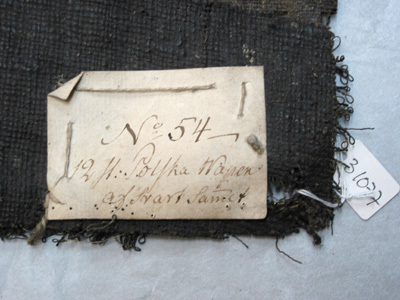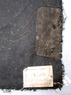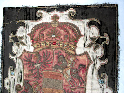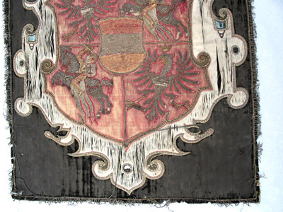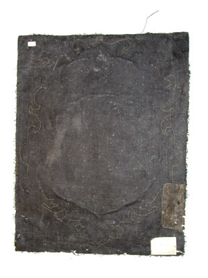 Stående rektangulärt platta av svart, mycket sliten sammet, floret nästan helt borta. Därpå applicerat en symmetrisk rullverkskartusch av vitt siden med kanter och detaljer broderad med guldtråd, kantiljer och ljusblått silke. På kartuschen fäst en förhöjd vapensköld med samma kantning, bottentyget i fälten av grövre tuskafts-siden (?). Kvarderad vapensköld krönt med kunglig krona, alla fälten röda. Fält 1 och 4 Polen, en krönt örn av silver. Föt 2 och 3 Litauen, en ryttare med lyft svärd, sköld på v arm, ett dubbelt korsat kors. Runt alla kanter en smal frans av guldtråd. Baksidan helt täckt med dubbel grov, svart vaxduk med synliga stygn från applikationen. I nedre h hörnet fastsytt en pappersetikett med bläckpåskrift: "N:o 54 // 12 st: Polska Wapen // af Swart Sammet".