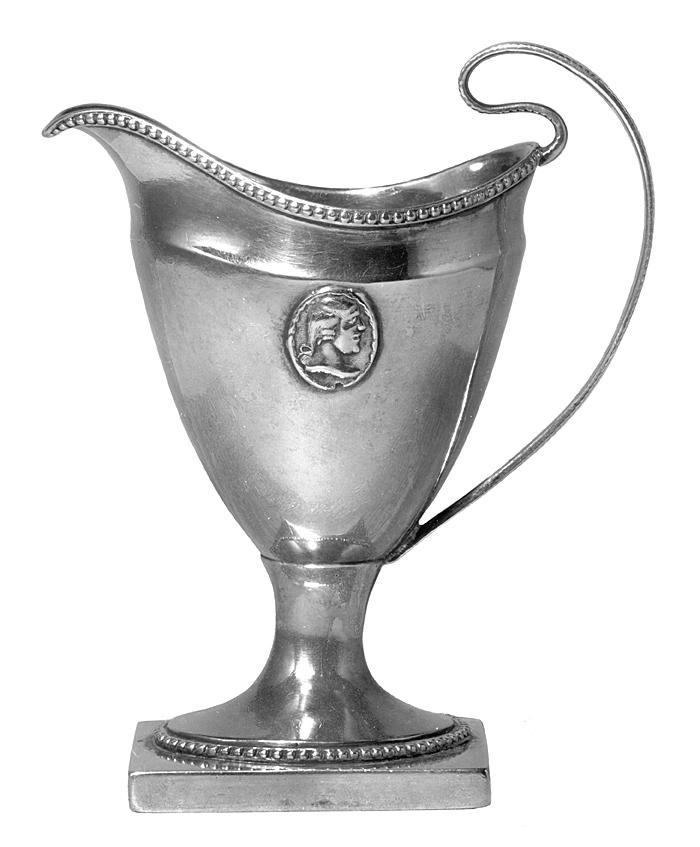 Invändigt förgylld. Hjälmformad, med pärlstavar runt mynning och fot, på livet två pålödda medaljonger med manshuvuden i gustavianska peruker. - " - Gilt interior. Helmet-shaped, with beading round rim and foot, and, soldered onto the body, two medallions of male beads in Gustavian wigs.