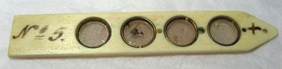 Gulvit, troligen av elfenben. Rektangulär, platt med ena änden spetsig, i andra änden svart påskrift "No 5". I mitten fyra hål på rad med glas (möjligen glimmer) och fästring av mässingstråd.
