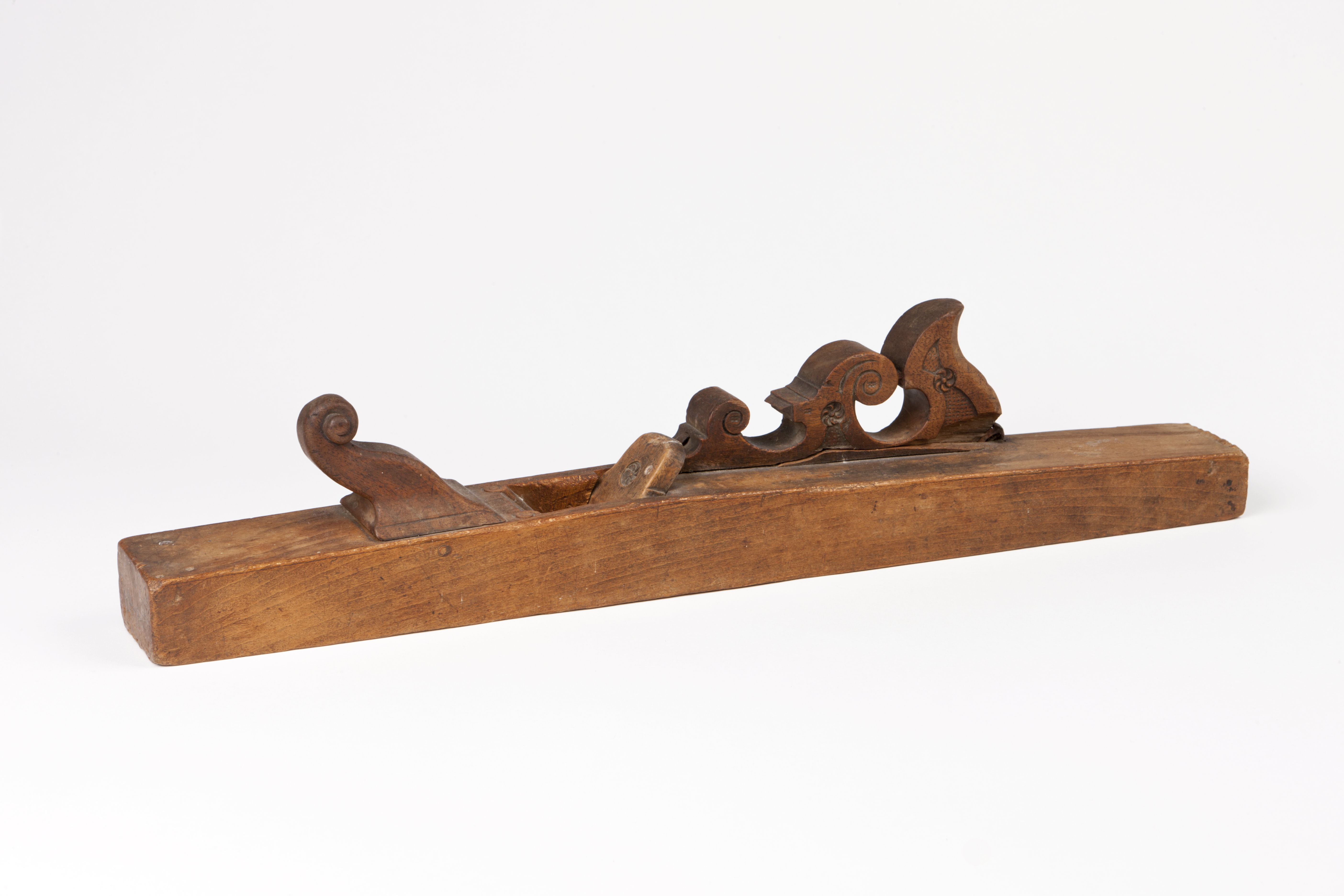 Stock av bok, vid nedsänkningen enkla, skurna pergamentornament, profilerat handtag av valnöt med skurna försänkningar och spiraler samt rosetter i karvsnitt, fyrsidigt horn med volut, kil av valnöt med rosett i karvsnitt.