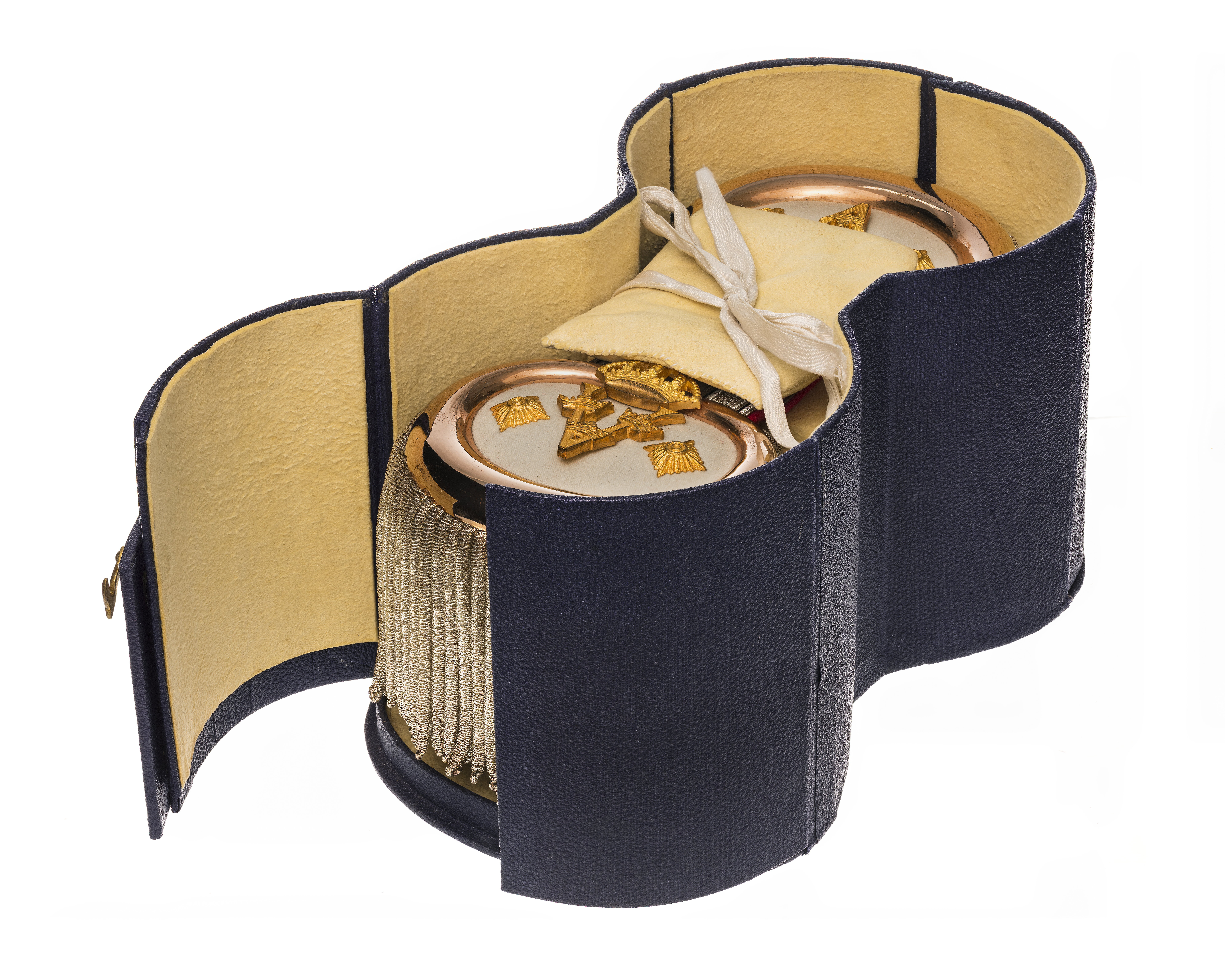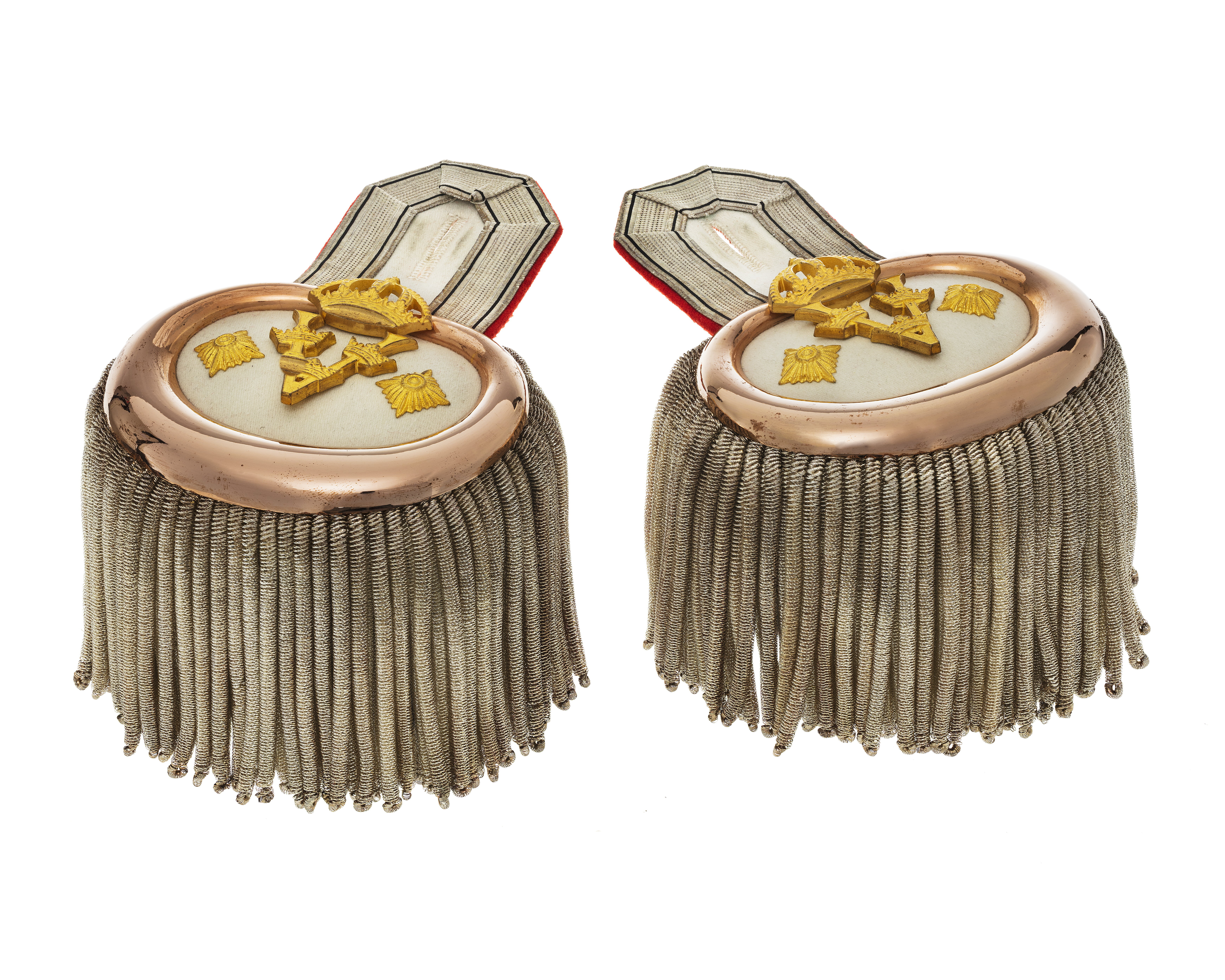Epålett med matta i vitt kläde. Runt den övre delen en silvergalon med två smala, svarta invävda ränder. Mitt i den övre delen ett knapphål. Runt den nedre delen massiv, välvd, förgylld silverplåt. Från kanten hänger smala silverbuljoner ned. Innanför dessa en rad fransar av tvinnat, svart garn med inlagda silvertrådar. Foder av klarrött kläde. På epåletter Victorias krönta monogram i guld, omgivet av två strålformiga kors. Epåletterna ligger i pappask klädd med påklistrat, brunt omslagspapper. I askens botten en fastklistrad, oval stomme som stöd för epåletterna.