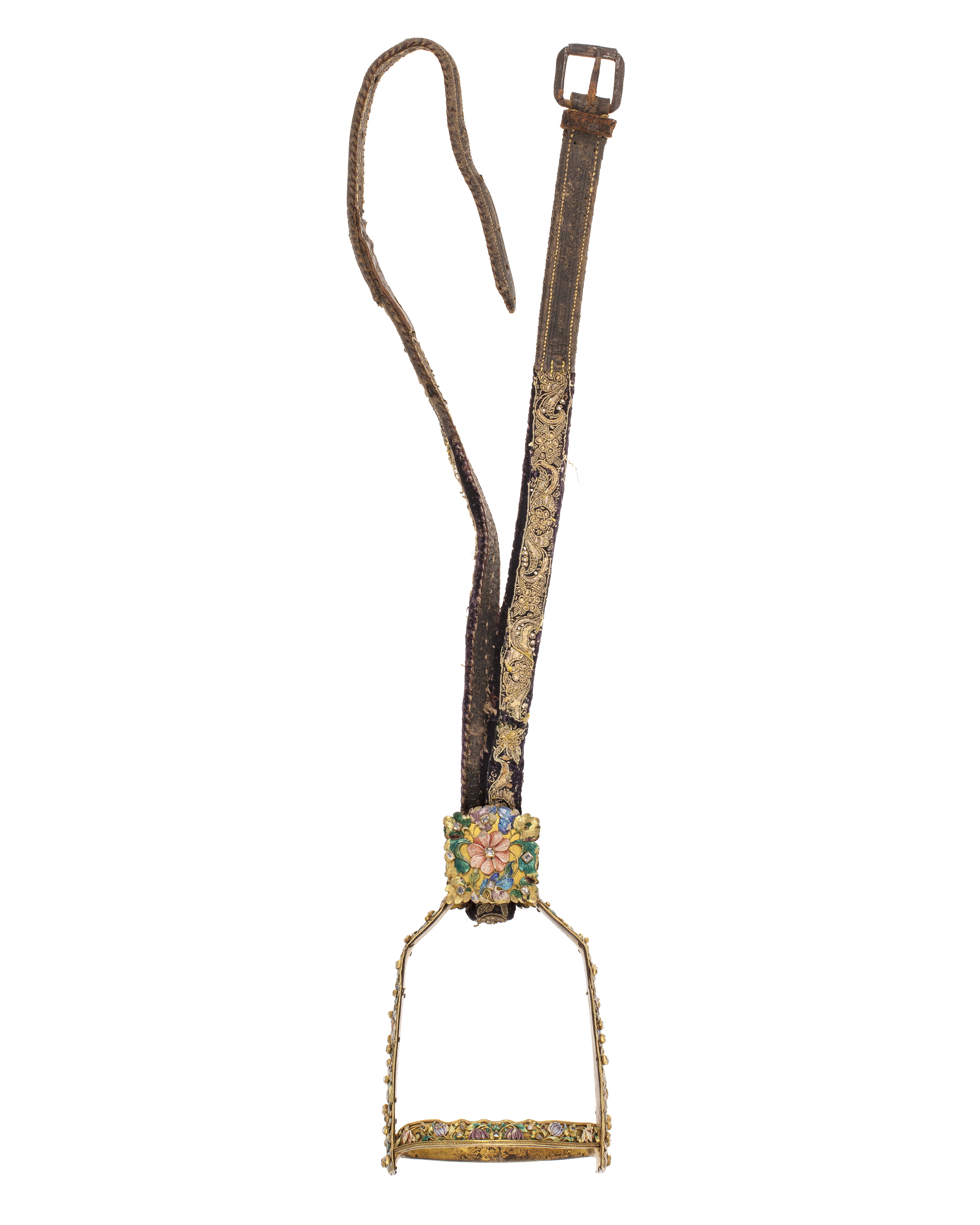 Betselstång af Jern, Complette, med rikt emailleradt Arbete, besatt med Stenar, hvarå finnes Två stycken Pucklor, samt 3 st Rosetter ,befinnes på Betselstången 125 st diverse Stenar (tillskrivet 2 stenar brista, afskrifne År 1822)