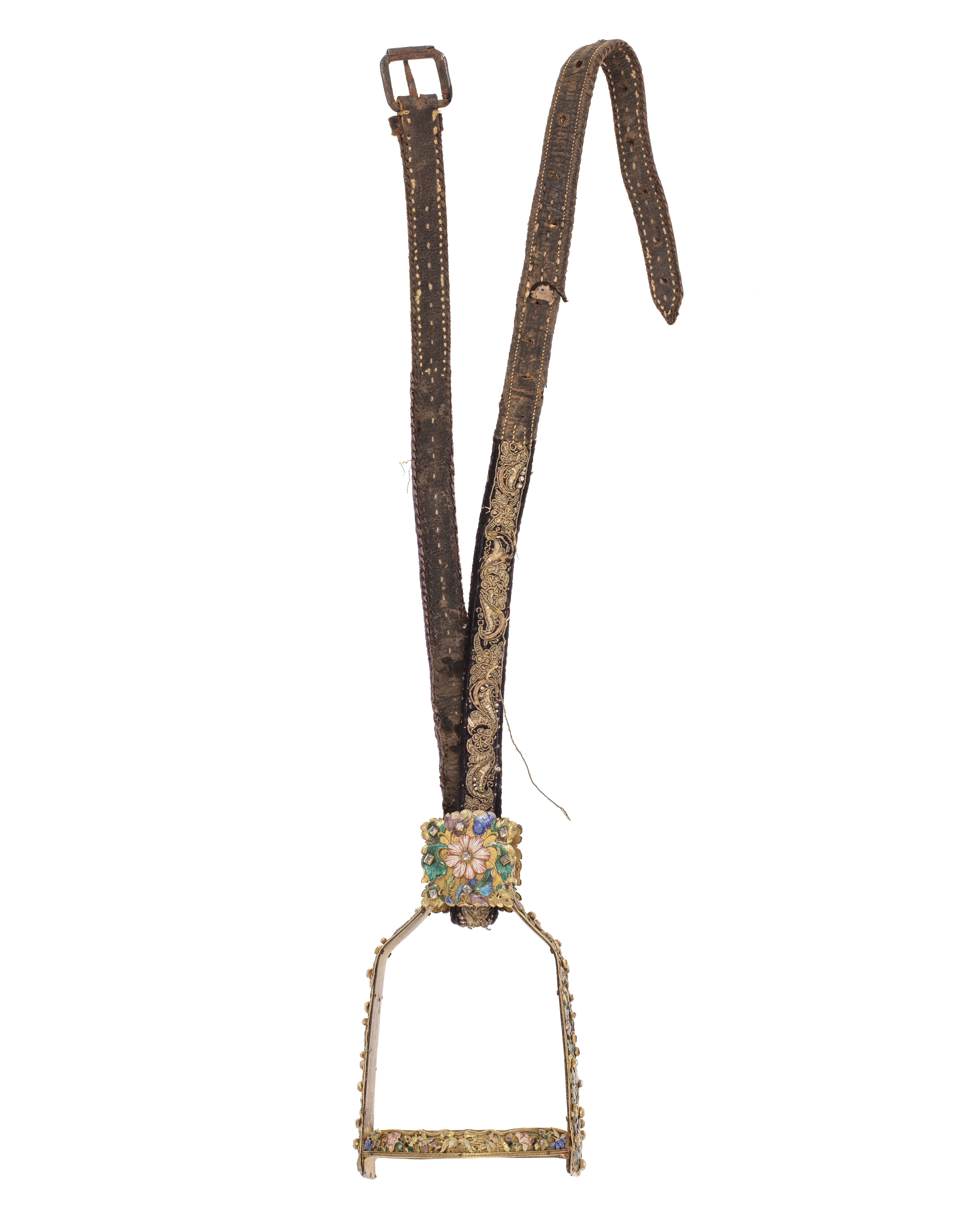 Svankremmen i 3ne delar, rikt broderad med Guld och Pärlor med 2 st Söljor emaillerade, besatte med 12 st Stenar, 3 Tampar emaillerade med däri infattade 14 Stenar (1 Tamp felas)