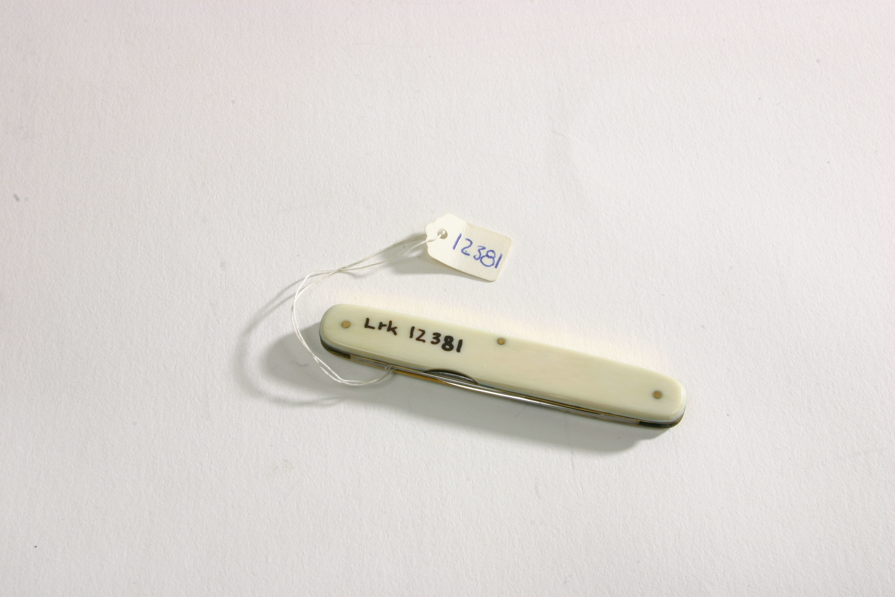 Pennkniv med blad av polerat stål samt sidostycken av elfenben. Fjädern i ryggen är förgylld. Kniven hålles ihop av tre nitar med förgyllda huvuden. På båda blad stämplat: LEUCHARS. Ur resenecessär, begagnad av Gustaf V som kronprins. Gåva 1951 av Gustaf V:s arvingar genom K. Hovmarskalksämbetet.