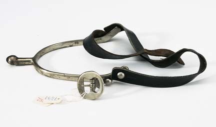 Sporre av försilvrad vitmetall. U-formade skänklar. Kort, rak hals, ansvälld i ytteränden. Klinga i form av rund, slät trissa av stål. Skänkelns ändar med dubbla, kulformiga knappar på hals samt på ena sidan rund sölja.