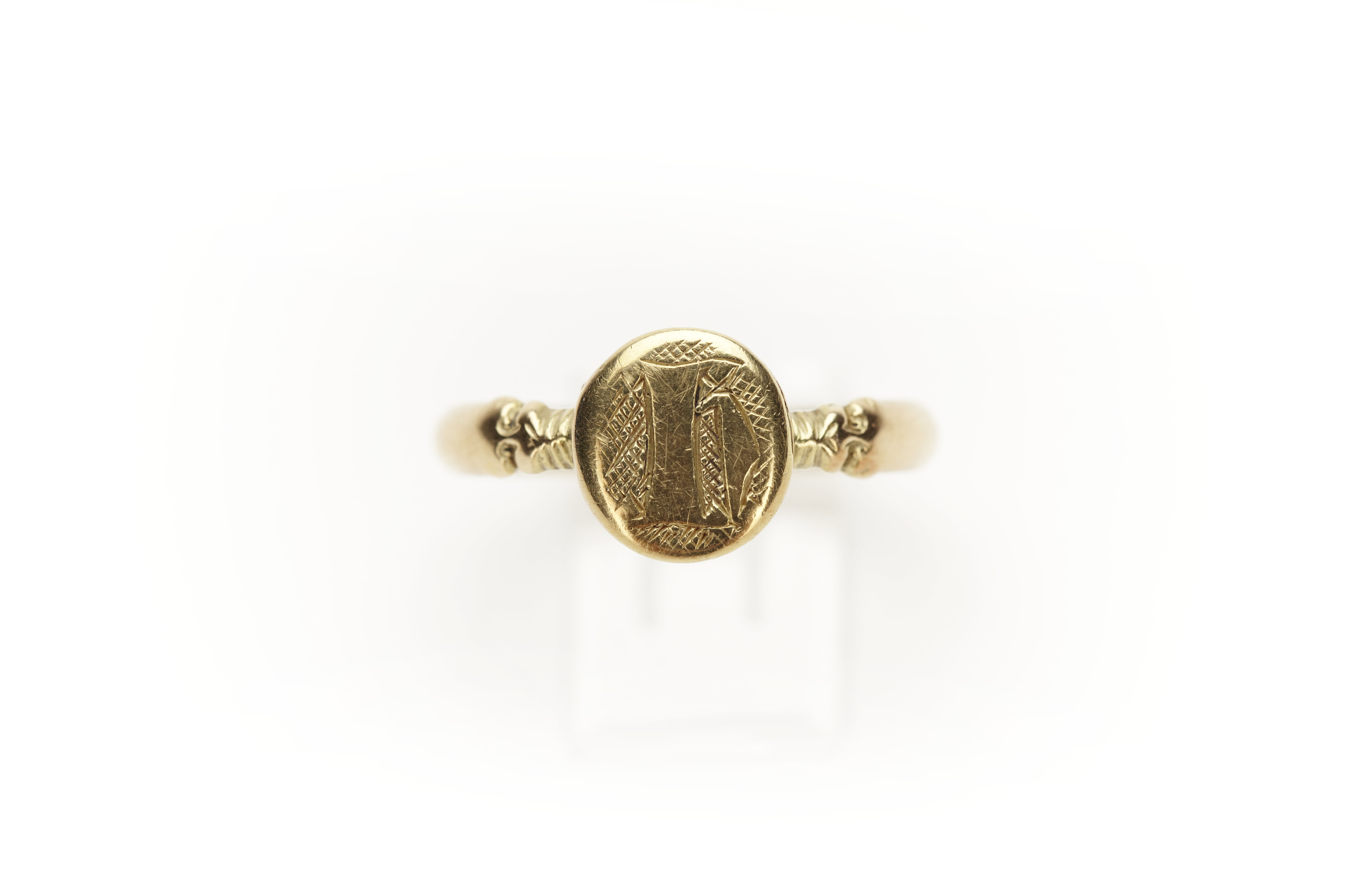 Slät ring av guld med oval klack av guld, varpå graverat "h", minuskel. 13-1400-tal.