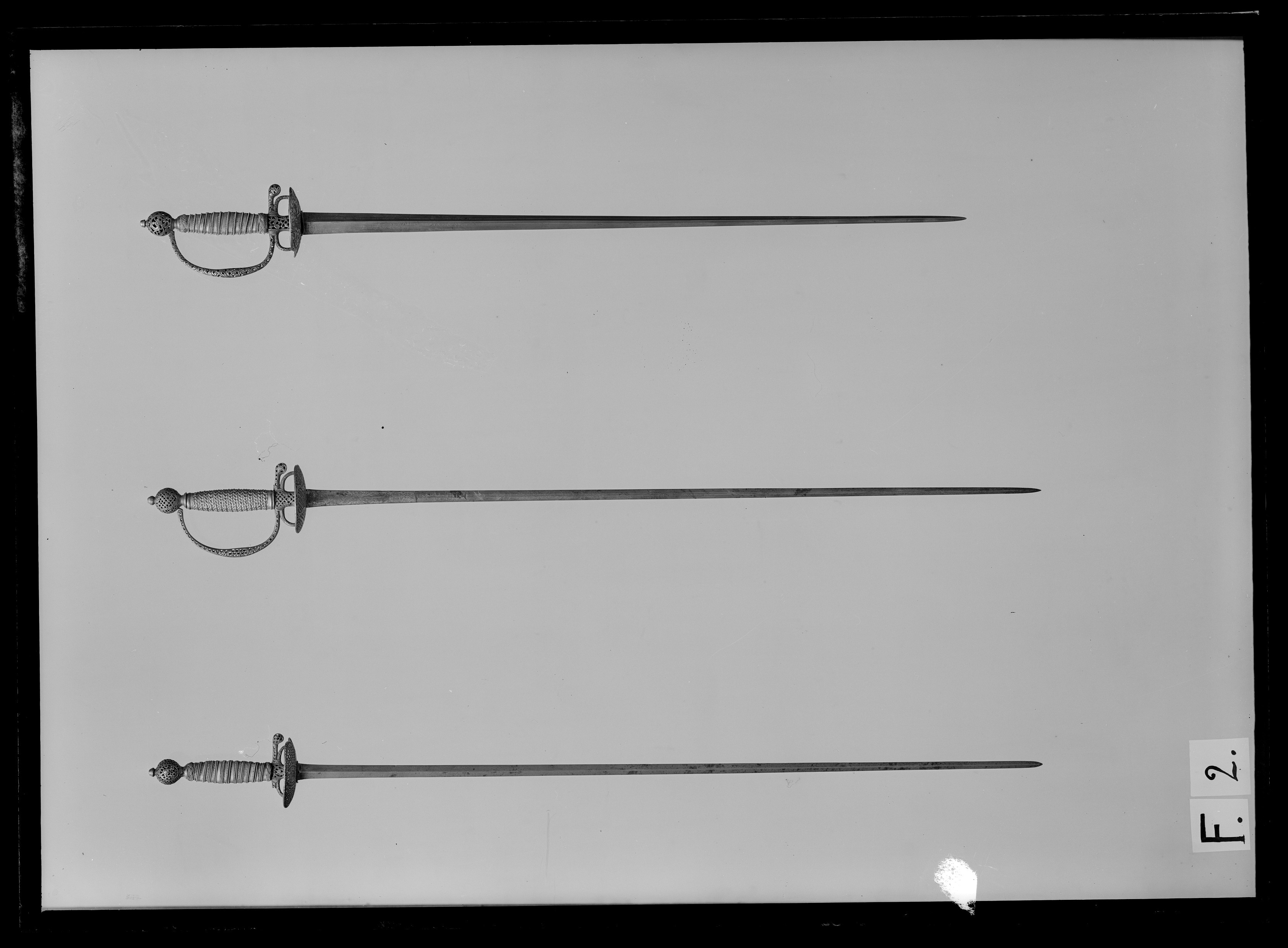 Fäste av stål med i sin helhet fint genombrutet rultmönsteroch med bårder av bladrankor. Handbygeln avbruten (förkommen).På ut- och insidorna av den rundade knappen, krysset och och båda de njurformigt formade parerplåtarna en rundoval medaljong, vari ett genombrutet motiv av en blomma, omgiven av blad. Medaljongerna omgivna med en bård av tuktade blad. Kavellindning (ej ursprunglig)bestående av förgylld, slät mässingslan med spunnen, förgylld mässingstråd och löst tvinnade, smala trådar av samma material, upptill och nedtill en flätad krans av tvinnad, tunn, förgylld mässingstråd. Klinga rak, tvåeggad, slipad, med mötande, jämnbreda skär. På starka delen spår av etsad ornering, en månskära, en strålande sol och stjärnor.