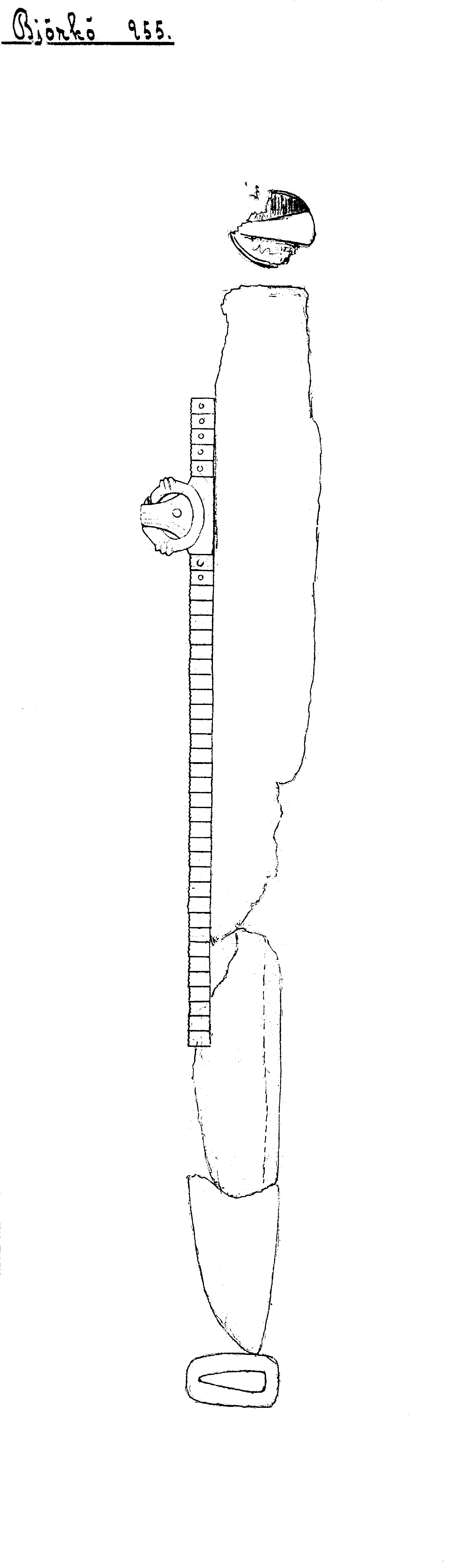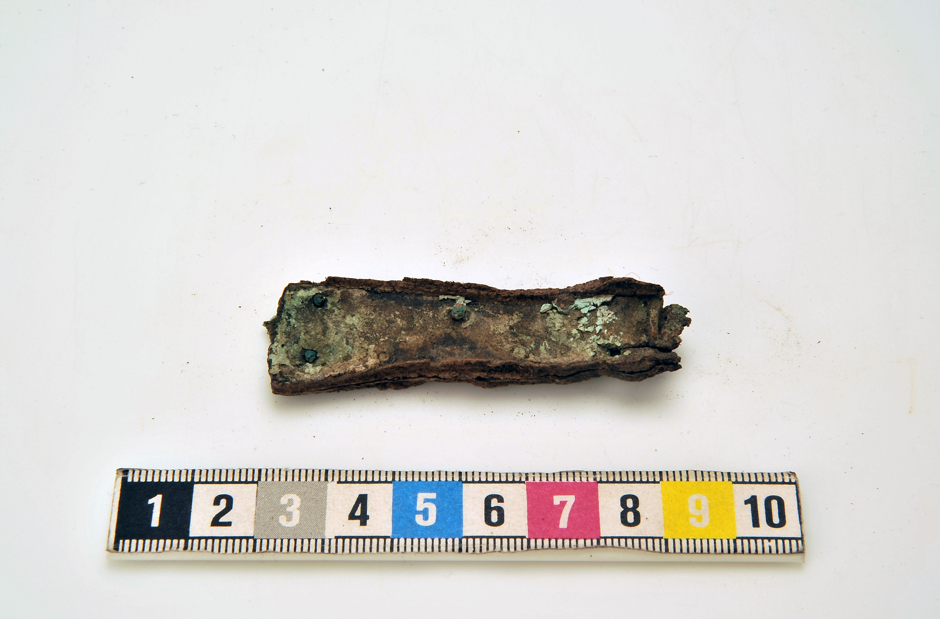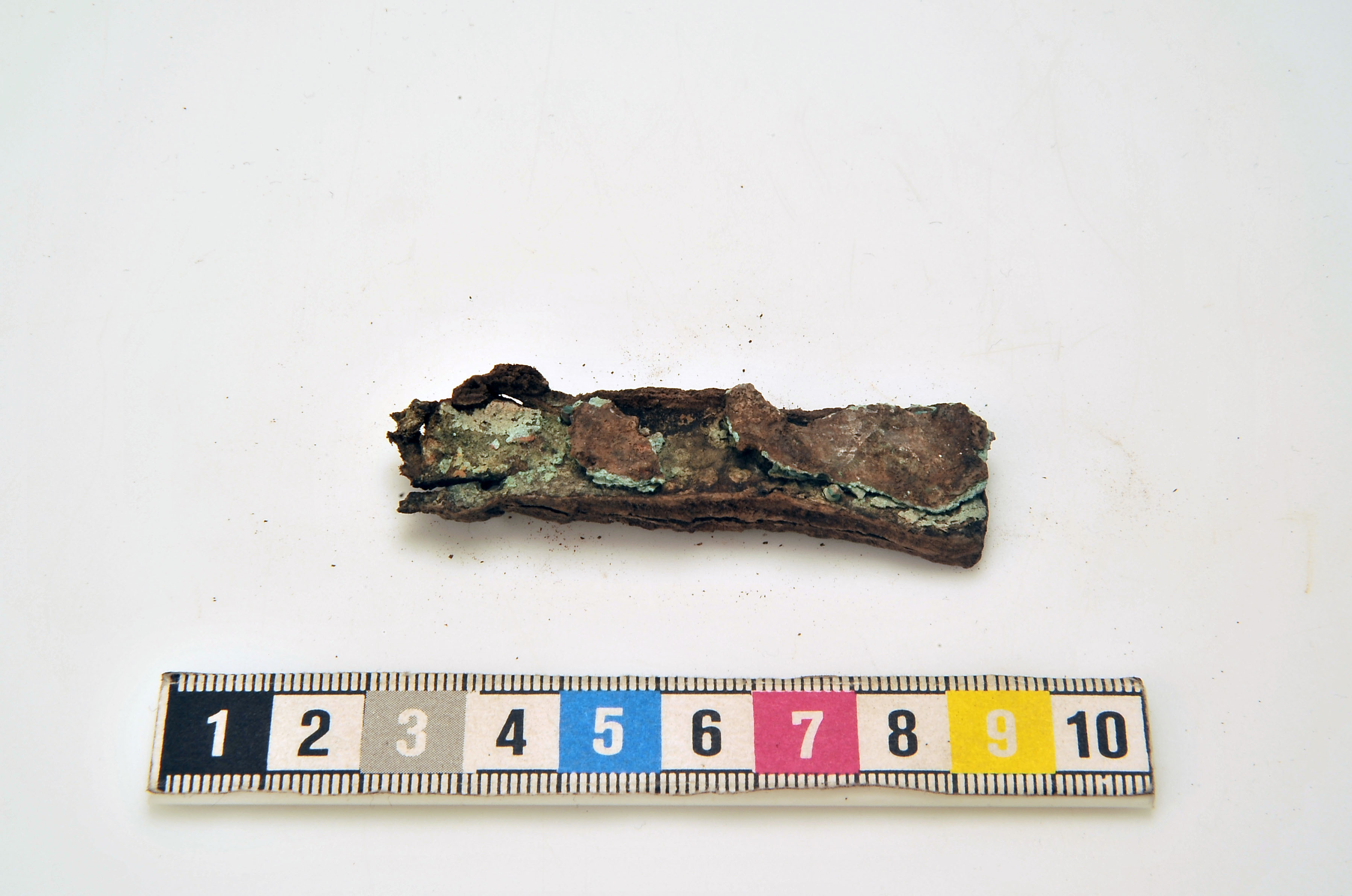 Svårt skadad vapenkniv med delar av skaftet bevarat. en ring av silvertrådar har sannolikt prytt skaftets nedre del. Knivspetsen fastkorroderad i slidans vitmetallbelagda doppsko. Delar av den beslagna slidan, med 3 bärringar, bevarade. Här och var finns vidsittande textilrester.
