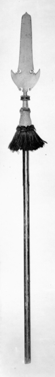 Den punsade orneringen till största delen nedslipad, årtalet synligt. Öppna kronor i riksvapnet. Hals, l: 23 mm, holk, l: 88 mm med rankornament och spår av förgyllning. Brunmålat skaft av furu. På ena sidan inskuret två kryss och OHE, på andra sidan ett E. (Kvast med 142 mm lång och 71 mm bred knopp, klädd med ursprungligen rött, starkt blekt taft, överdragen med gult silkesnät. Nedre krans och frans av rött och gult ullgarn, Wachtmeisters färger.)