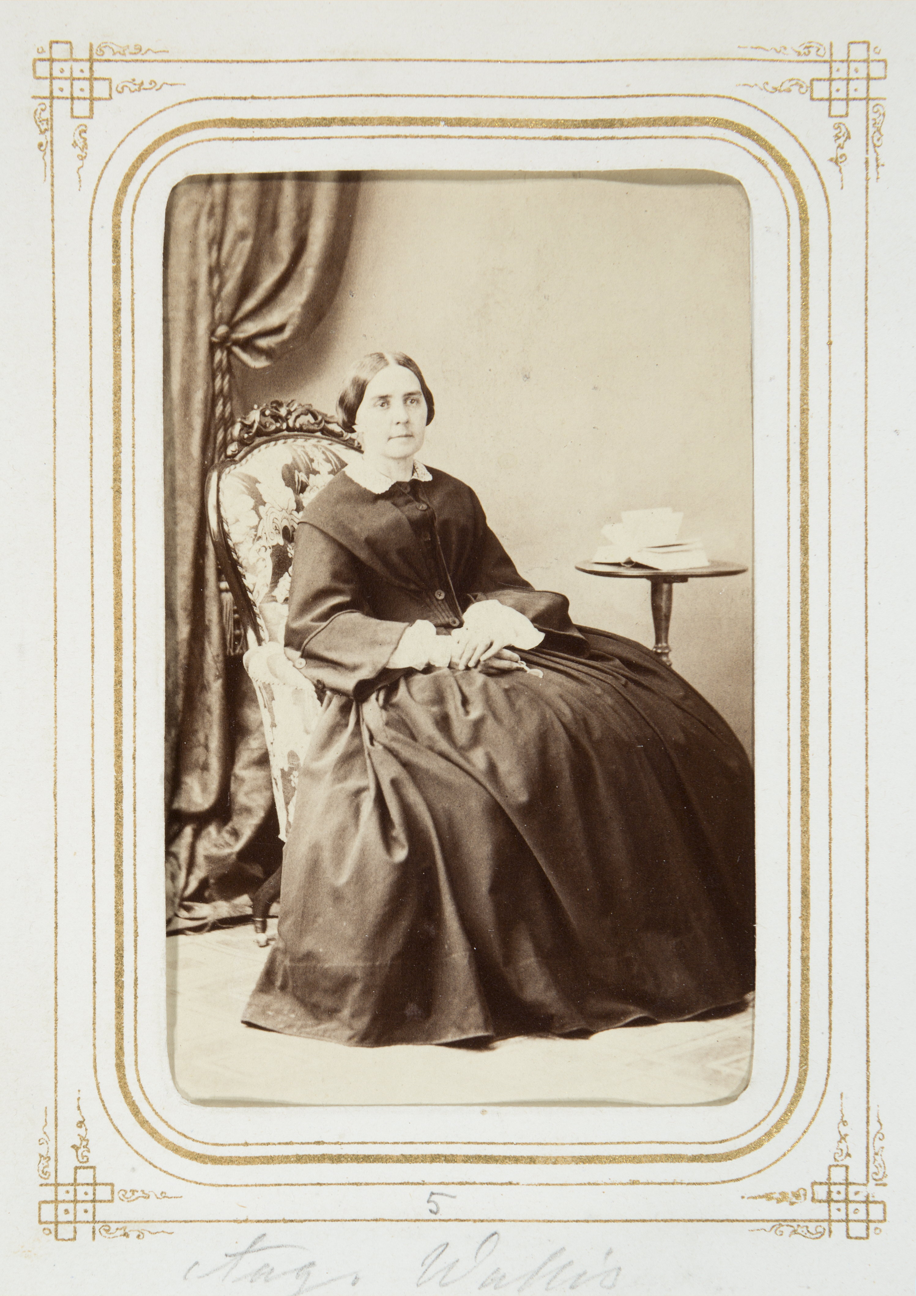 Biografi. Fotografiporträtt. 101 porträtt i album. AUGUSTA WALLIS, f. FORSSELL. Erhållet av Johanna Kempe, f. Wallis.på 1860-talet. 26.5x20,7x4 cm.