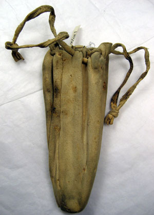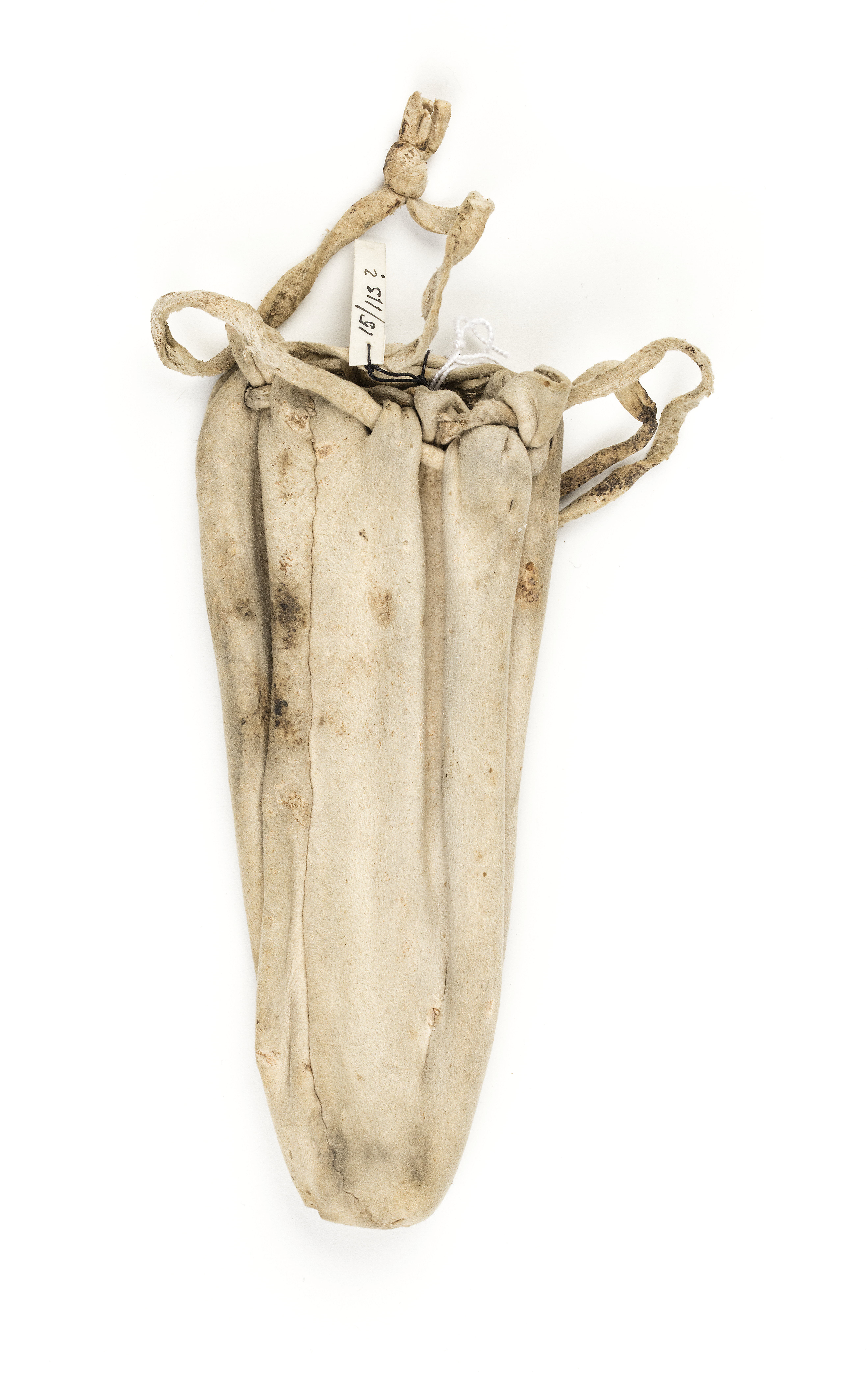 Långsmal, nertill rundad pung av ljusgult sämskat skinn, sydd av två stycken med längsgående söm i sidorna. Upptill två små grepp och en dragsnodd av två skinnremmar sammanbundna i ändarna. Tureholm