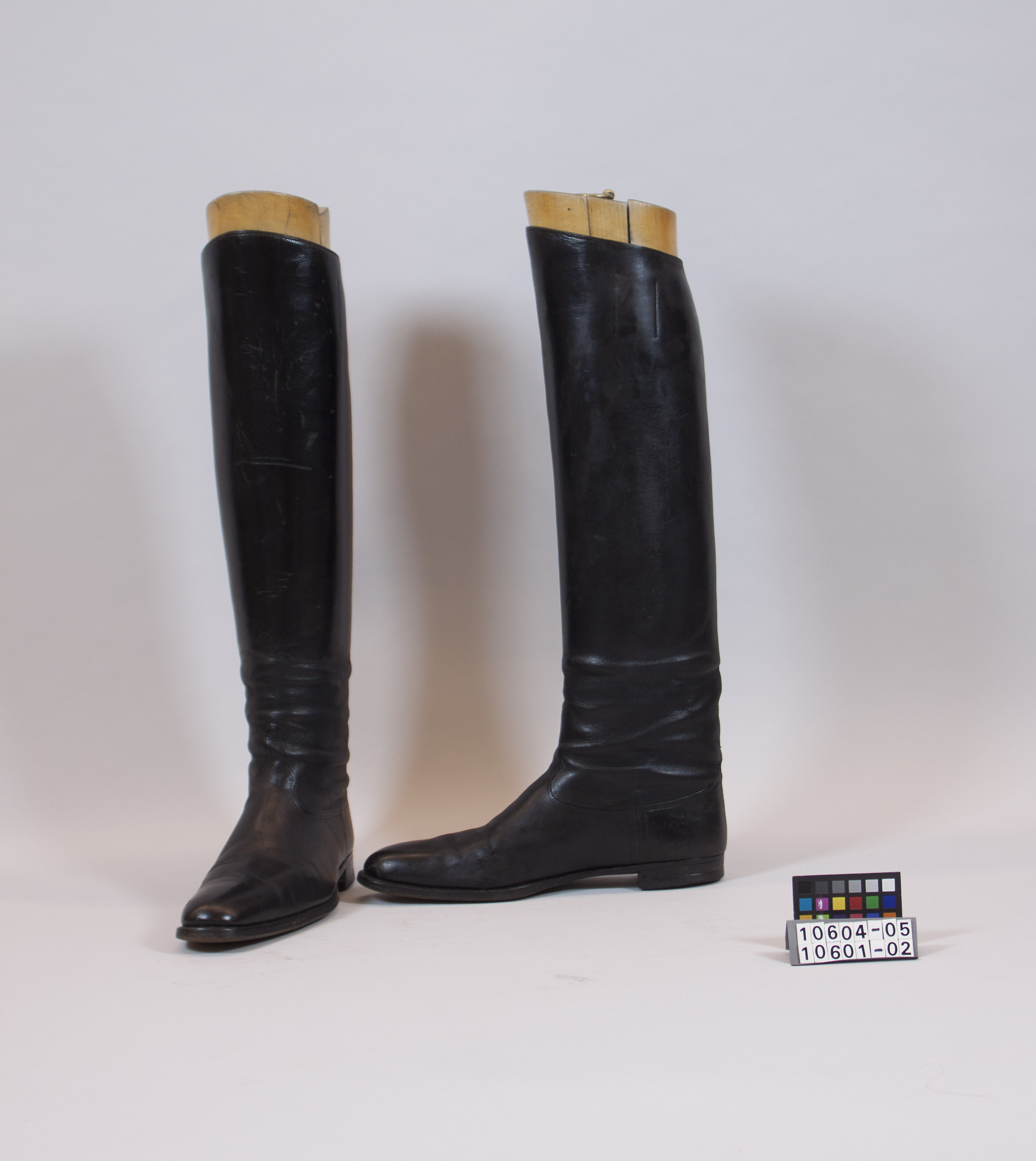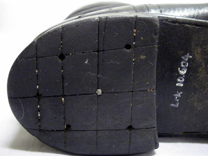 Utvändigt svart (lackerad?) stövel av kalvskinn (?), skaftet tredubbelt, i mitten brunt skinn, foder av ursprungligen vitt skinn. Lädersula med gummiklack med inskurna rutor, sex spikhål. Invändigt i skaftet två stroppar av brunt skinn.