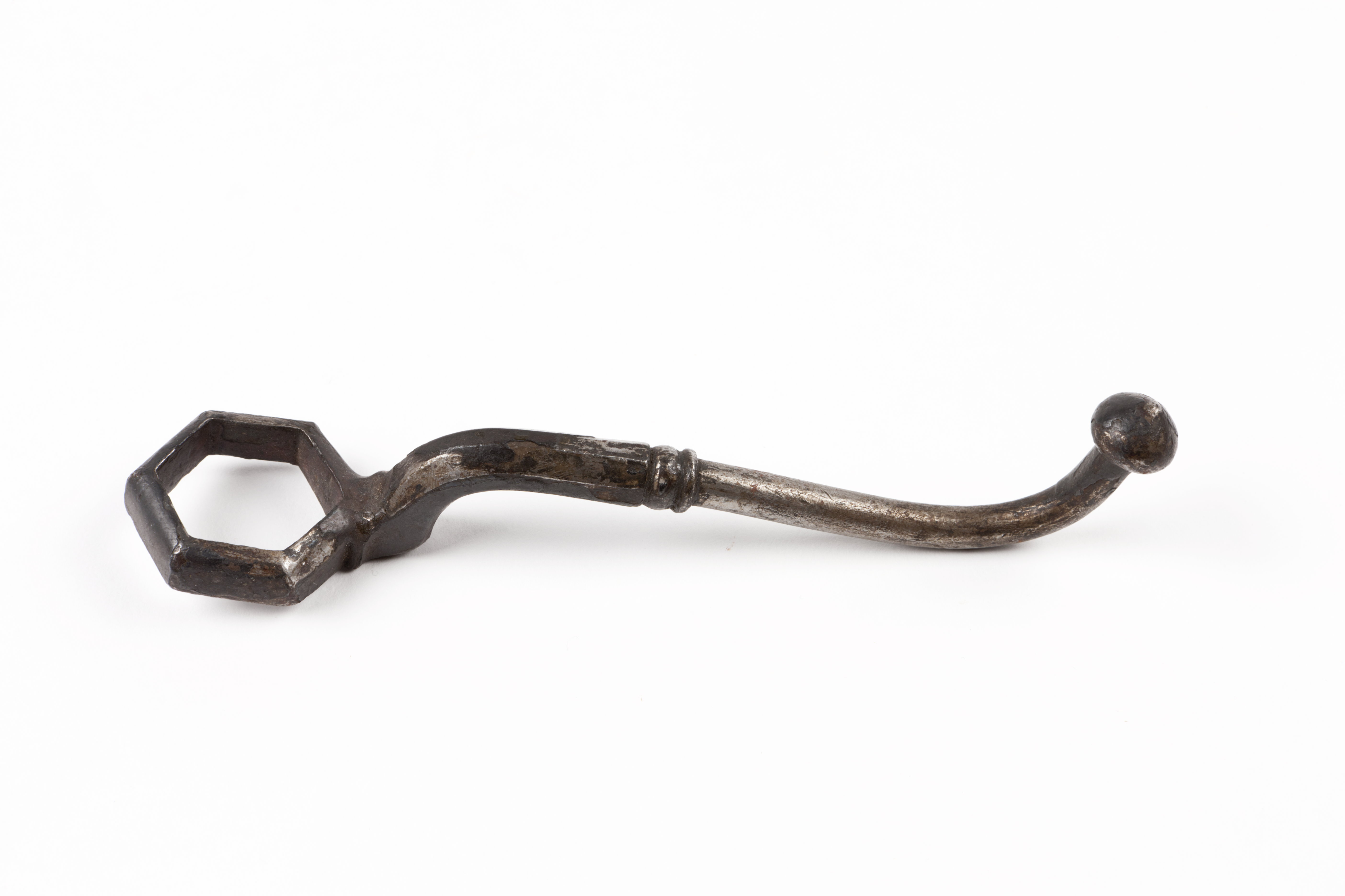 För sexsidig mutter, diag 27,8 mm. S-formigt böjt skaft med vulst, ena hälften åttsidig, andra rund. Spetsig knopp.