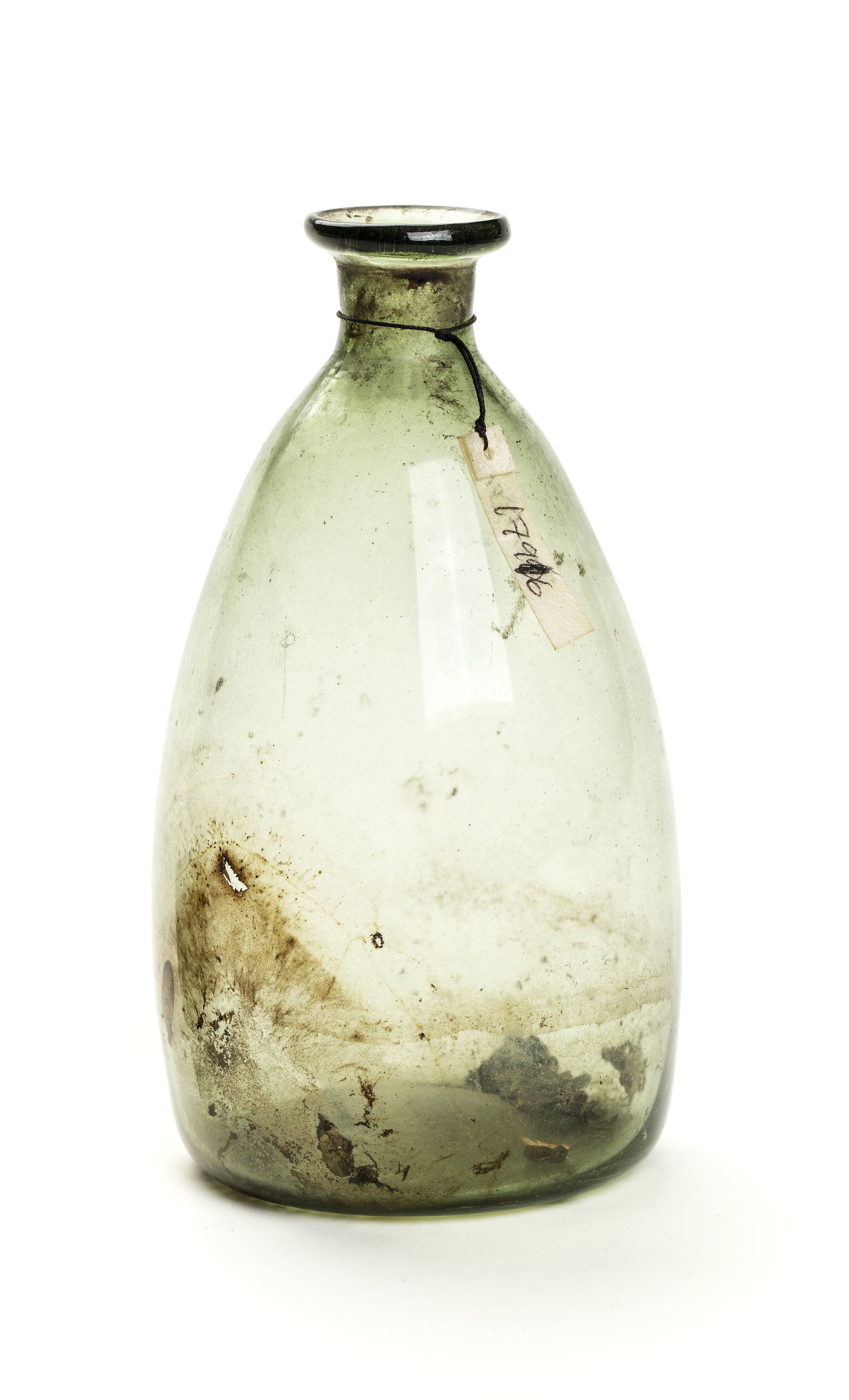 Flaska av grönaktigt glas. Formen konisk och rundad, upptill med kort cylindrisk hals och trattformig mynning, utstående ca 5 mm. Bottnen svagt välvd med i mitten tydliga märken från tillverkningen.
