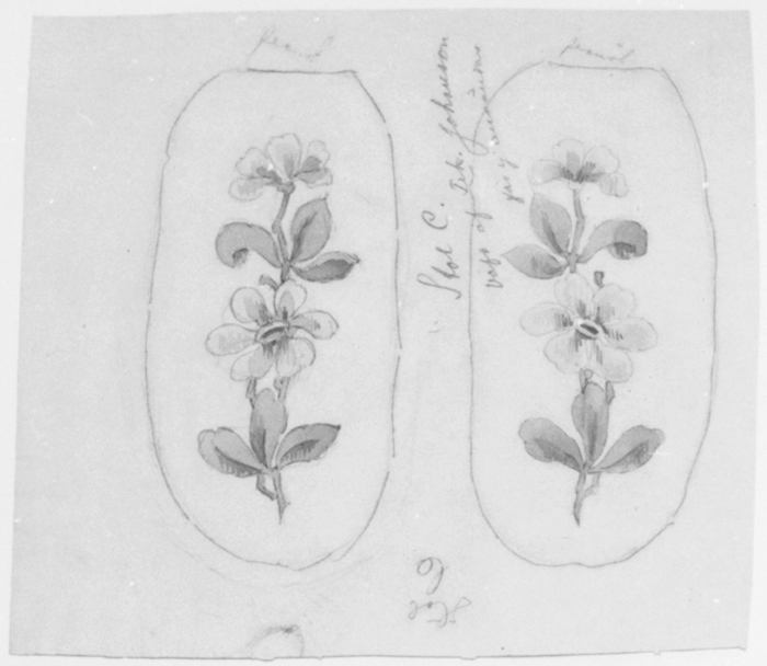 MÖNSTERFÖRLAGA, till möbelklädsel. Utförd i akvarell på papper, utgörande armstöd till länstol, inv nr Gr VI:II:A.a.8 (för beskrivning se Hallwylska samlingen, GR VI, text, .2 73 f.f.) Motiv med blomranka och blad på ofärgad botten. Påskrift: "Stol C väfvd af Frk. Johansson. Får ej användas. Framåt" Mått H 28,4 cm B 31,8 cm Gåva 1943 av arkitekt Gustaf Clason (se protokoll 54 º 4)