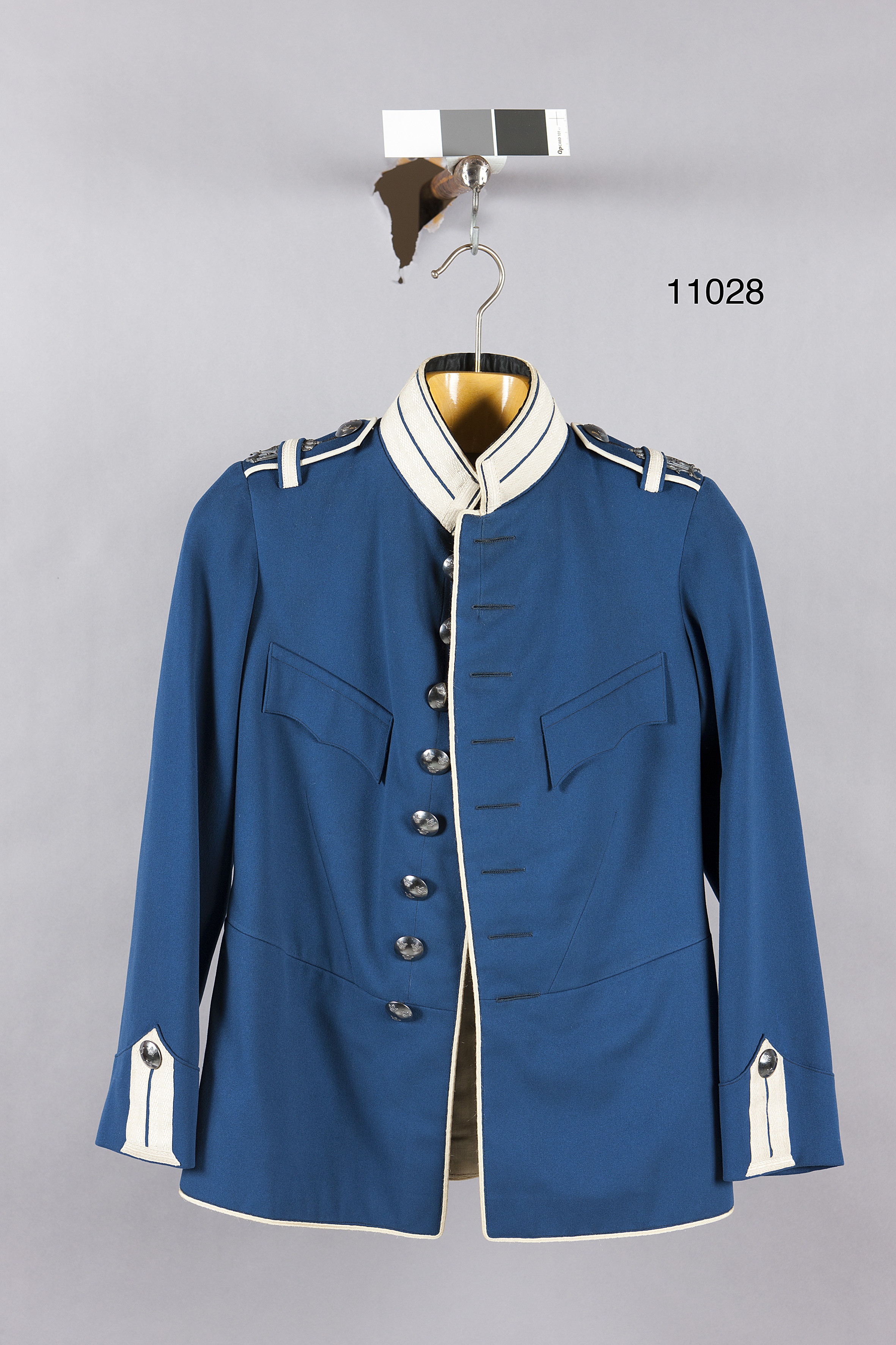 Vapenrock av ljusblått kläde, enkelradig, tillskuren med livsöm. Ståndkrage med knapphål av vitt redgarn. Hela rocken kantad med vit passpoal. Åtta silverknappar d: 23 mm med tre kronor samt på baksidan "SPORRONG & CO, STOCKHOLM". Två snedställda bröstfickor. Axelklaffar med vit kant, silverknapp samt OII:s namnchiffer av silver. Hällor för epåletter. Ärmuppslag 110 mm med knapphål och silverknapp. Skört med fyra knappar samt två dolda fickor. Foder av vitt linne med matelasserat liv, en innerficka samt spänntampar i midjan.