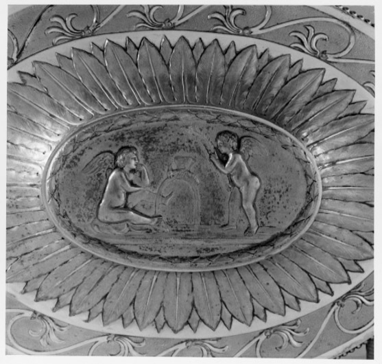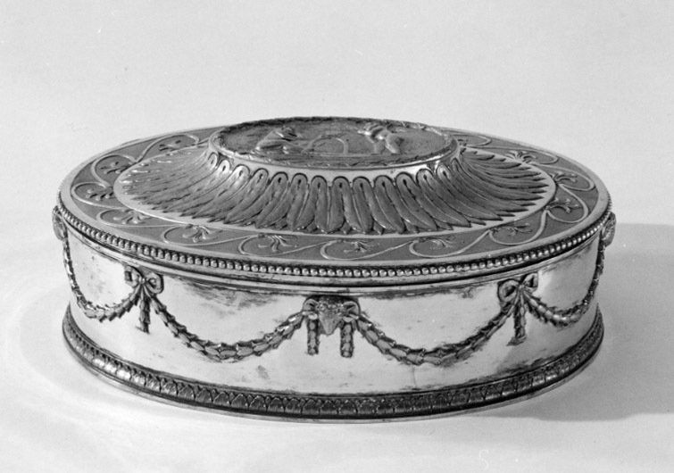 Oval ask med lodräta sidor. Pålödd dekor i form av 4 gumshuvuden och 4 bandrosetter placeradeväxelvisciselerade. Ovalt lock fäst vid askens ena långsida med ett72 mm långt gångjärn. Ovalt förhöjtmittparti med lagerkransomsluten figurscen: i mitten en bågform med fjäril på, t v en sittande putto, t h en stående putto med en fjäder (eller blad?) i handen. Runtom koncentriska friser medbladstav, löpande hund med palmettspetsar, ytterst en pärlstav. Asken är av förgyllt silver med blanka och matta partier kontrasterande mot varandra. I bottnen ärristat "111 1/2" (avser lod) och 4 stämplar inslagna i rad: 1) Smith och Sharps fyrpassformadestämpel med DS RS, 2) Londons krönta leopardhuvud, 3) Londons lejon, 4) årsbokstaven b (1777). Sammastämplar på lockets undersida.